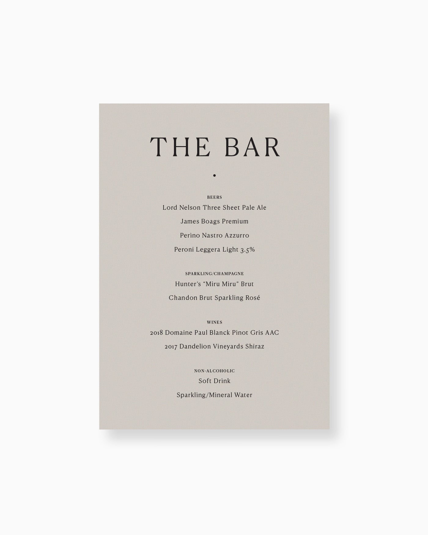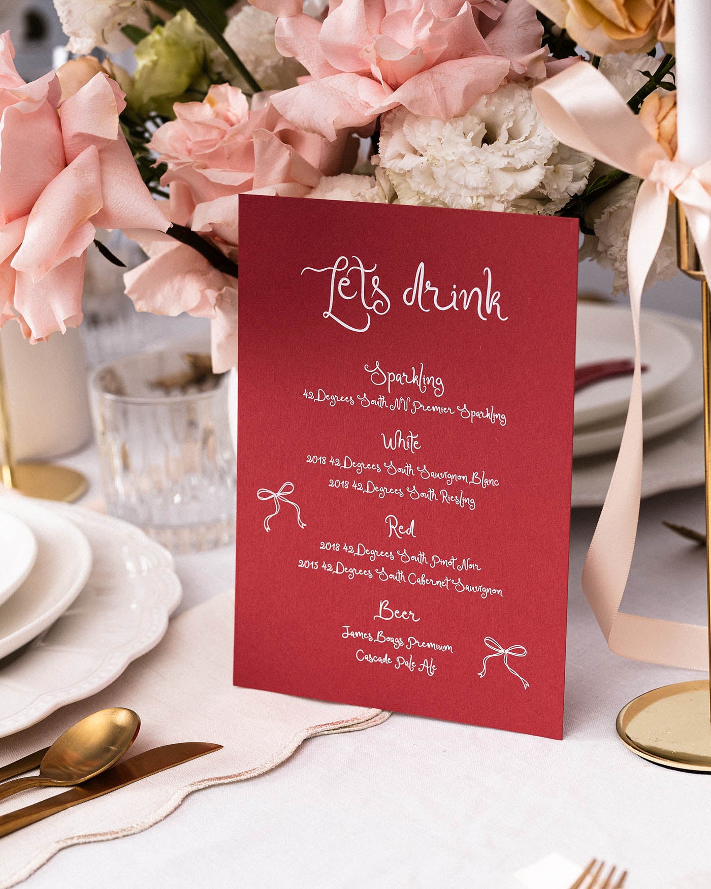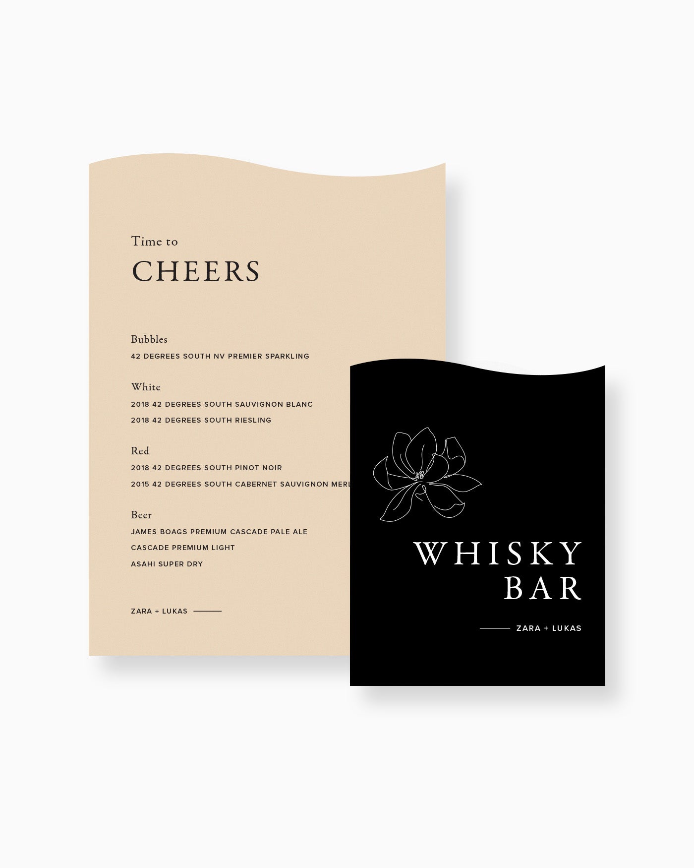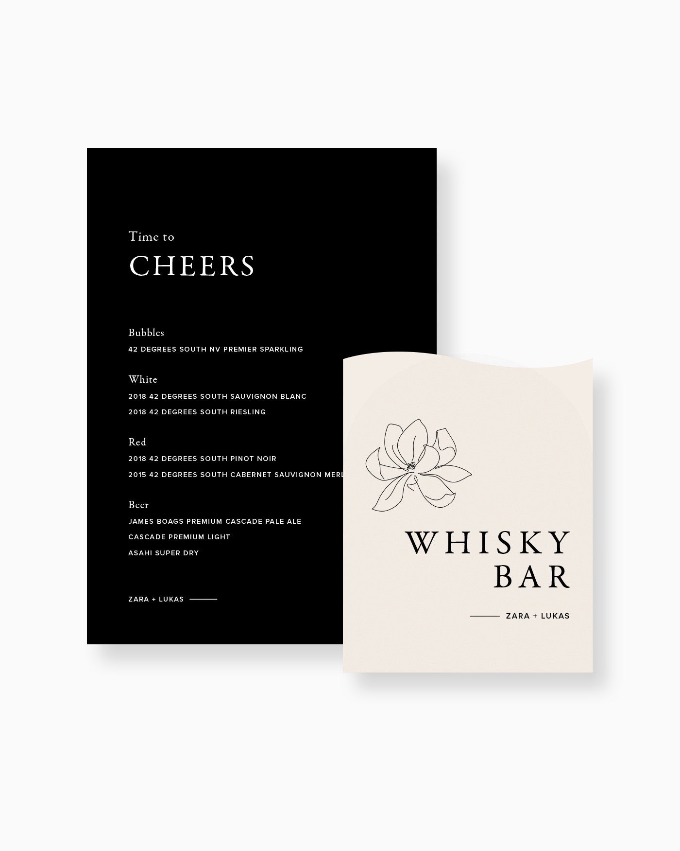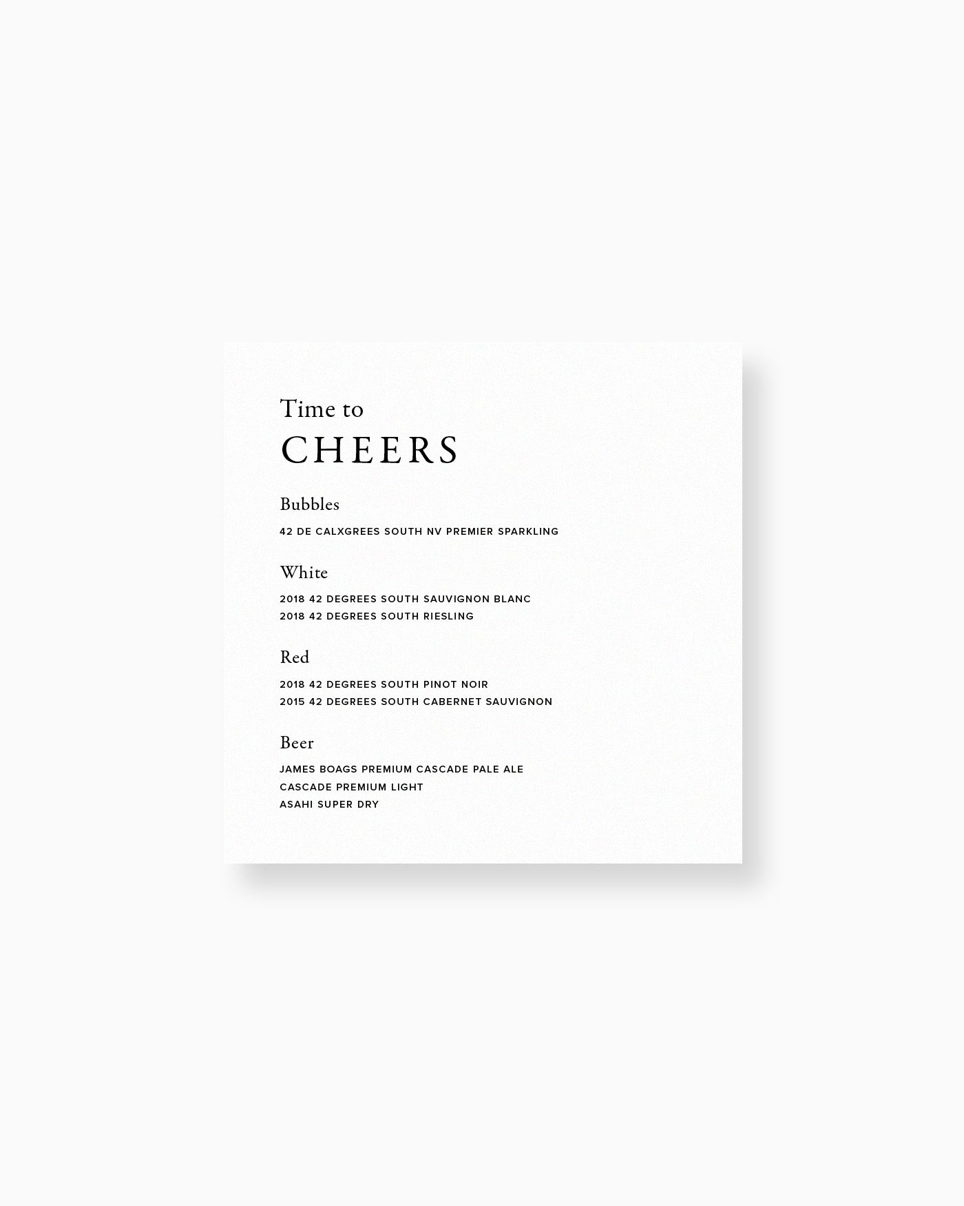 Available in printed card or foam board, our small signage includes table numbers, group menus, bar menus, gifts, guest book, photo booth or other A5 signage pieces you would like to display at your event.