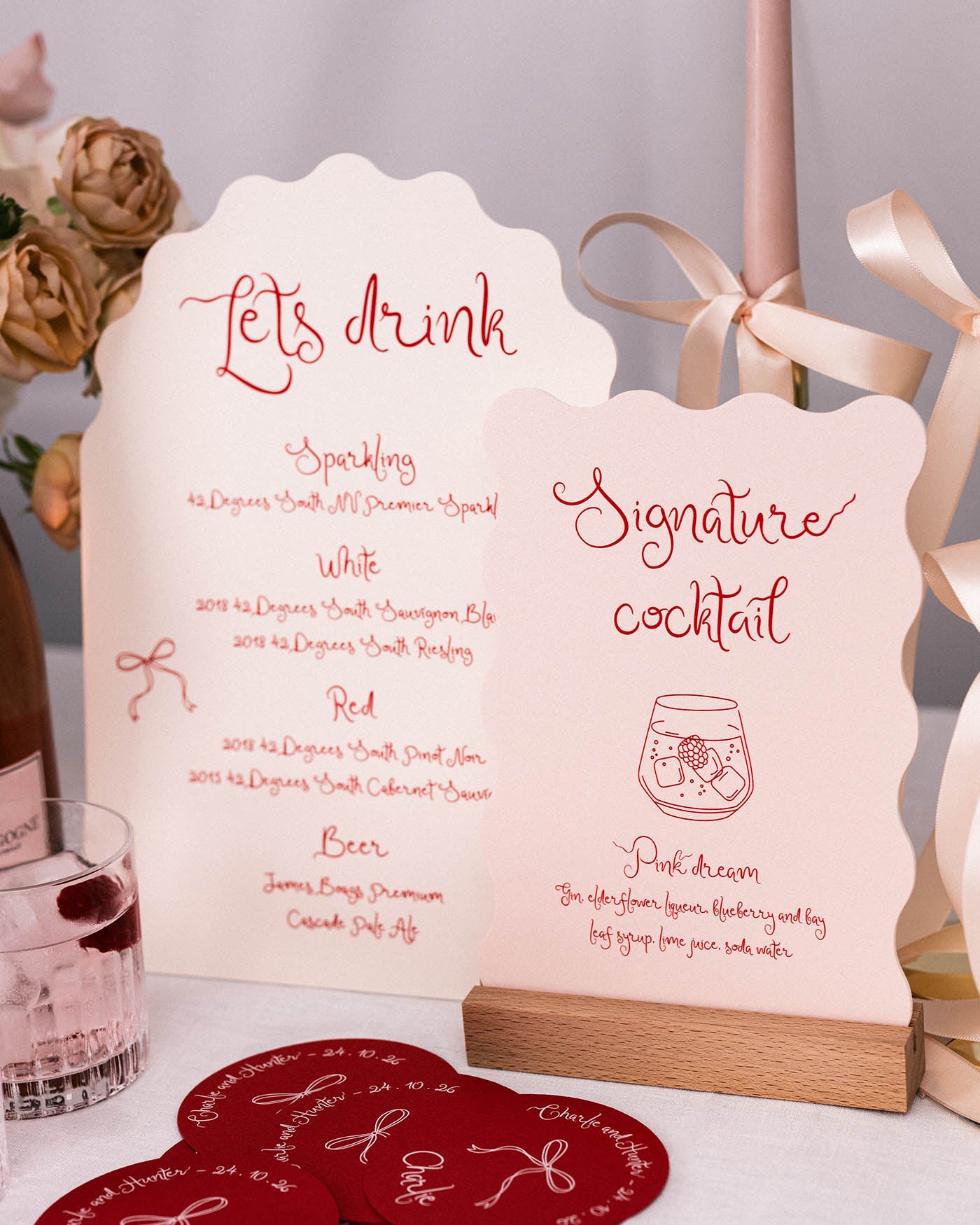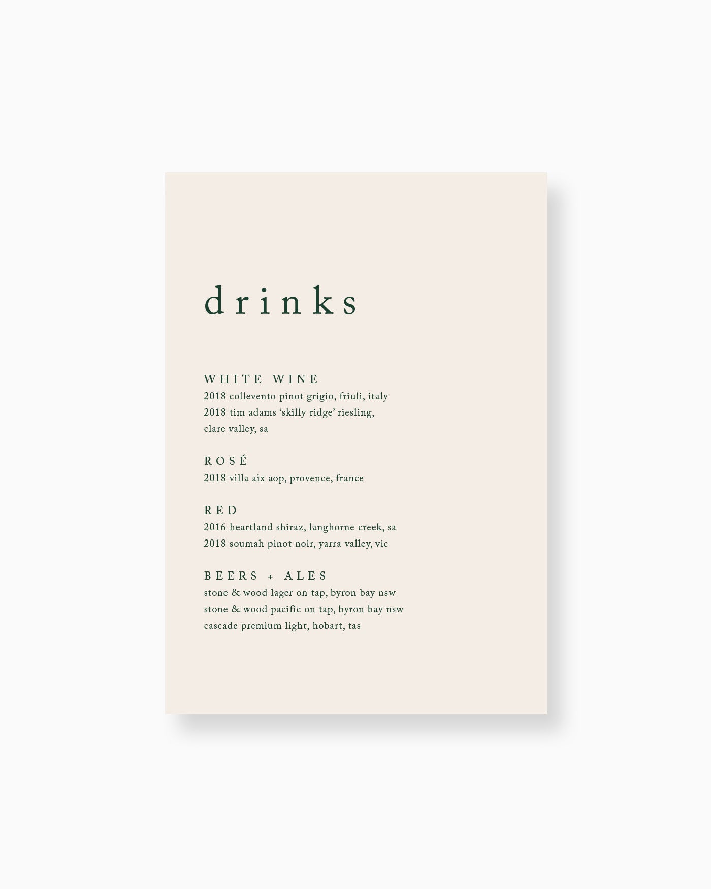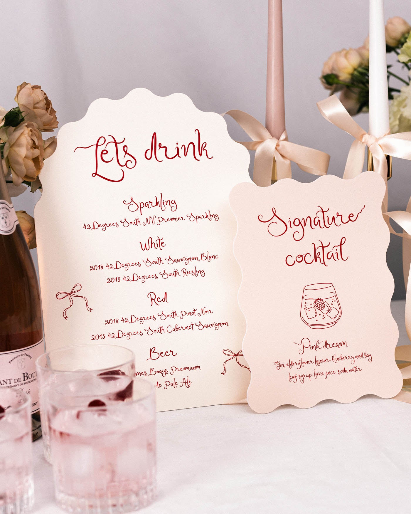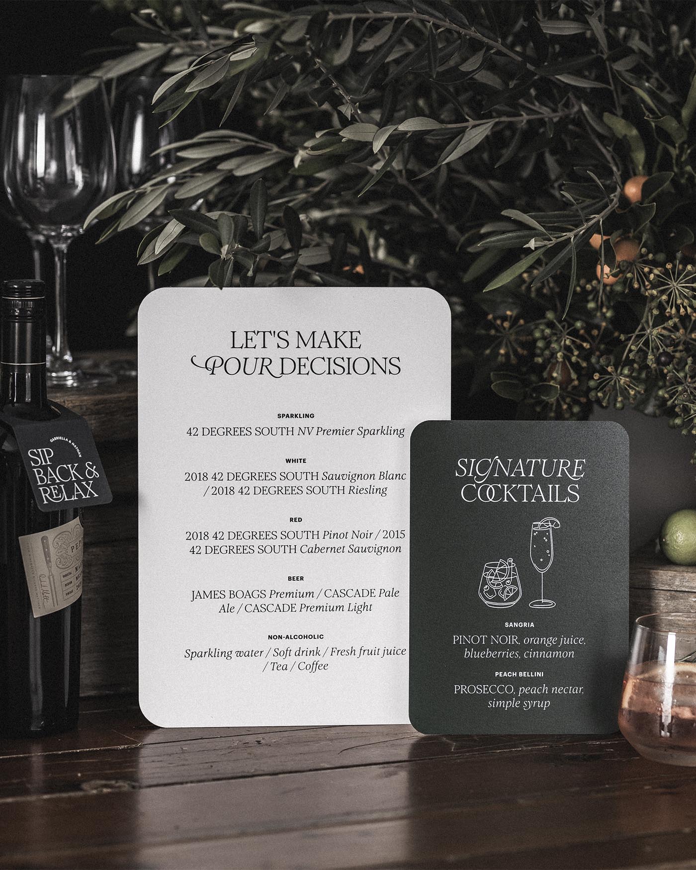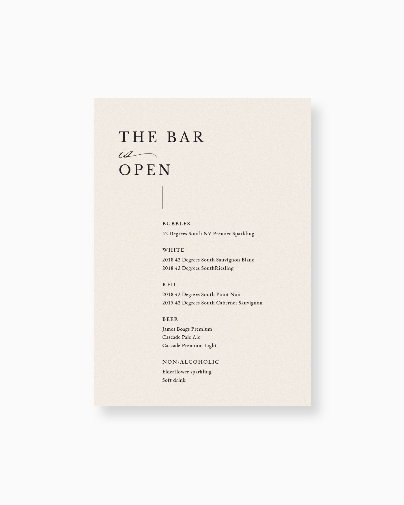 Available in printed card or foam board, our small signage includes table numbers, group menus, bar menus, gifts, guest book, photo booth or other A5 signage pieces you would like to display at your event.