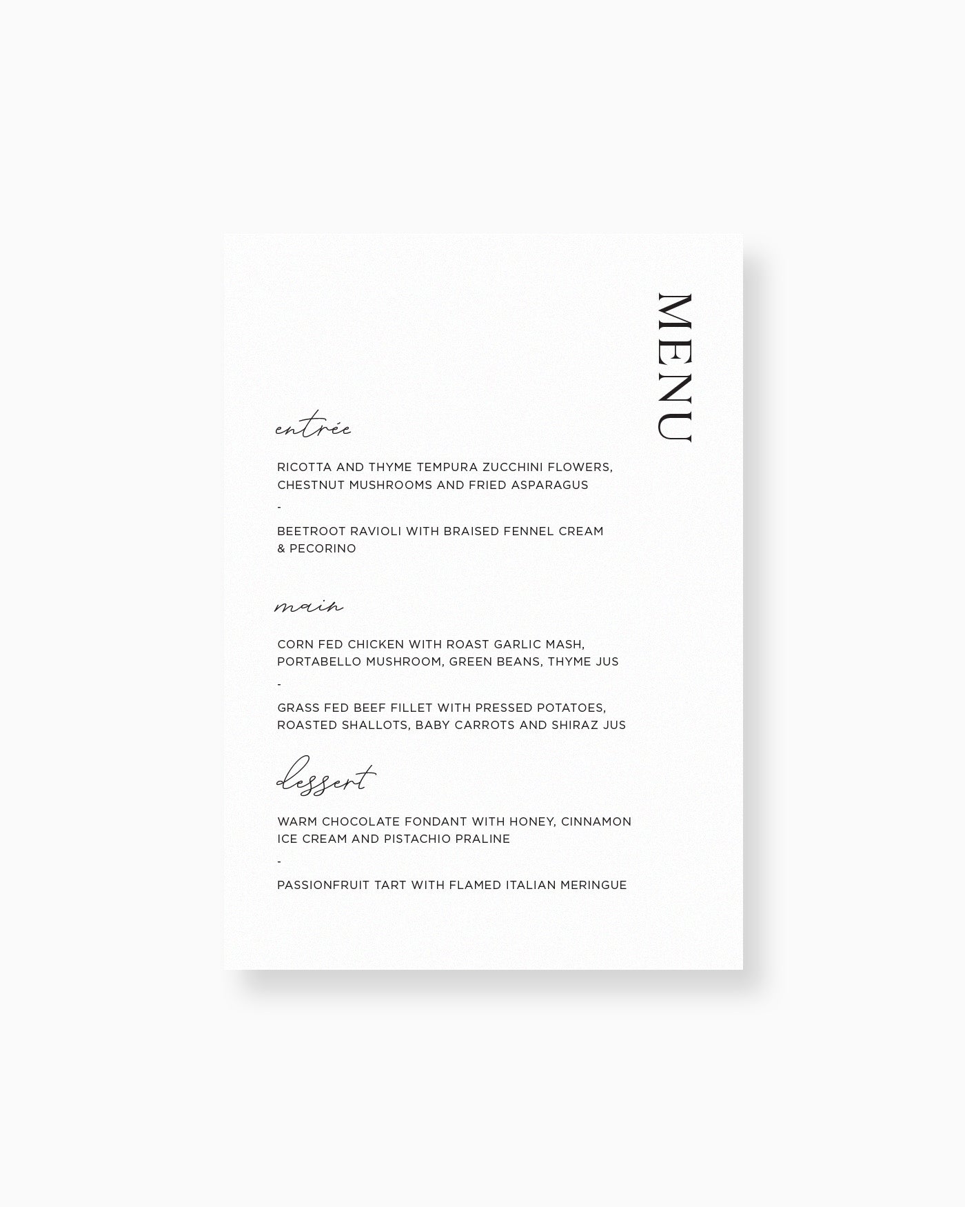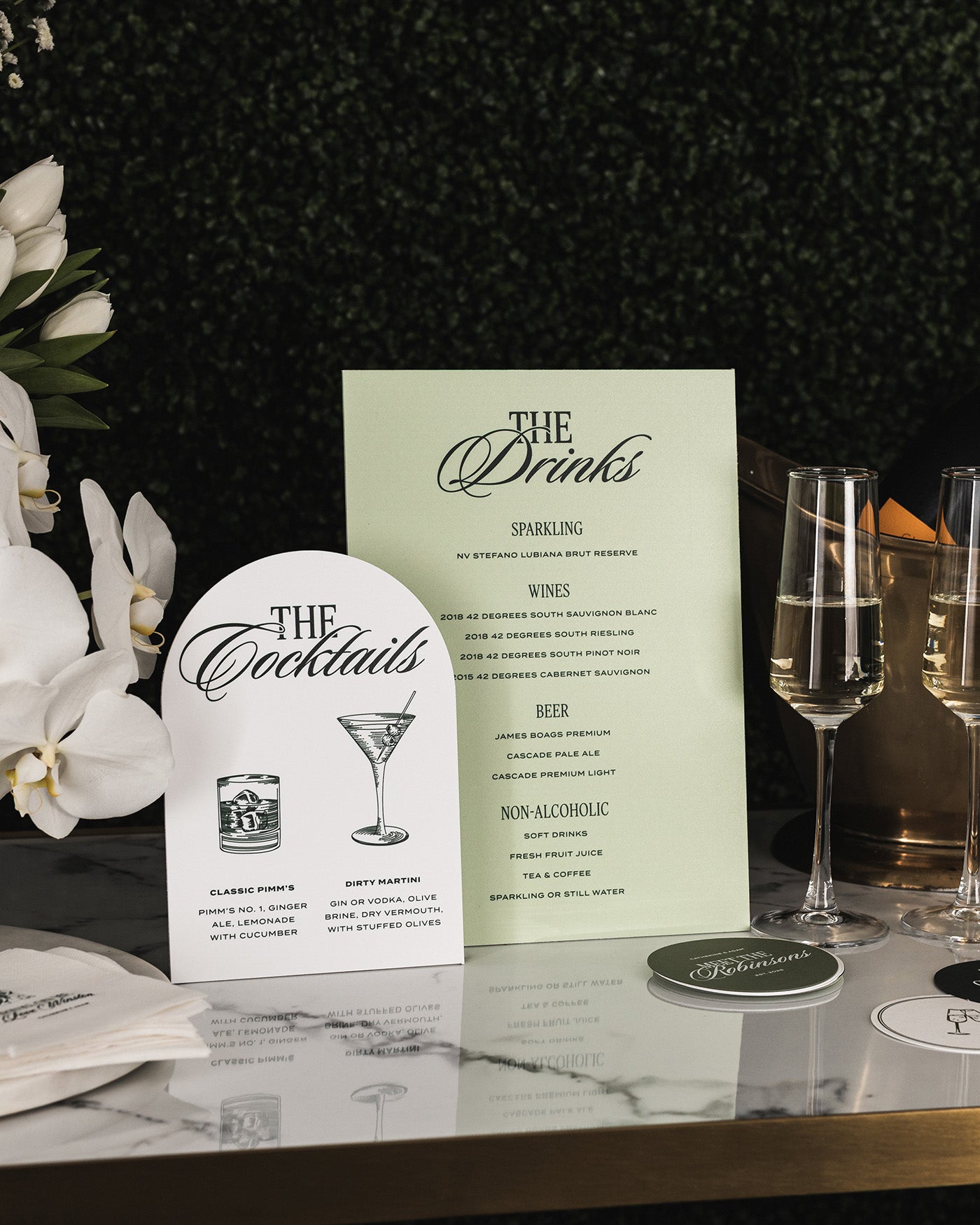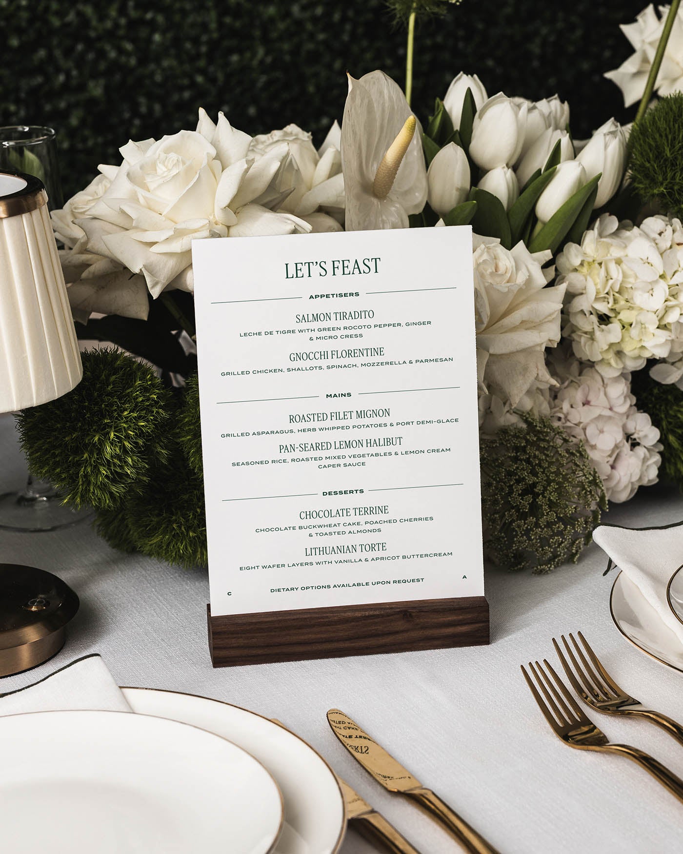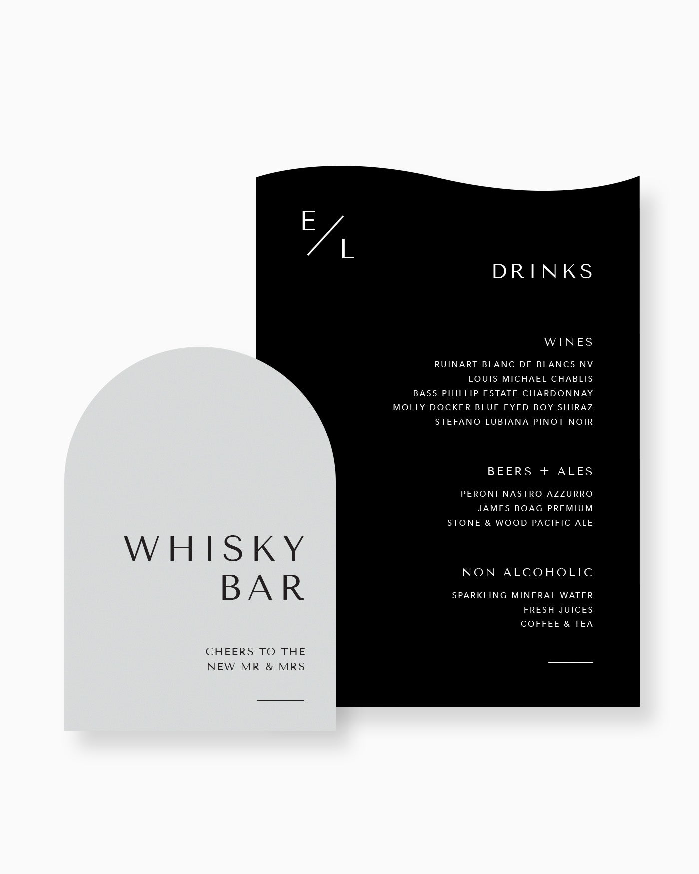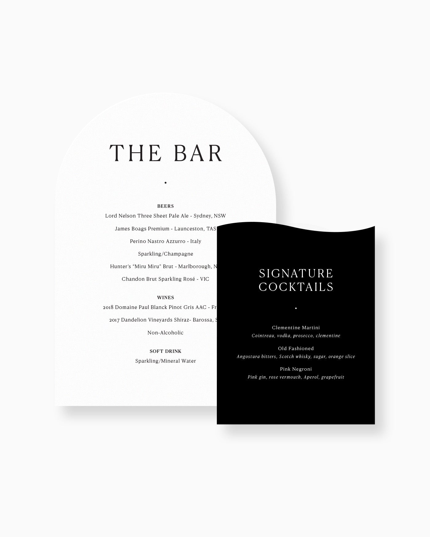 Available in printed card or foam board, our small signage includes table numbers, group menus, bar menus, gifts, guest book, photo booth or other A5 signage pieces you would like to display at your event.