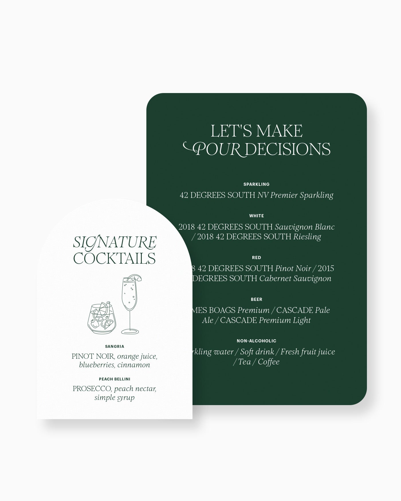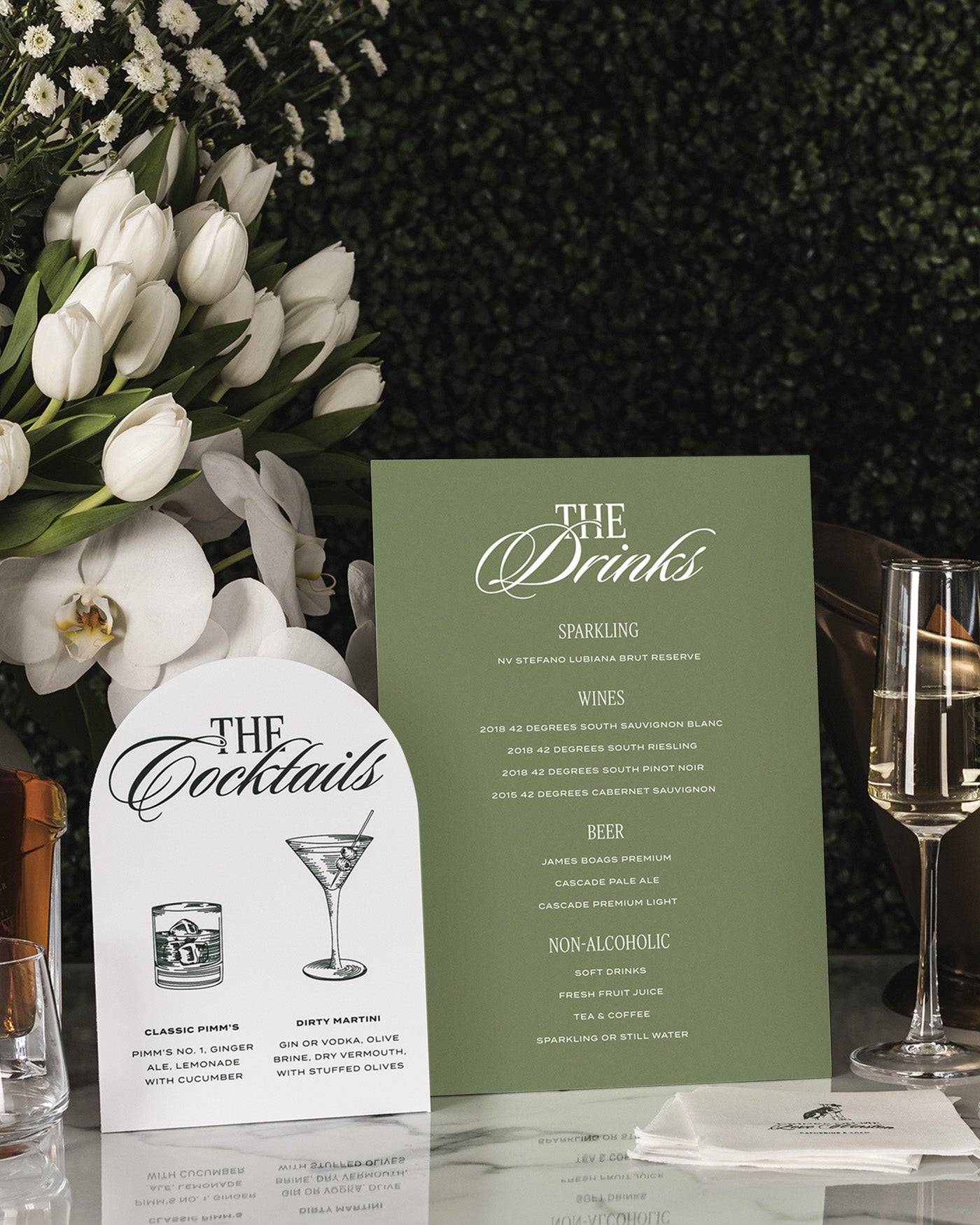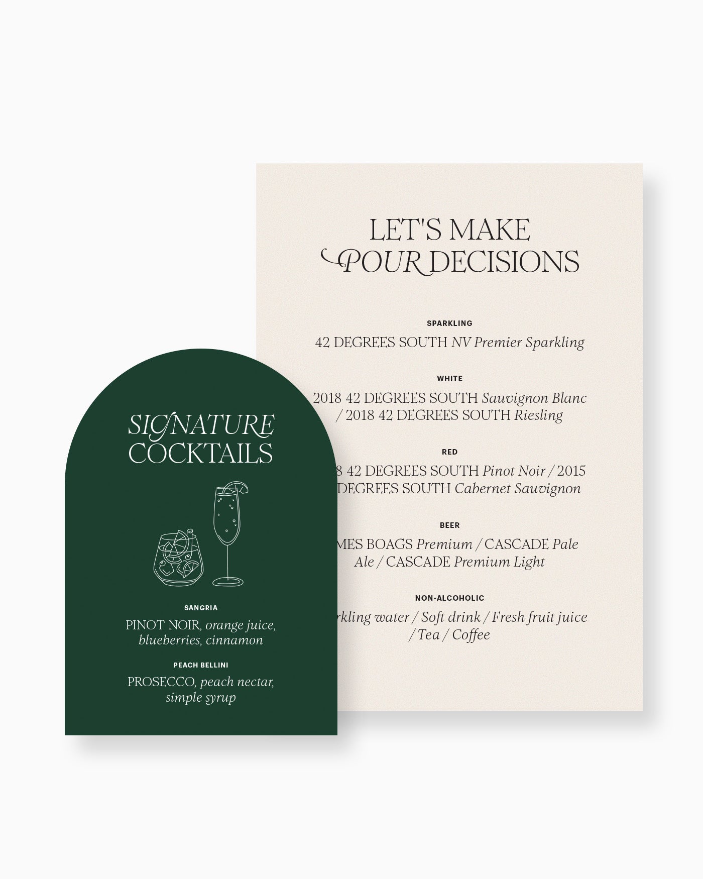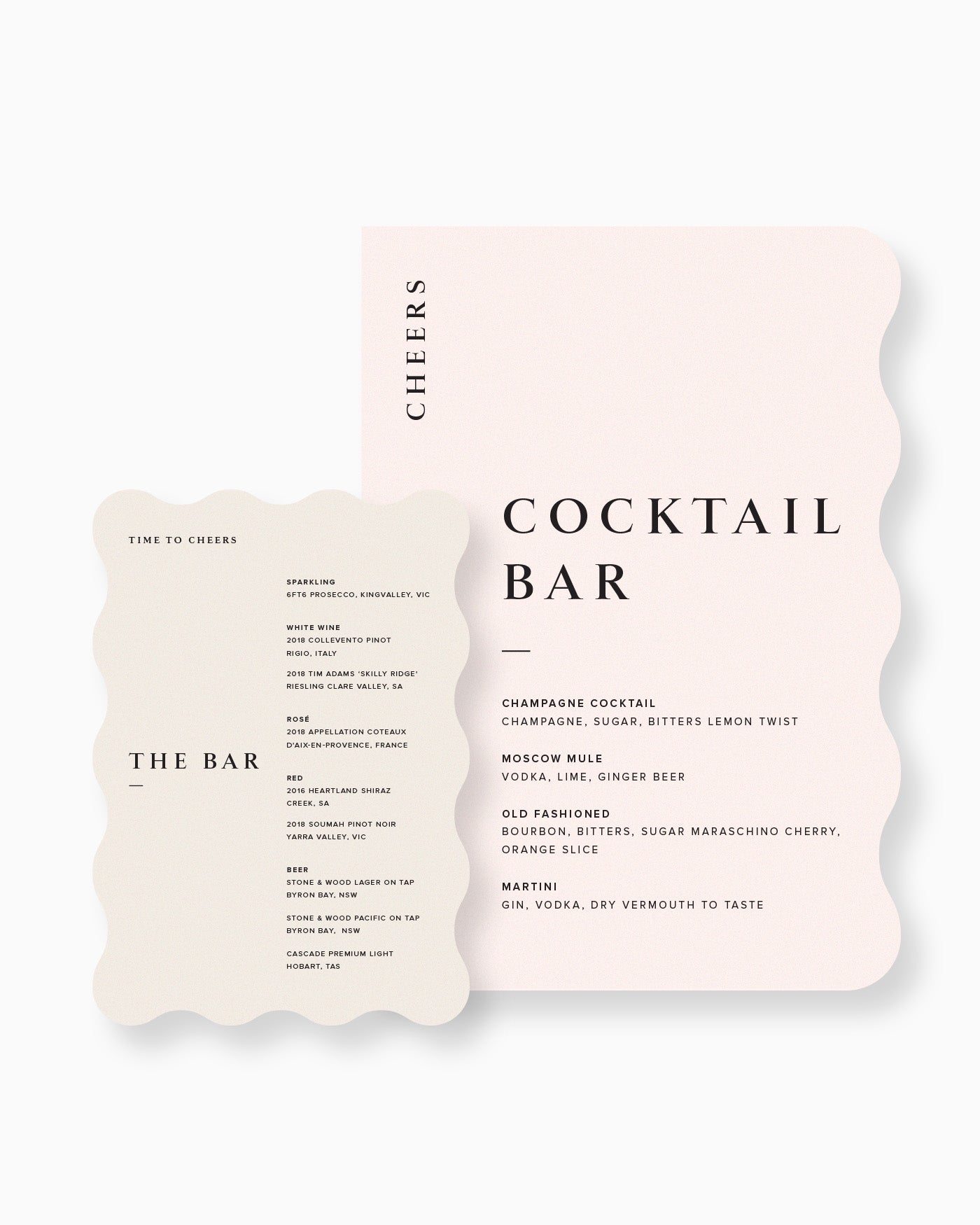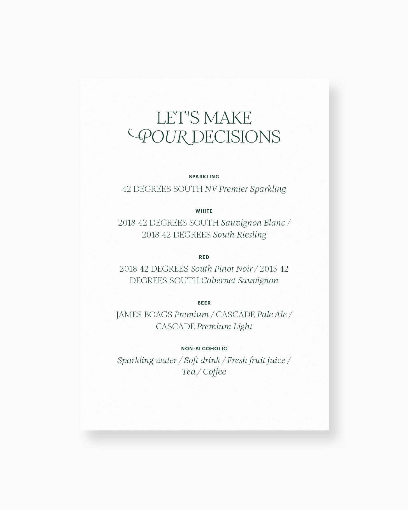 Available in printed card or foam board, our small signage includes table numbers, group menus, bar menus, gifts, guest book, photo booth or other A5 signage pieces you would like to display at your event.