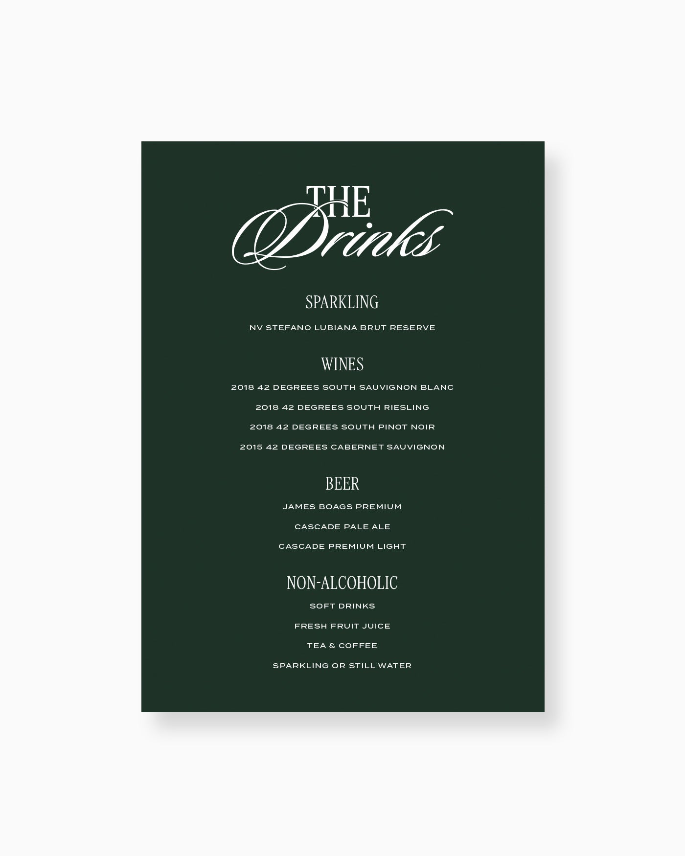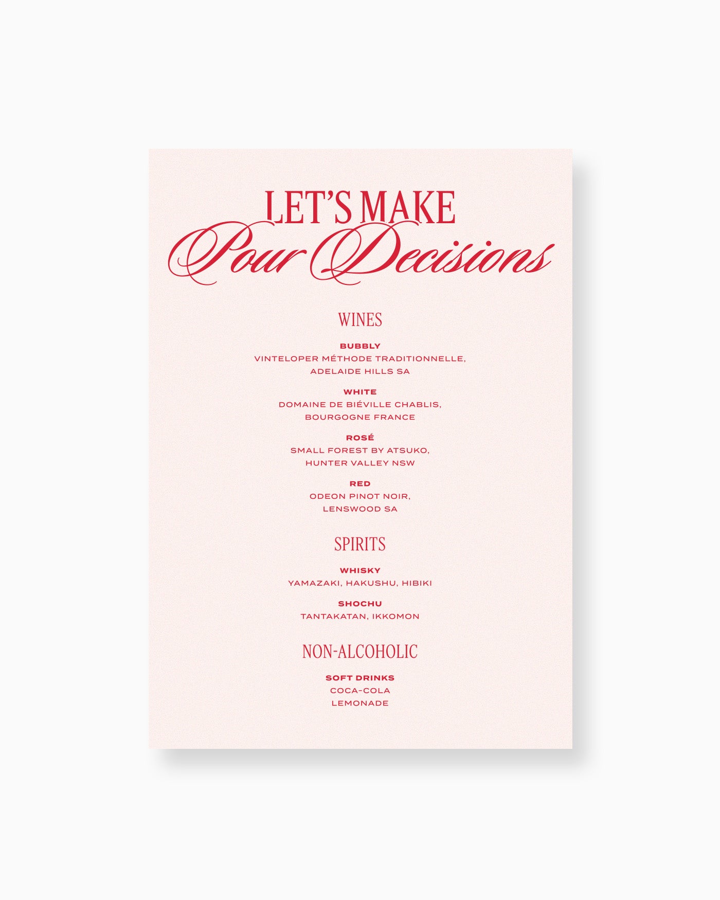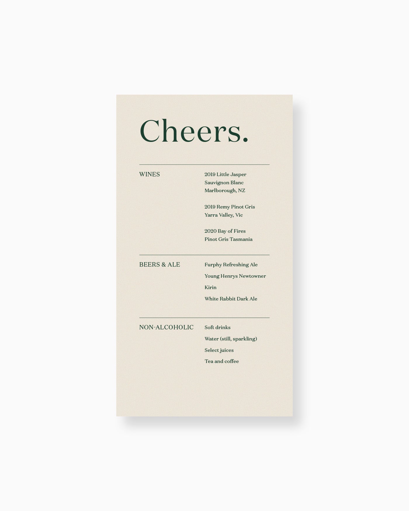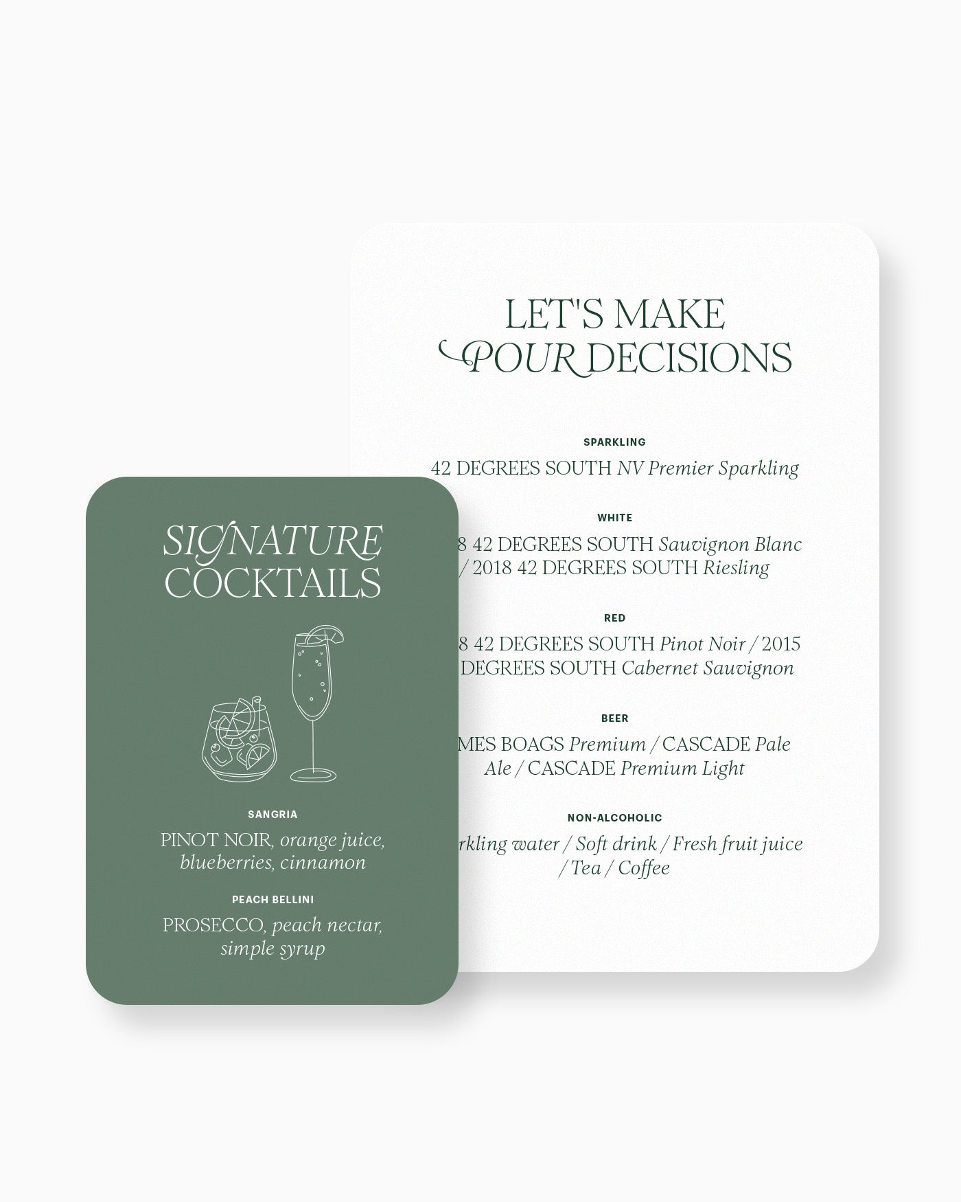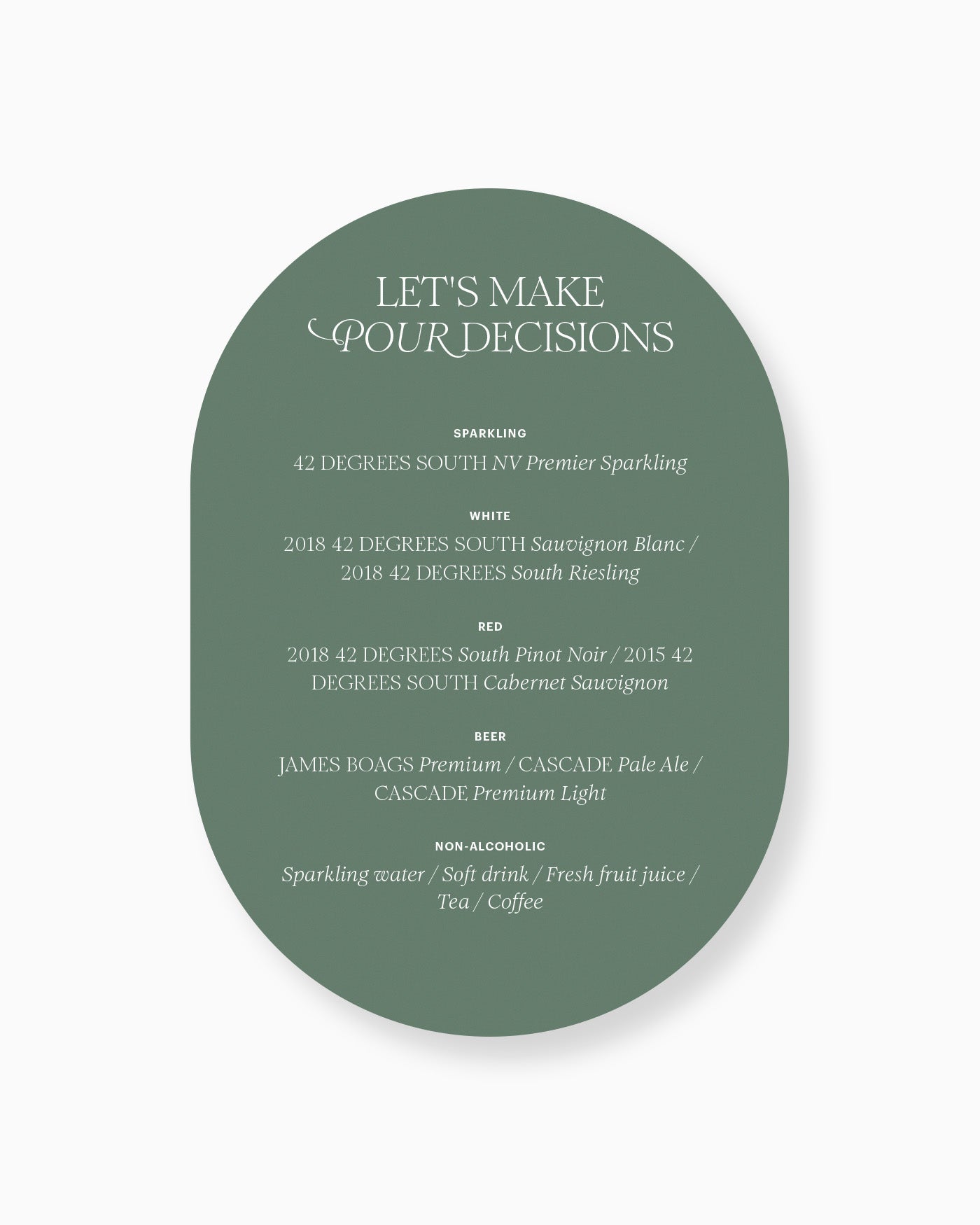 Available in printed card or foam board, our small signage includes table numbers, group menus, bar menus, gifts, guest book, photo booth or other A5 signage pieces you would like to display at your event.