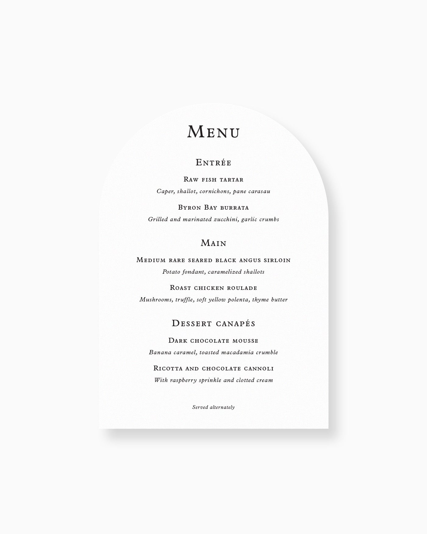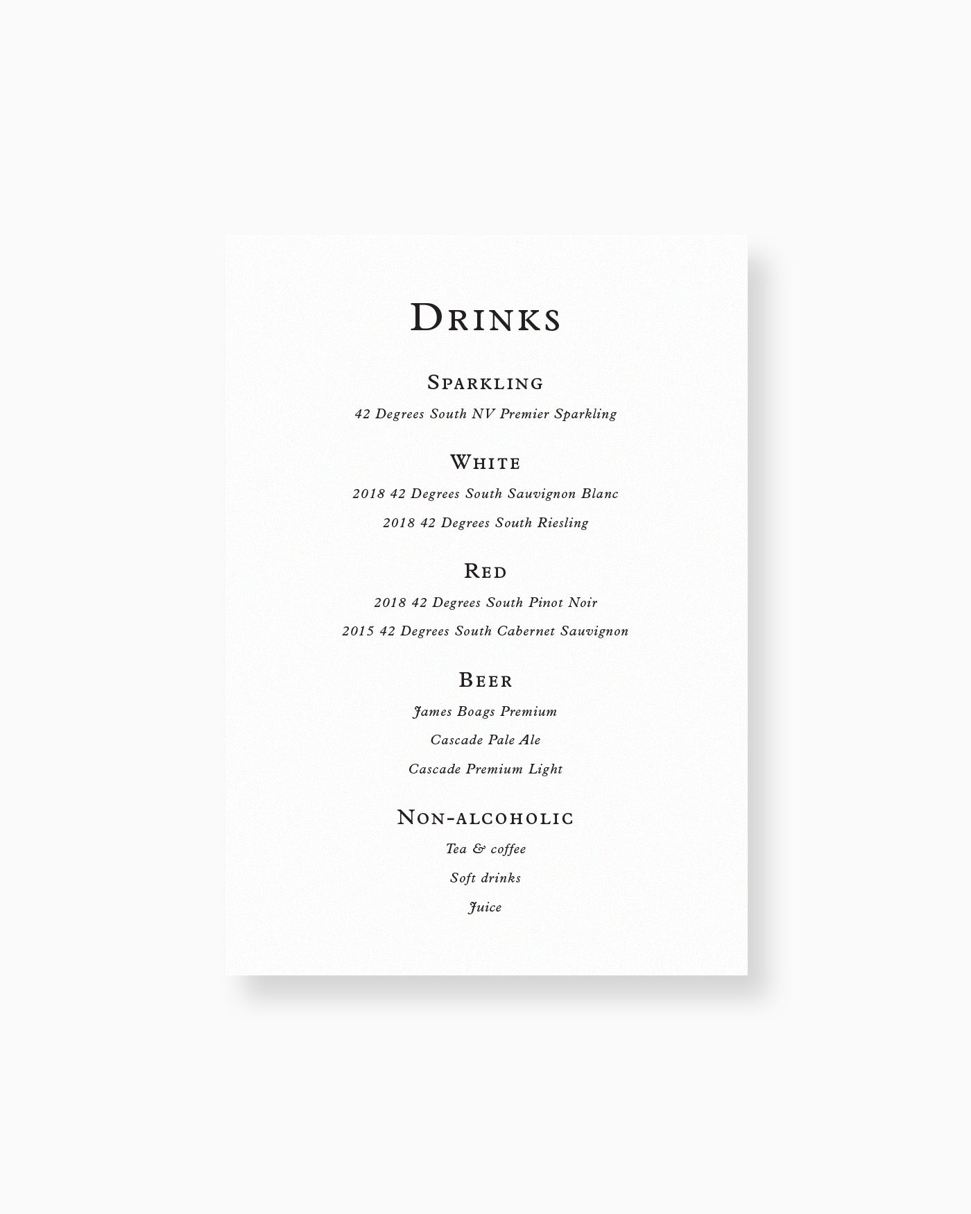 Inform your guests about the food and drink options at your event with the Verona Table Menus. These table menus are A5 in size and can be printed onto card or 3mm foam board. Pairing well with our A4 and A5 signage packages, these make a perfect addition to your event styling.