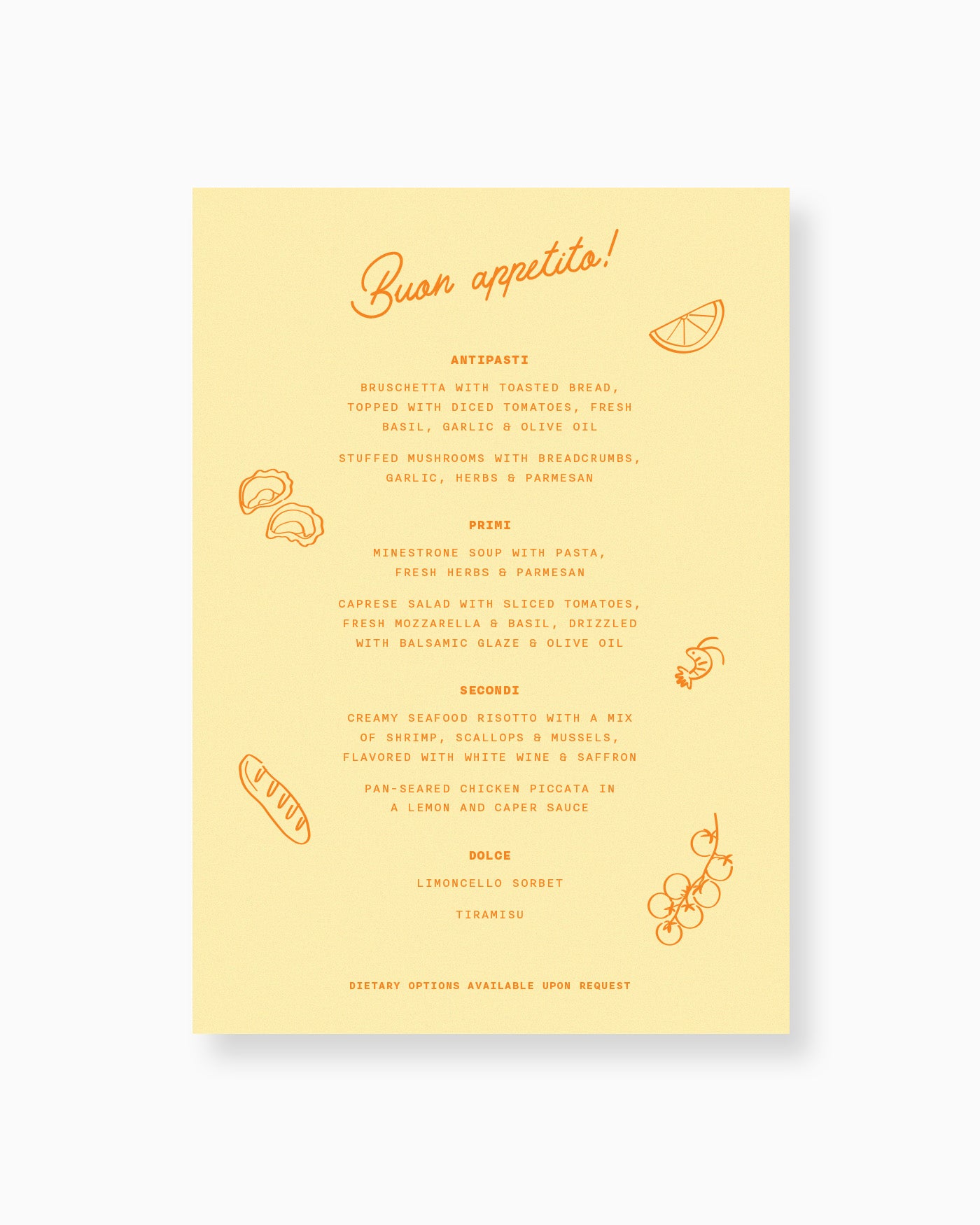 Amalfi embodies your relaxed and vibrant event. Fresh and delicious seafood, citruses, foods and produce are captured in charming hand drawn illustrations, reflecting the cherished moments with friends and family who have come together from near and far to celebrate your special day.