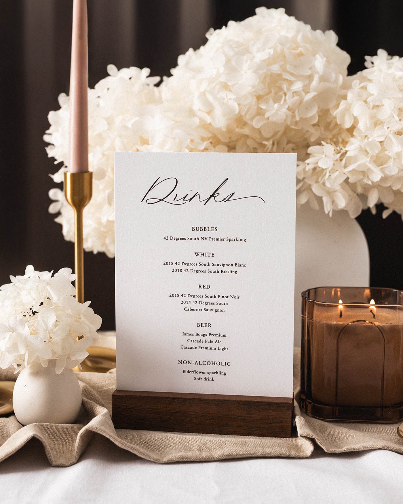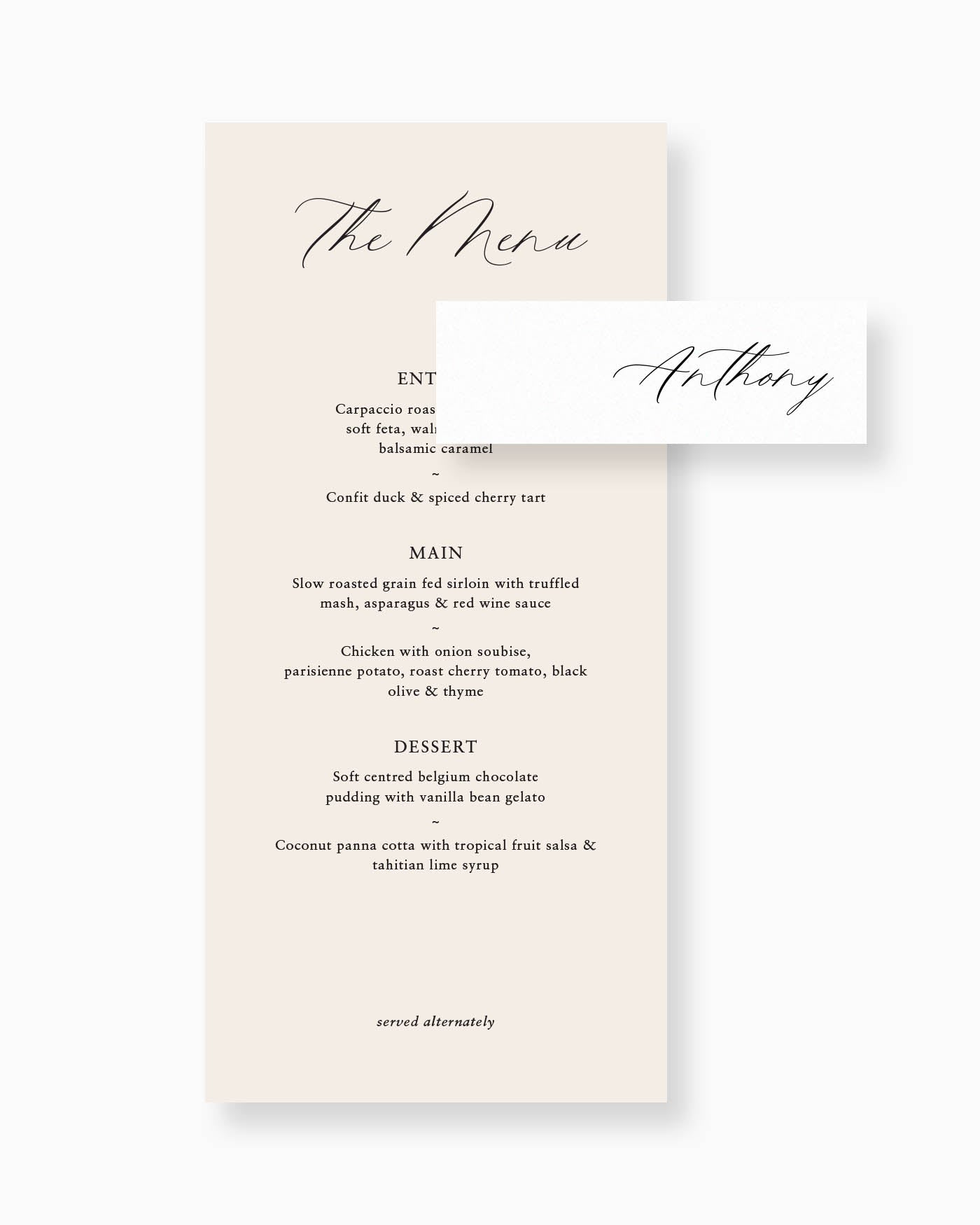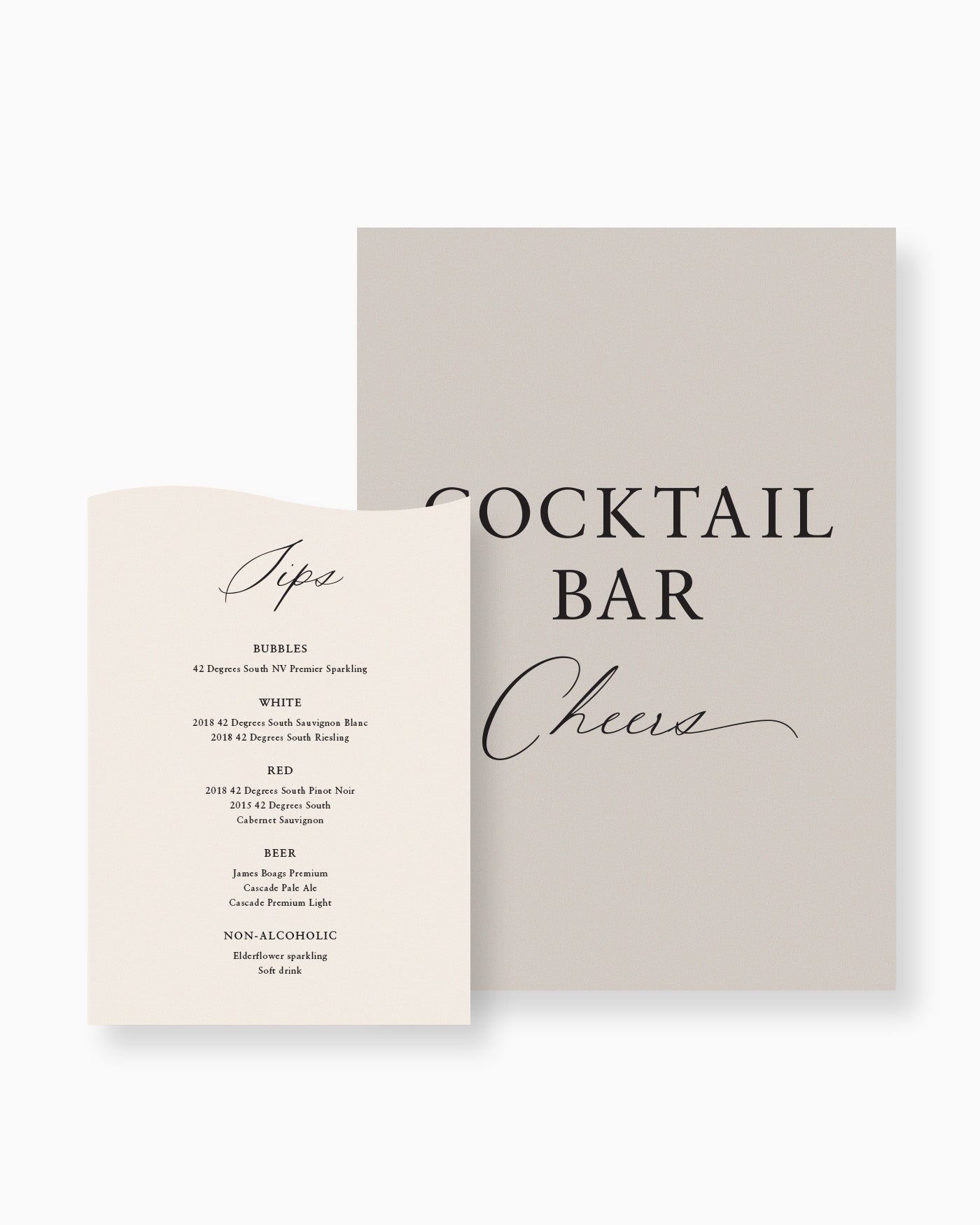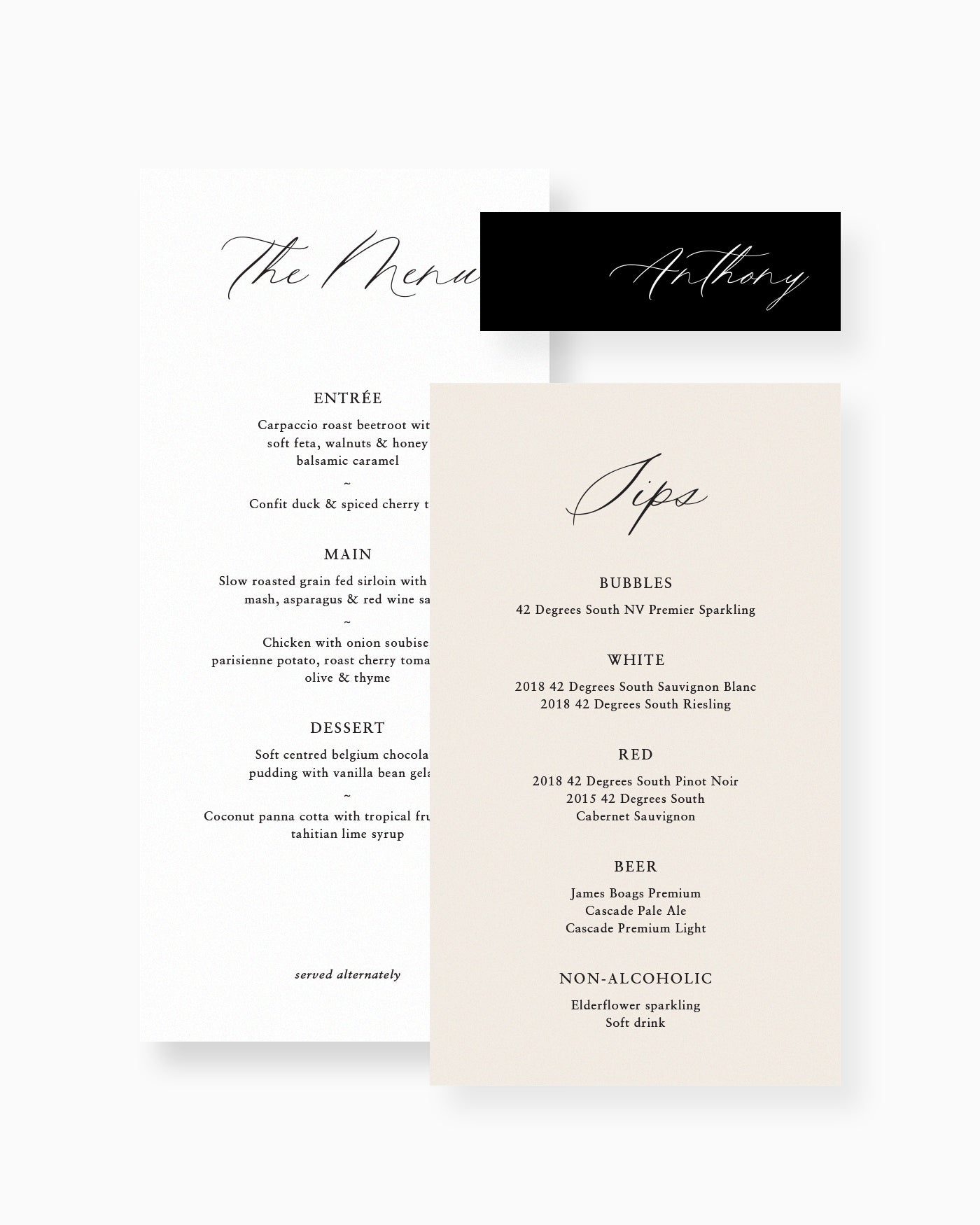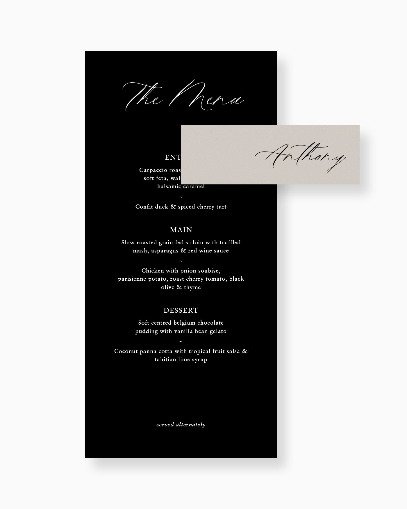 An ode to love and a celebration of romance, the Amour collection uses sweeping calligraphy and traditional French typography on the wedding invitation and across the invitation suite to create a classical look. Additional calligraphy elements are added across on the day elements through the welcome sign, seating chart and menus to keep a cohesive and classic tone.