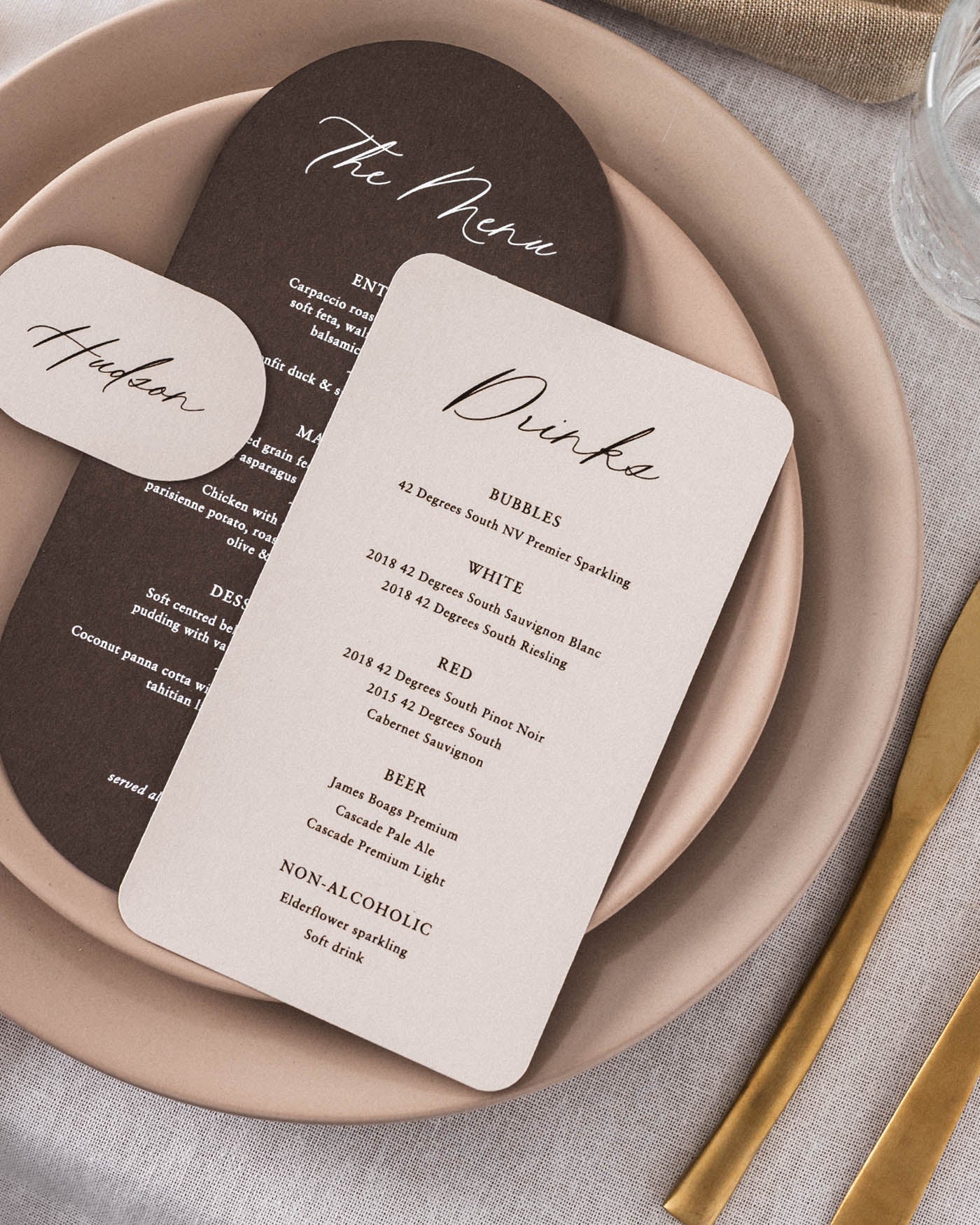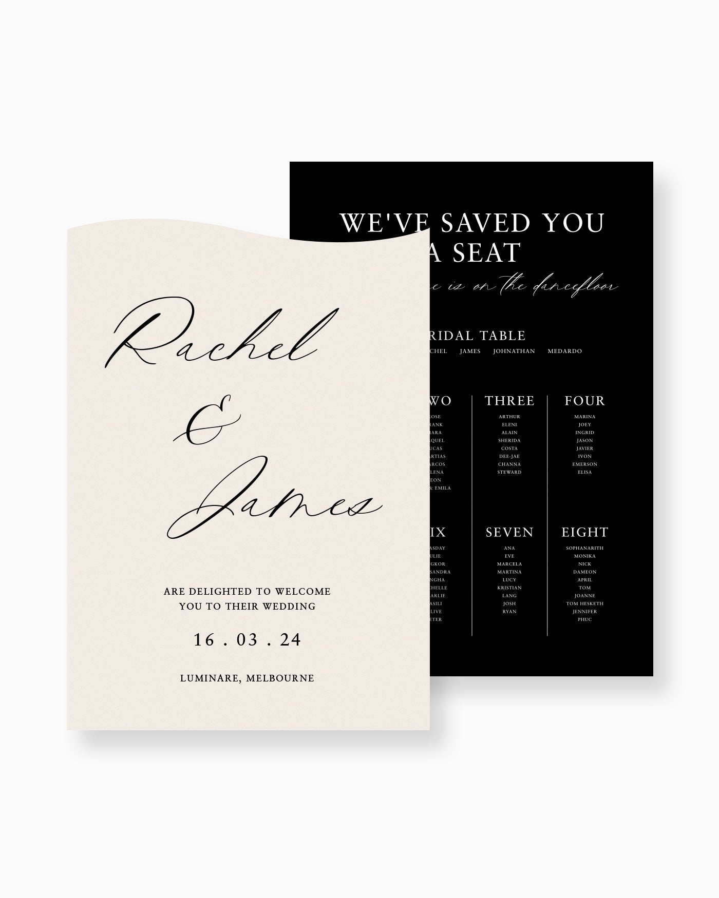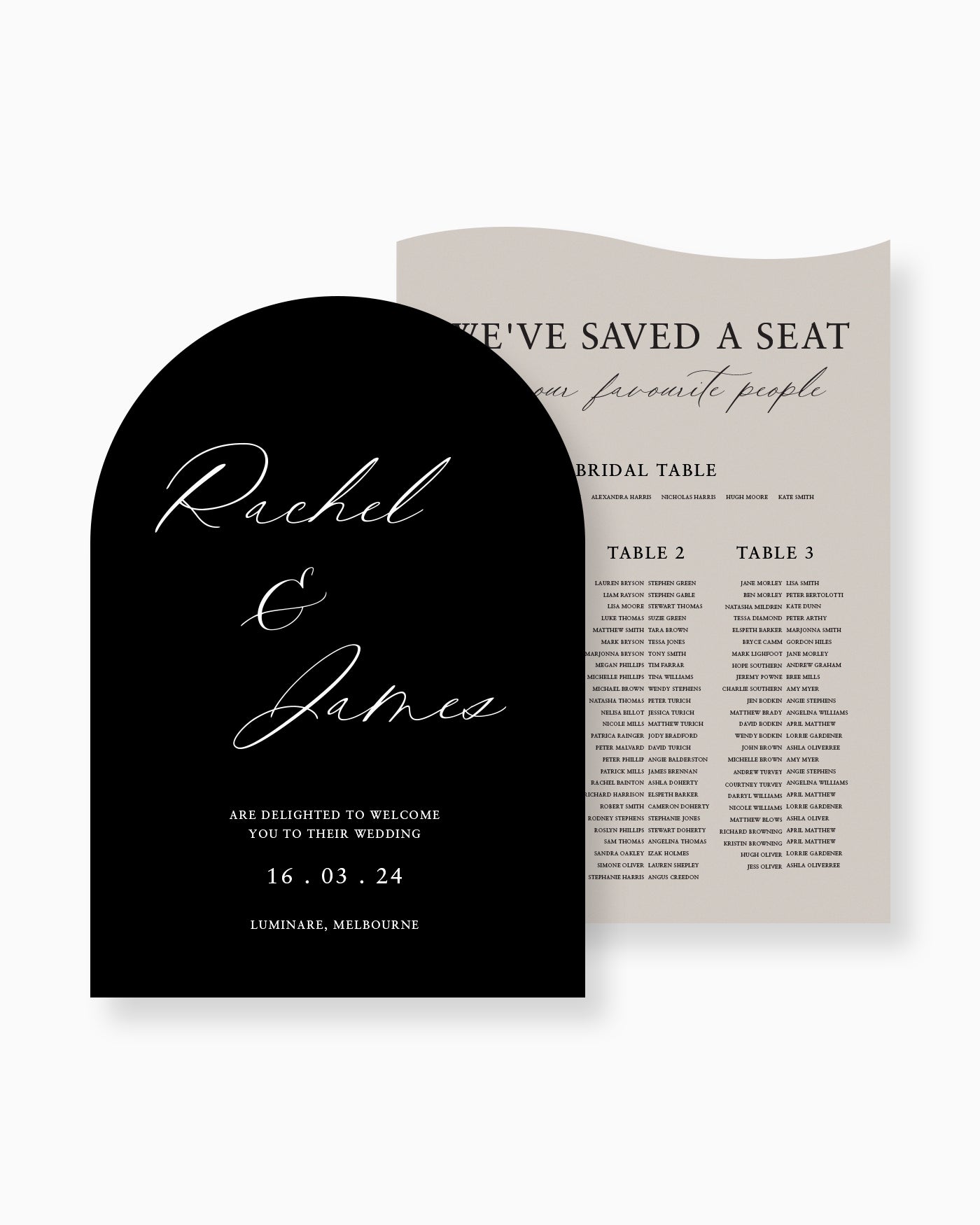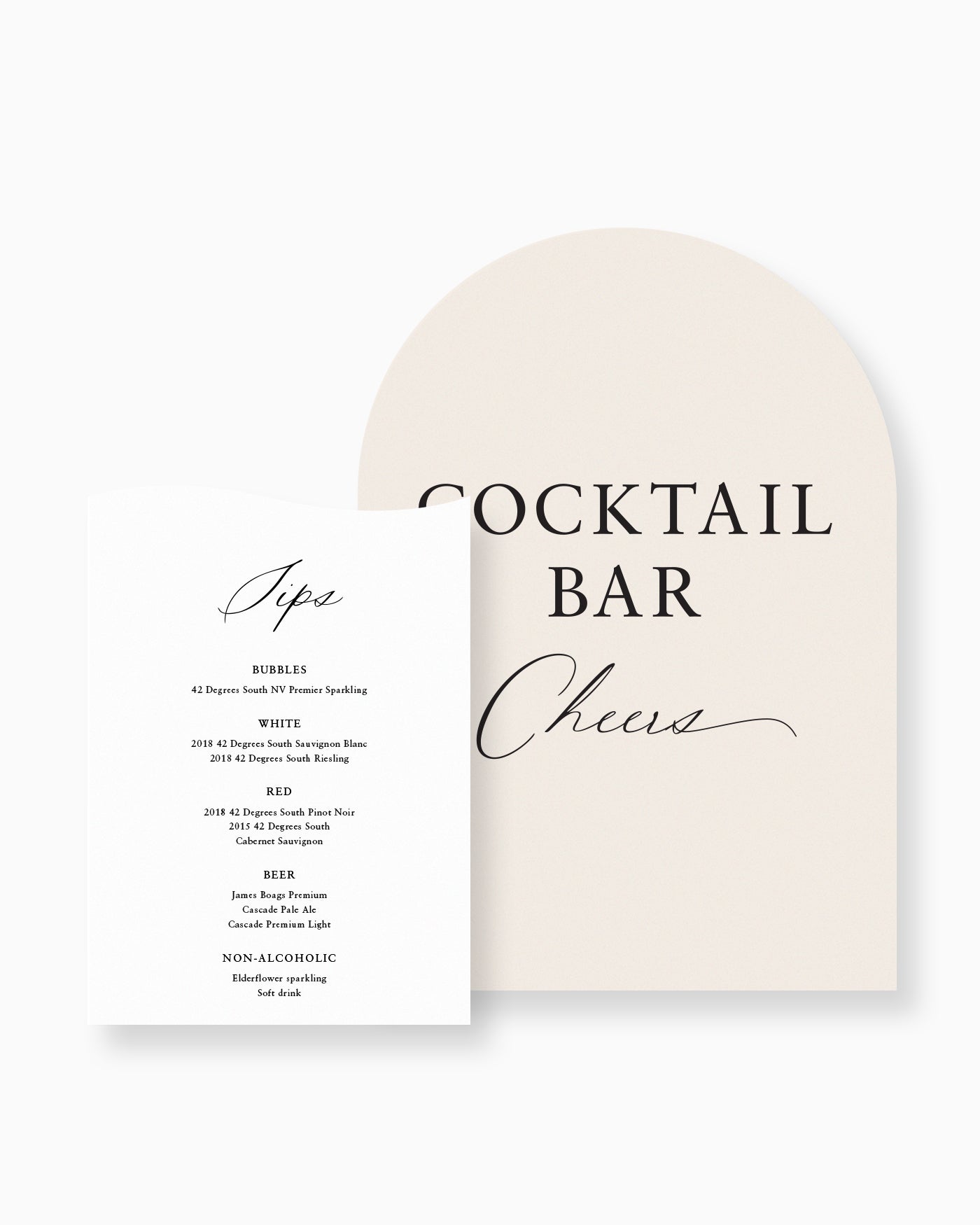 An ode to love and a celebration of romance, the Amour collection uses sweeping calligraphy and traditional French typography on the wedding invitation and across the invitation suite to create a classical look. Additional calligraphy elements are added across on the day elements through the welcome sign, seating chart and menus to keep a cohesive and classic tone.