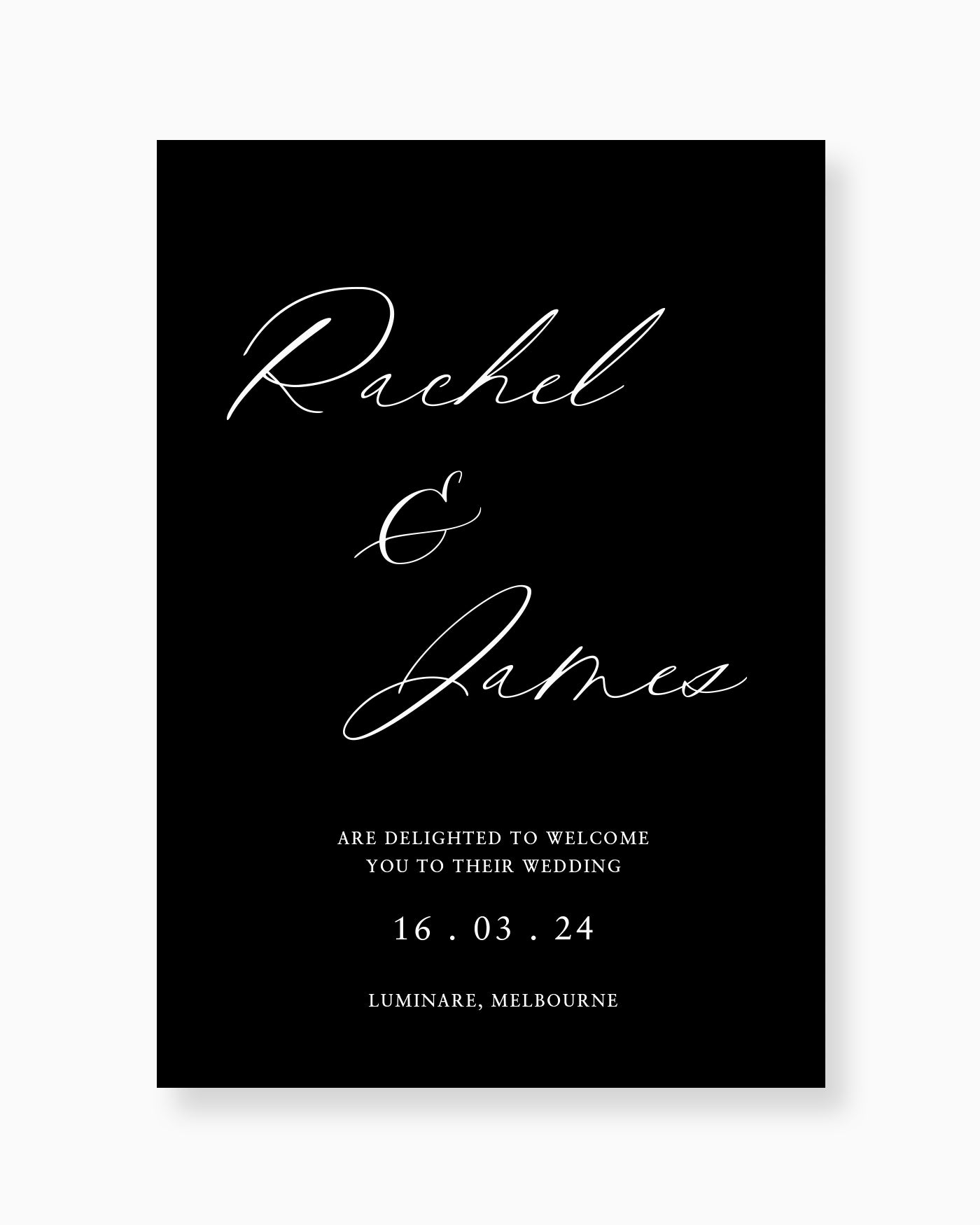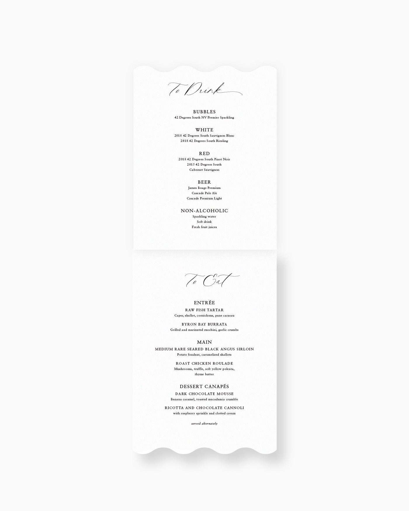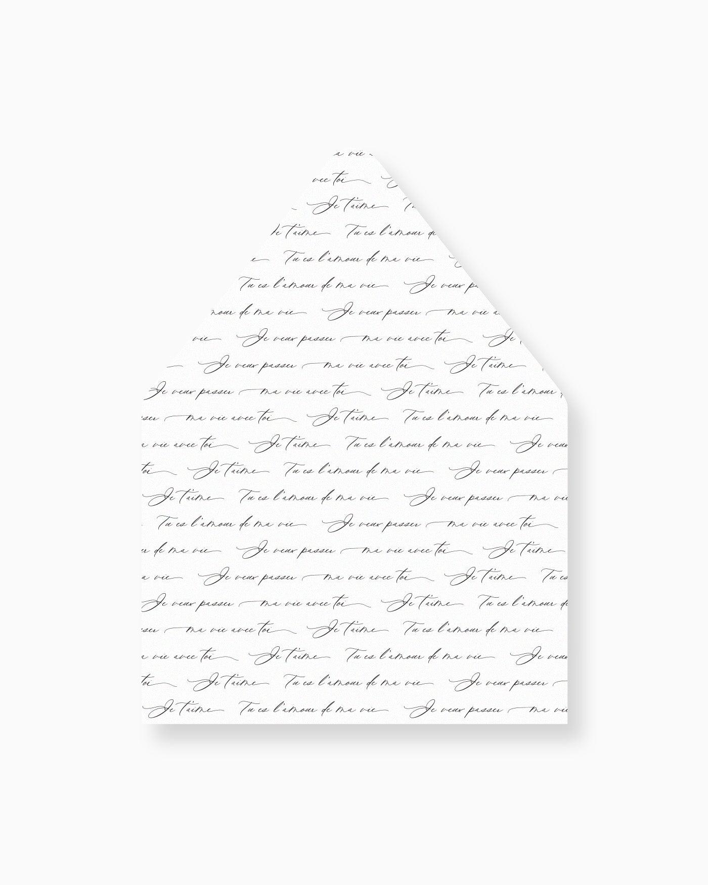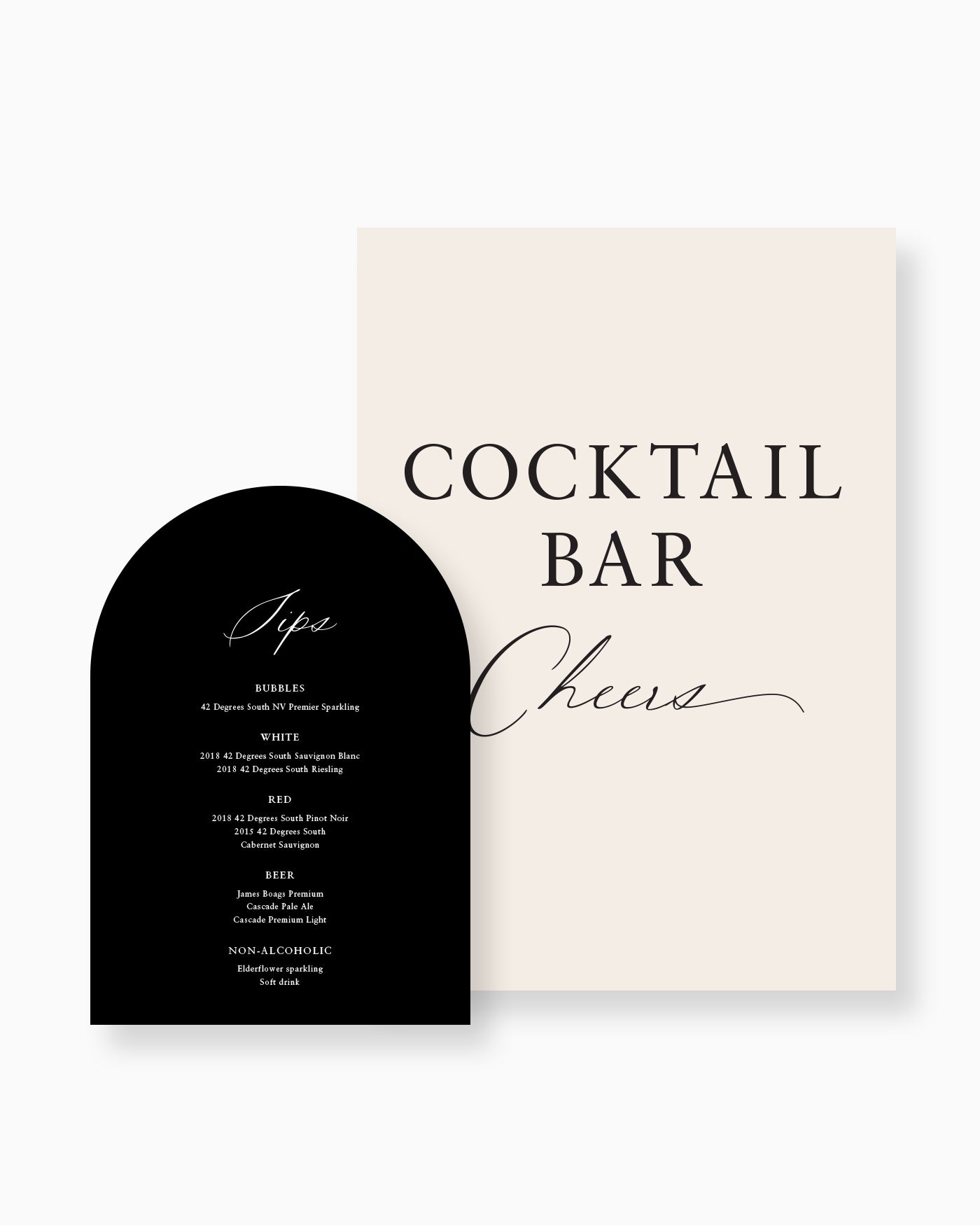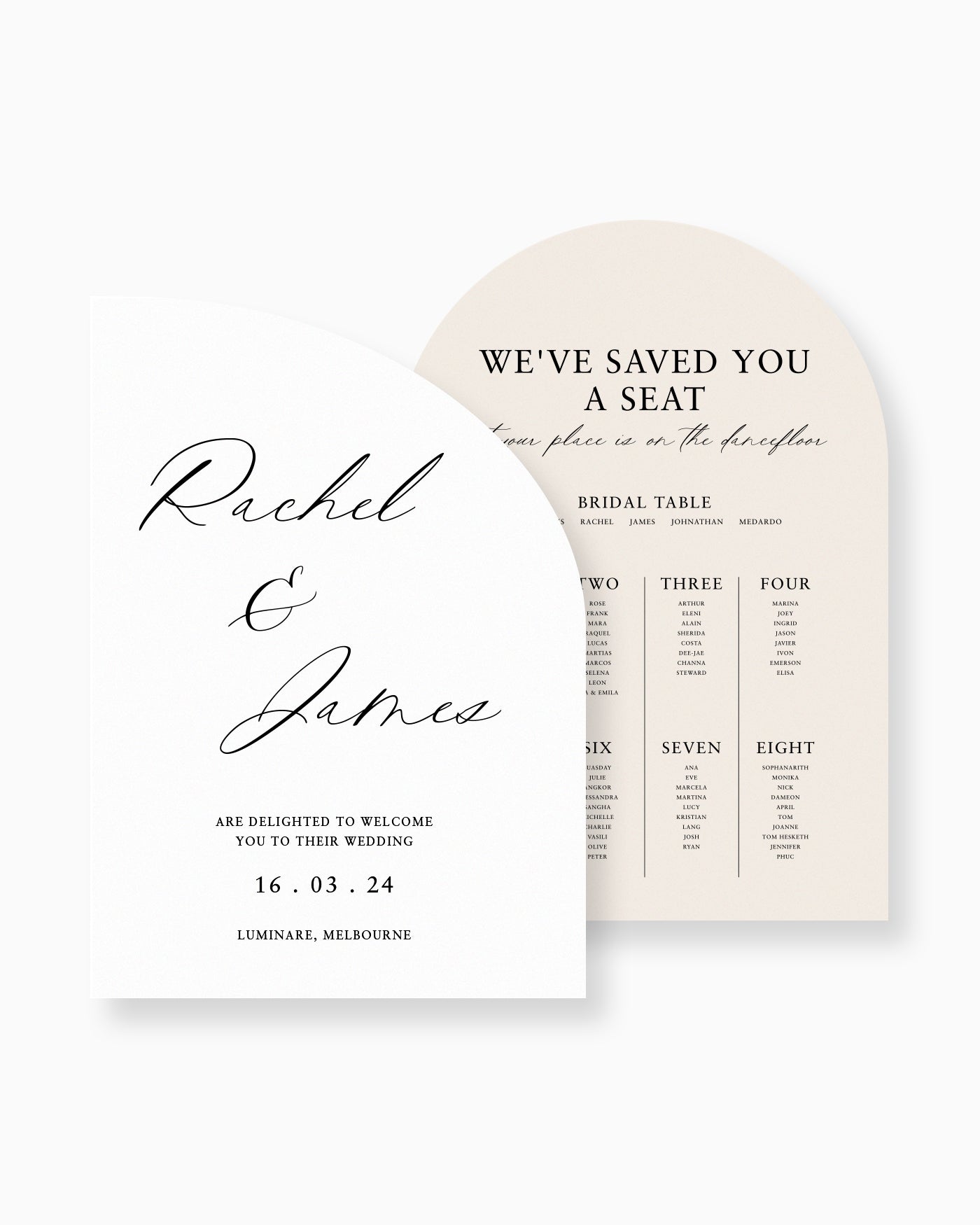 An ode to love and a celebration of romance, the Amour collection uses sweeping calligraphy and traditional French typography on the wedding invitation and across the invitation suite to create a classical look. Additional calligraphy elements are added across on the day elements through the welcome sign, seating chart and menus to keep a cohesive and classic tone.