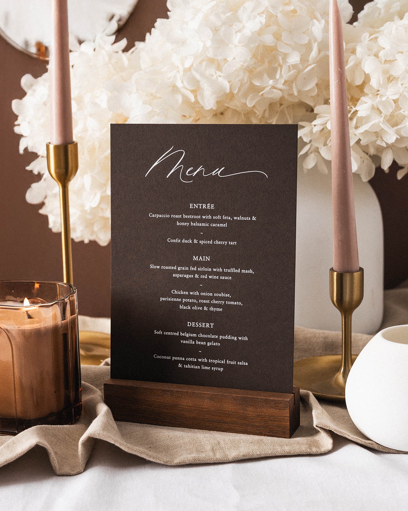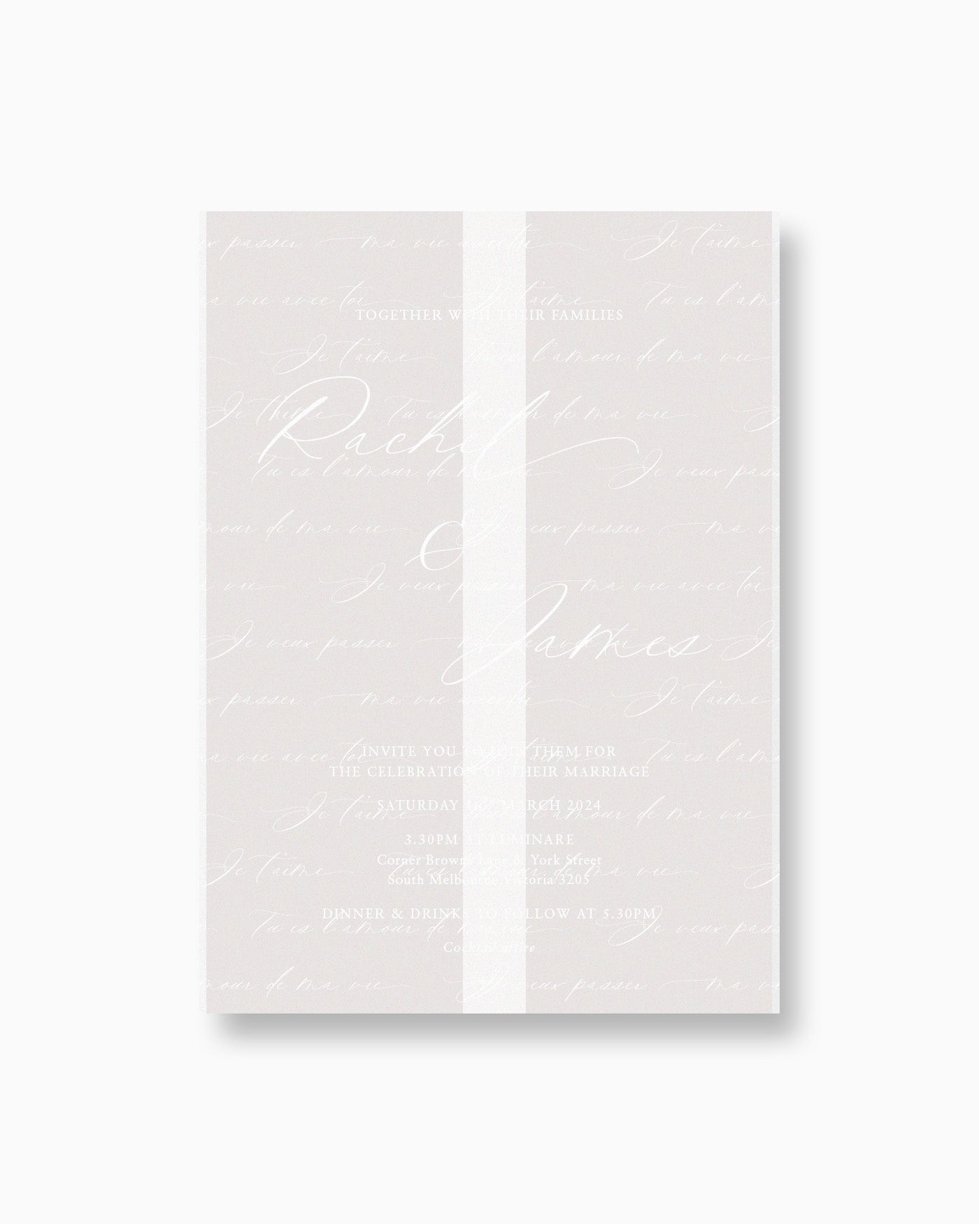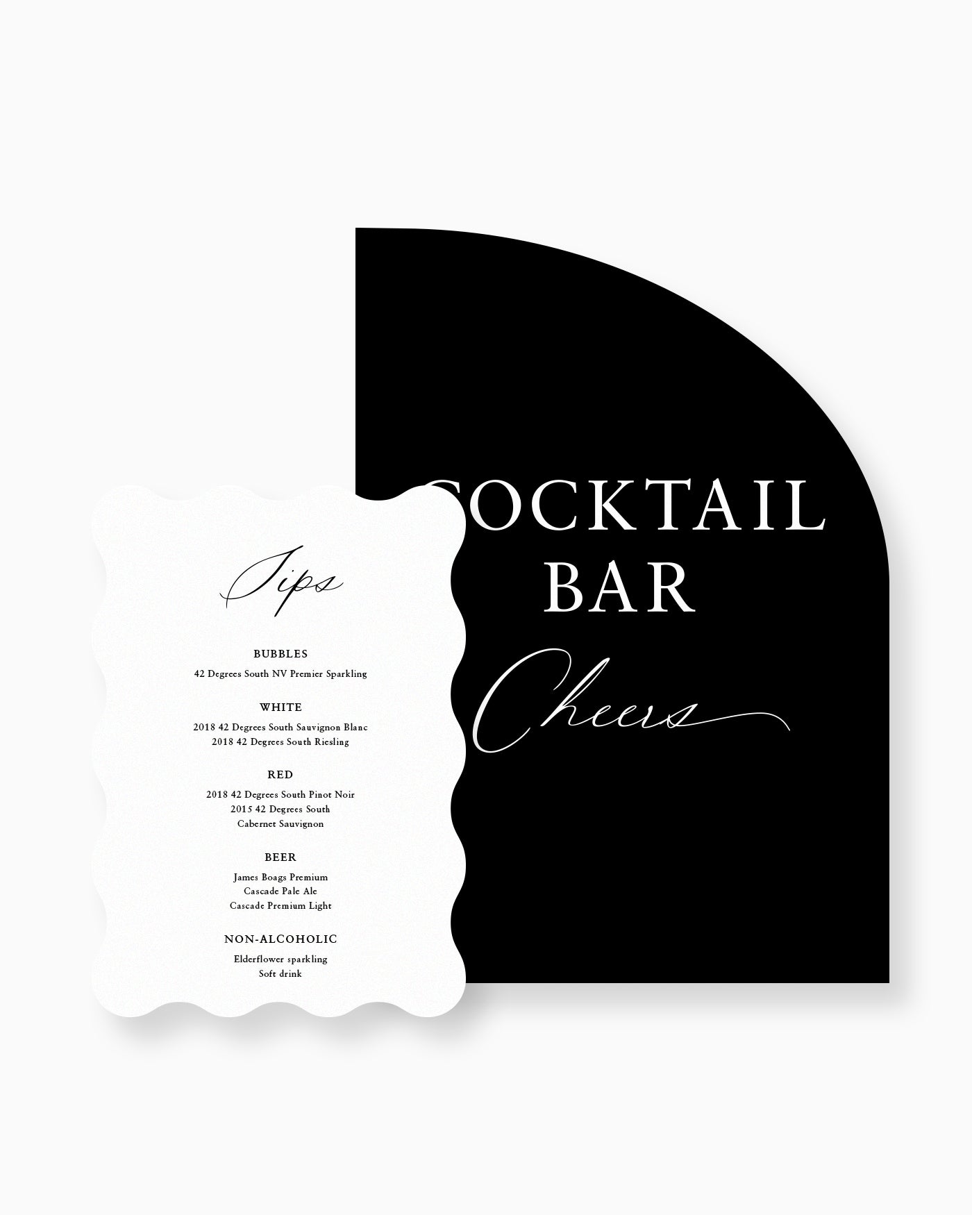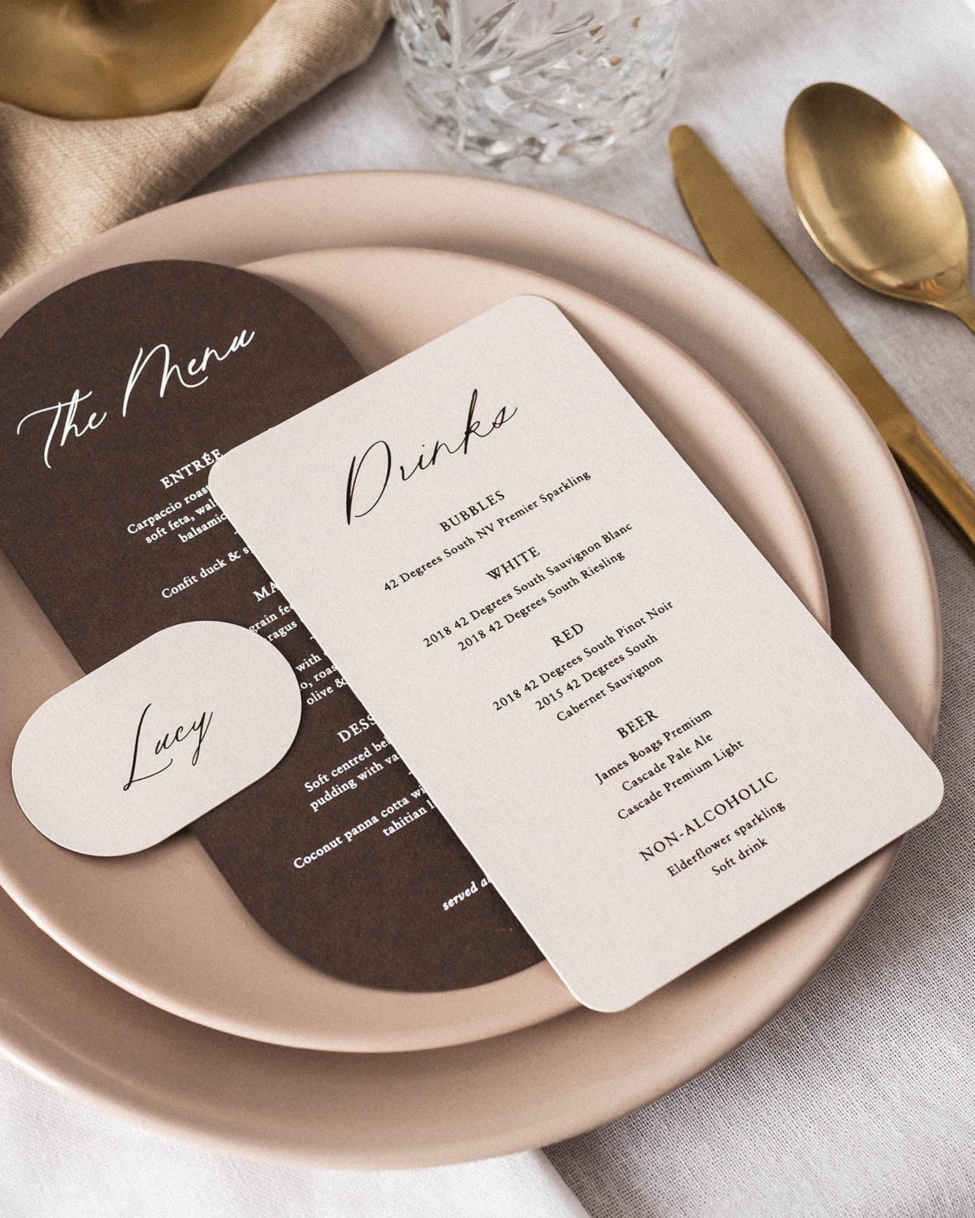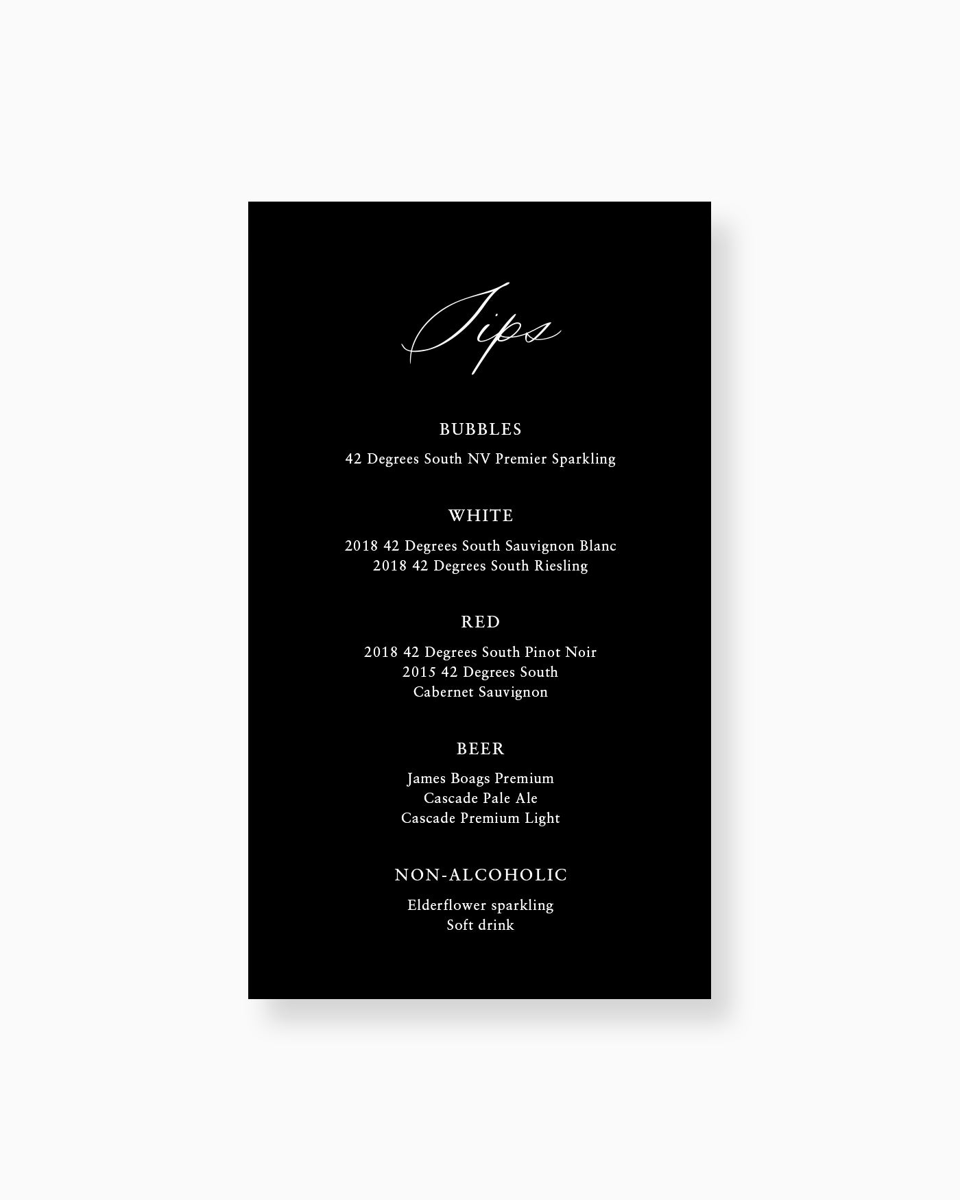 An ode to love and a celebration of romance, the Amour collection uses sweeping calligraphy and traditional French typography on the wedding invitation and across the invitation suite to create a classical look. Additional calligraphy elements are added across on the day elements through the welcome sign, seating chart and menus to keep a cohesive and classic tone.