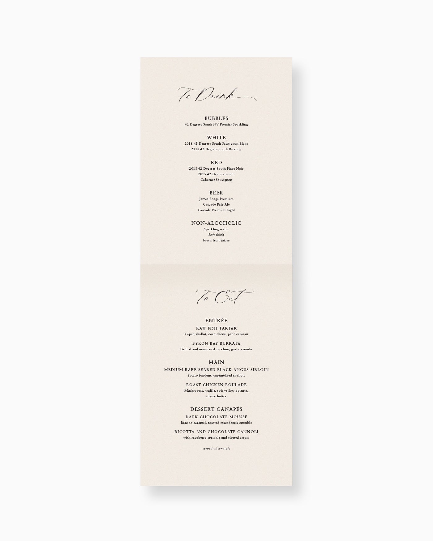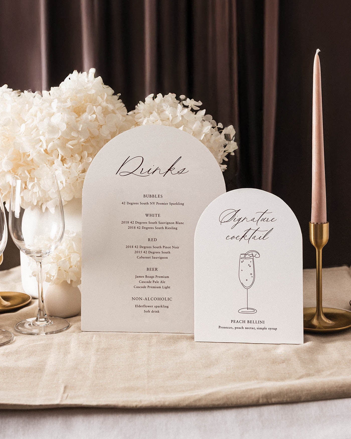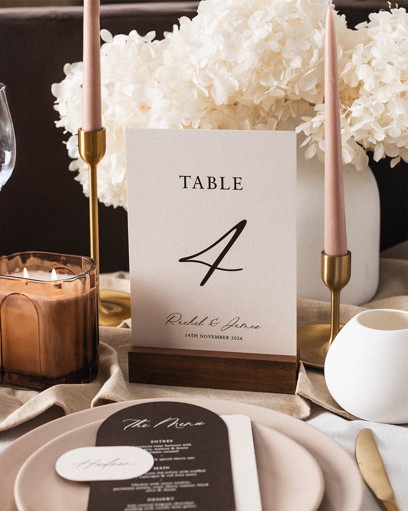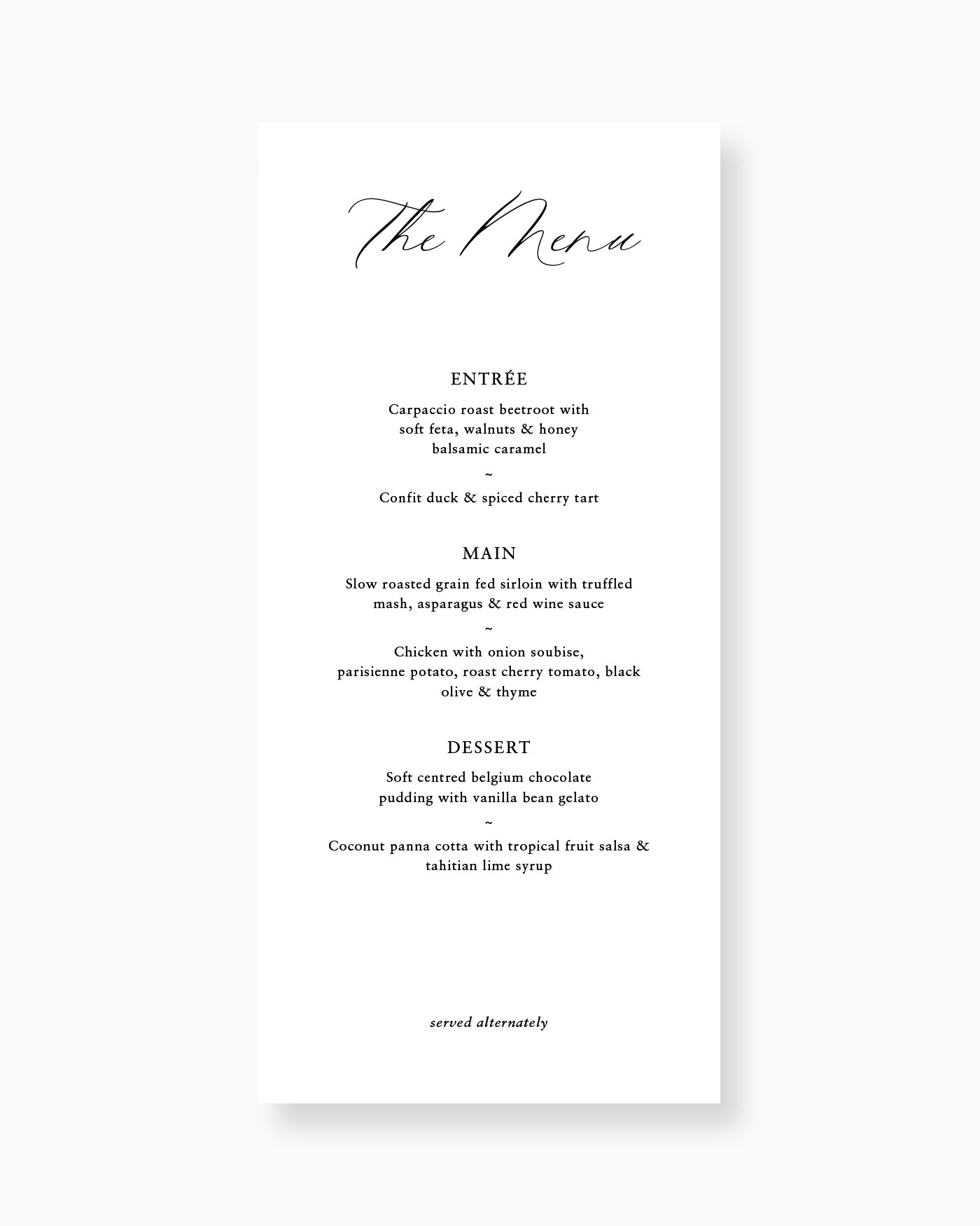 An ode to love and a celebration of romance, the Amour collection uses sweeping calligraphy and traditional French typography on the wedding invitation and across the invitation suite to create a classical look. Additional calligraphy elements are added across on the day elements through the welcome sign, seating chart and menus to keep a cohesive and classic tone.