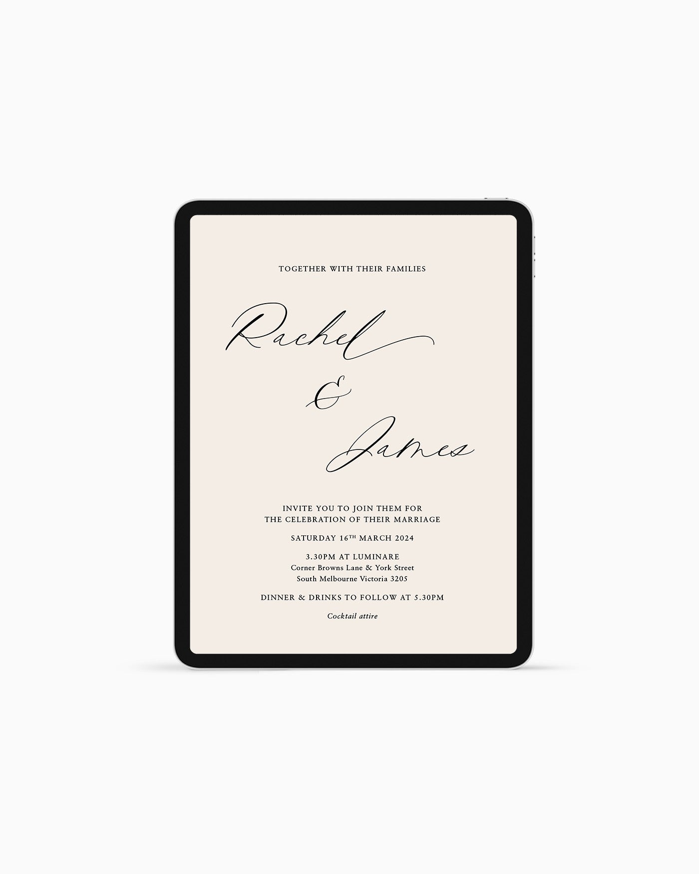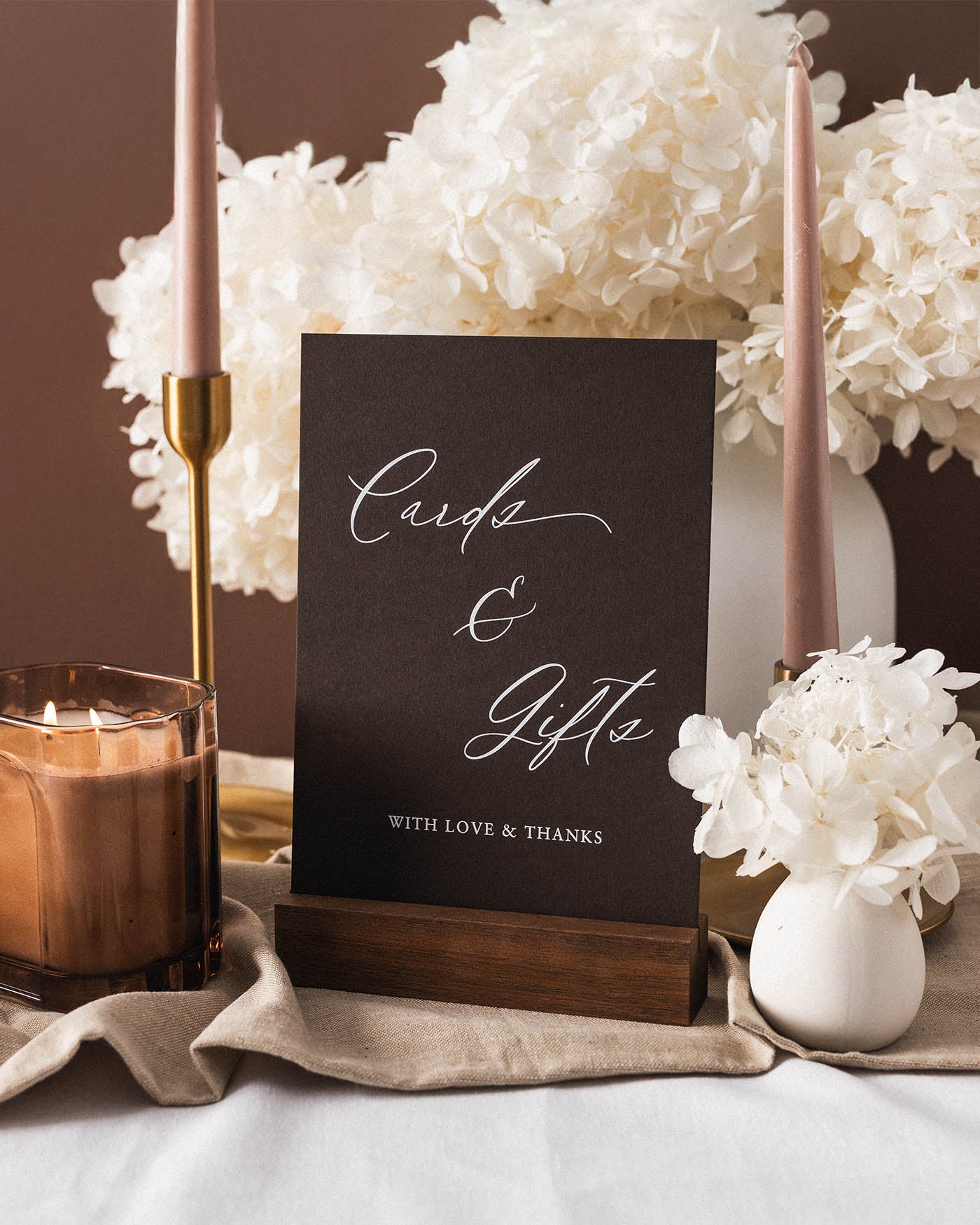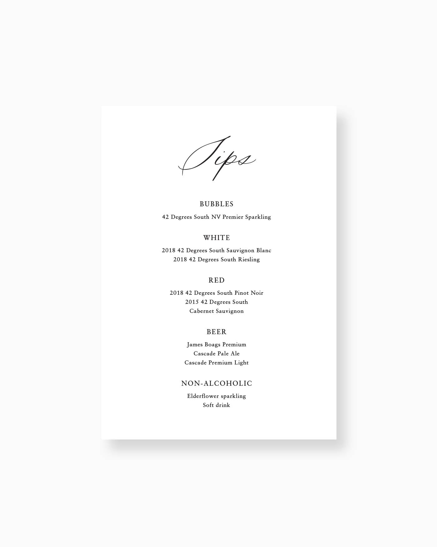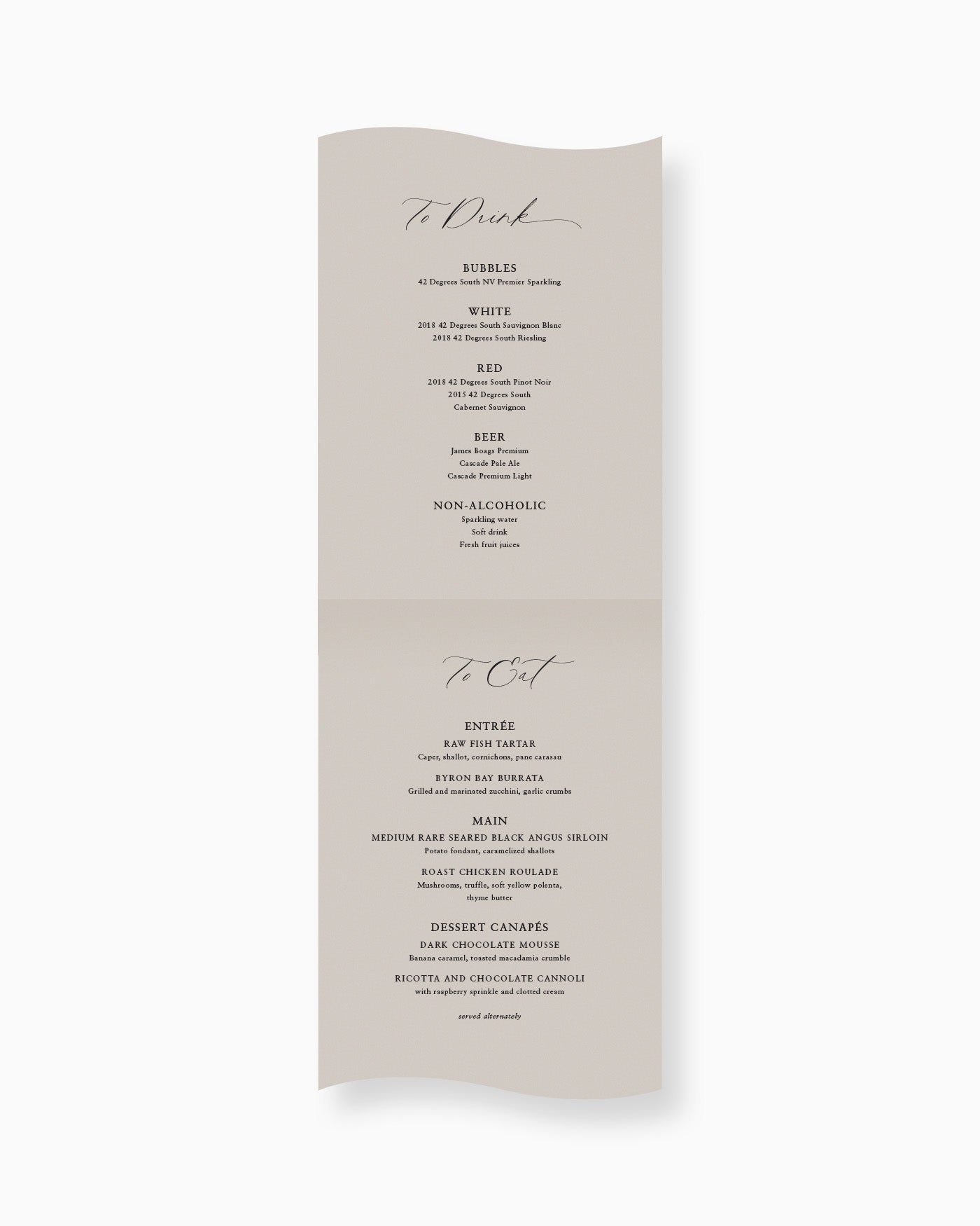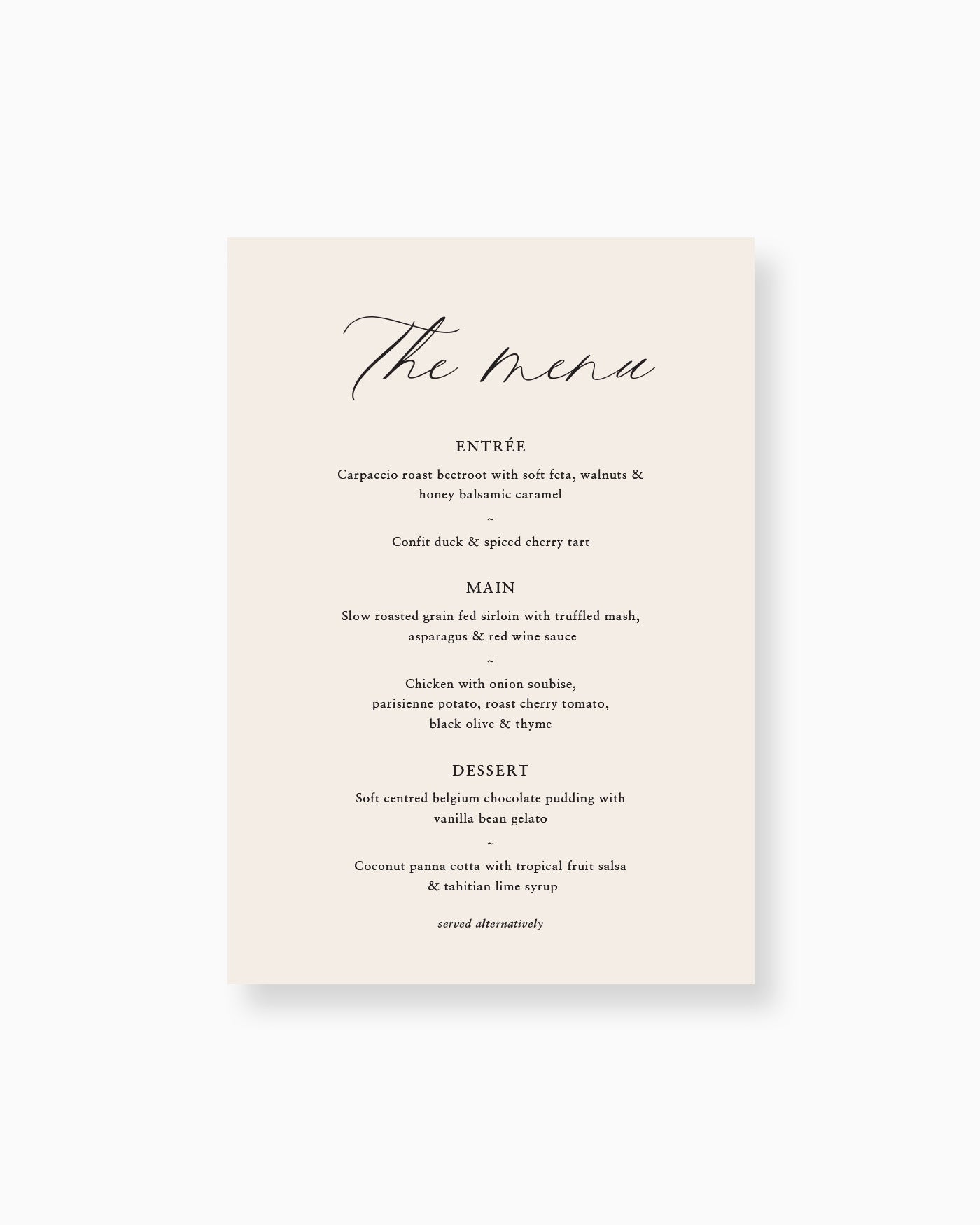 An ode to love and a celebration of romance, the Amour collection uses sweeping calligraphy and traditional French typography on the wedding invitation and across the invitation suite to create a classical look. Additional calligraphy elements are added across on the day elements through the welcome sign, seating chart and menus to keep a cohesive and classic tone.