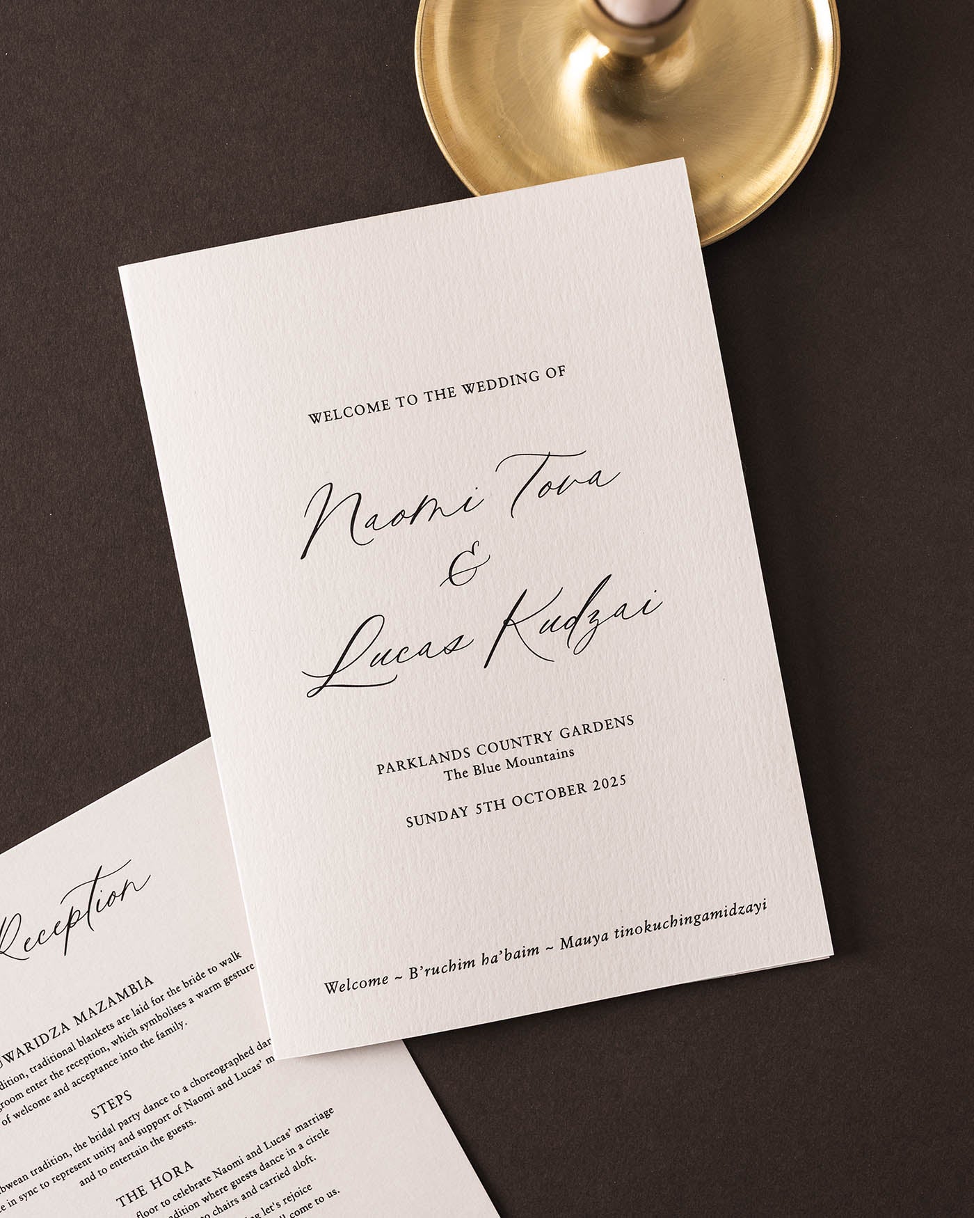 Our ceremony booklets are designed to allow your guests to see the order of events at your ceremony. These will be personalised for you to include any speakers, songs and celebrant details or other information that you would like printed.
