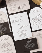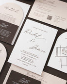 The Amour Wedding Invitation displays sweeping calligraphy with traditional typography.