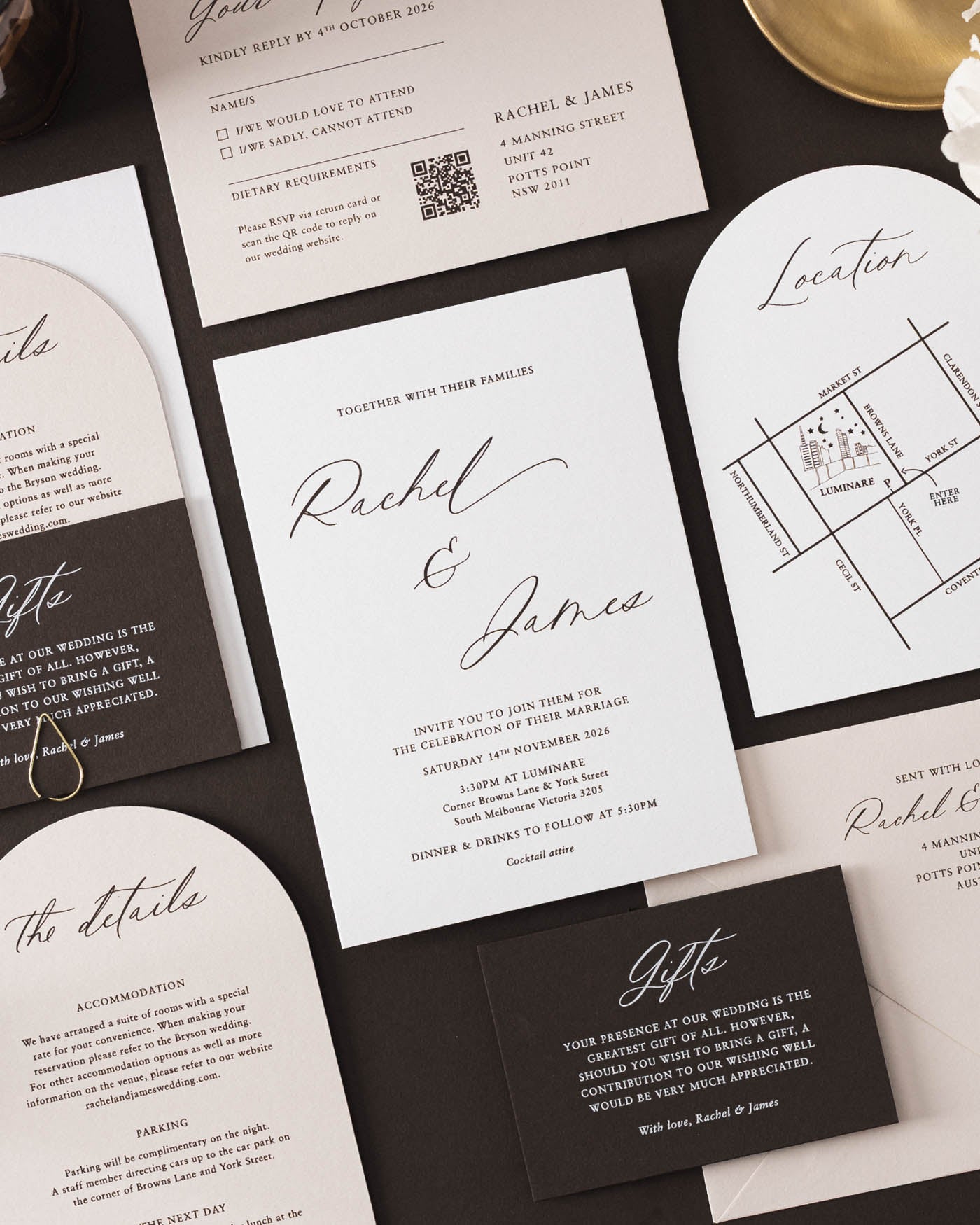 Style your event cohesively with a full collection of invitations, on the day pieces and more.