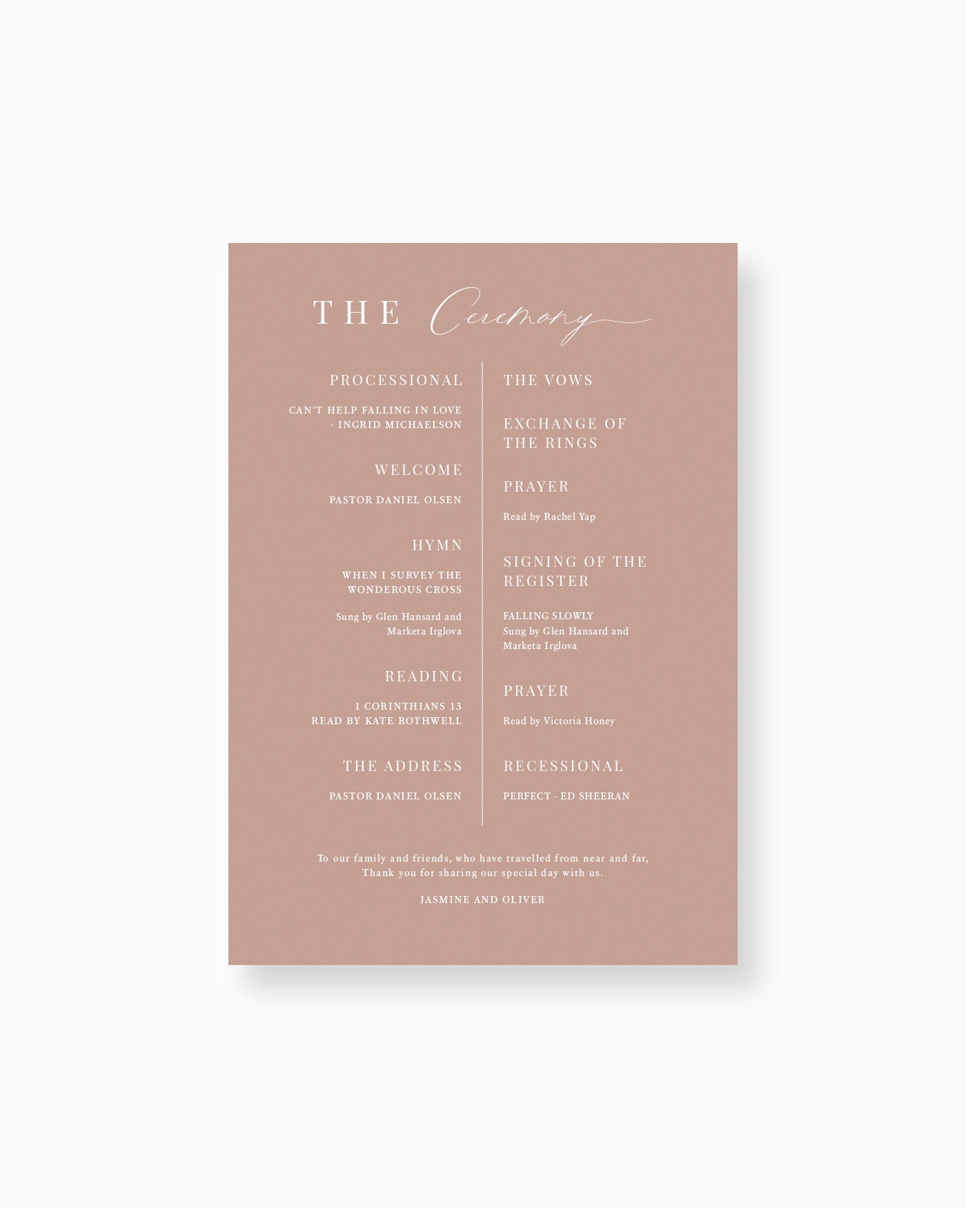 Peppermint Press wedding ceremony booklets are beautifully printed guides that outline the sequence of events during a ceremony. Featuring details such as the order of proceedings, names of the bridal party and readings, they are often adorned with decorative elements and eventually become cherished keepsakes that evoke memories of your special day.