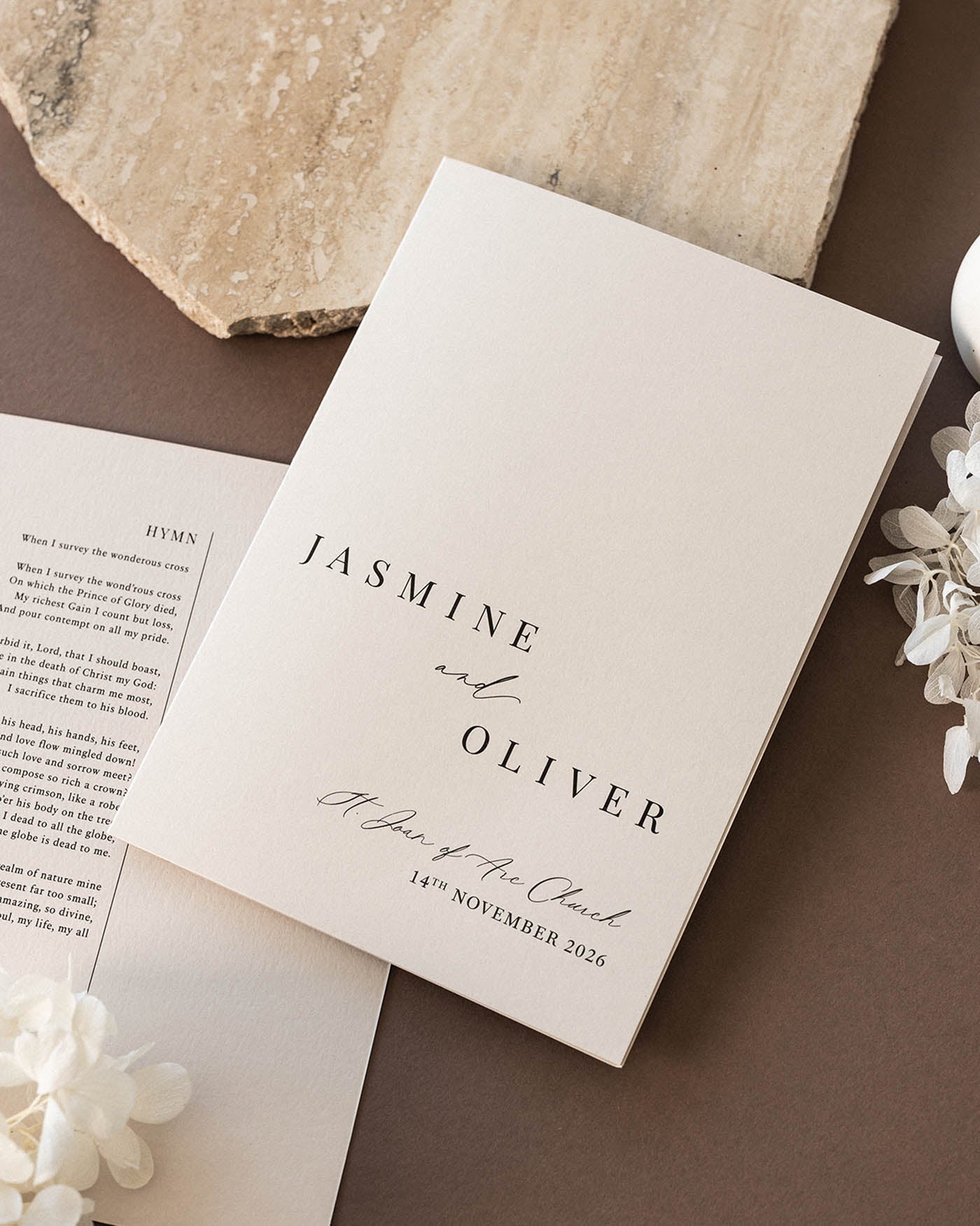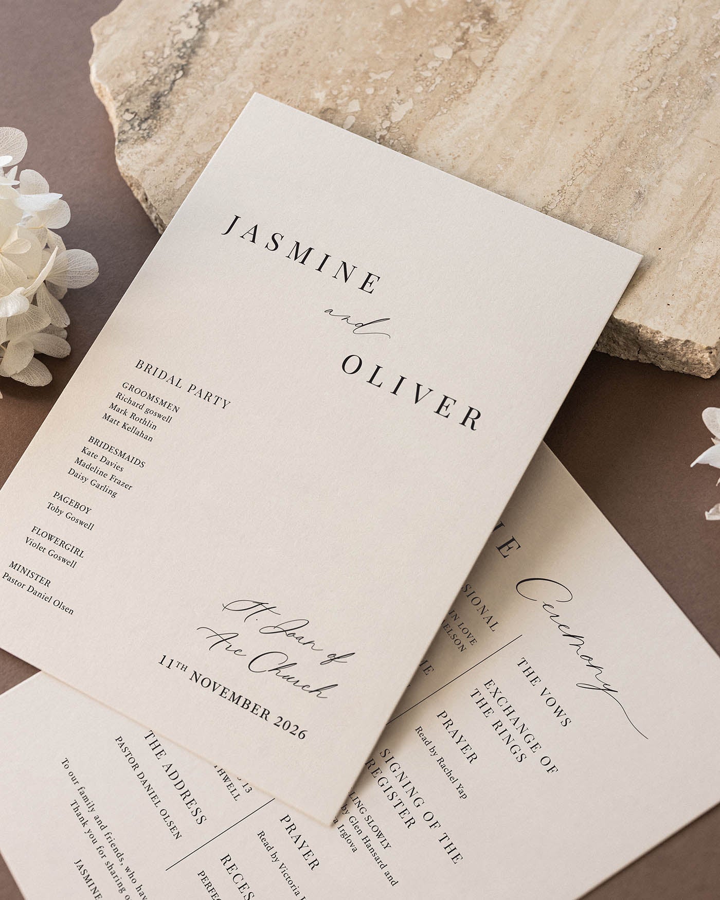 Peppermint Press wedding ceremony booklets are beautifully printed guides that outline the sequence of events during a ceremony. Featuring details such as the order of proceedings, names of the bridal party and readings, they are often adorned with decorative elements and eventually become cherished keepsakes that evoke memories of your special day.