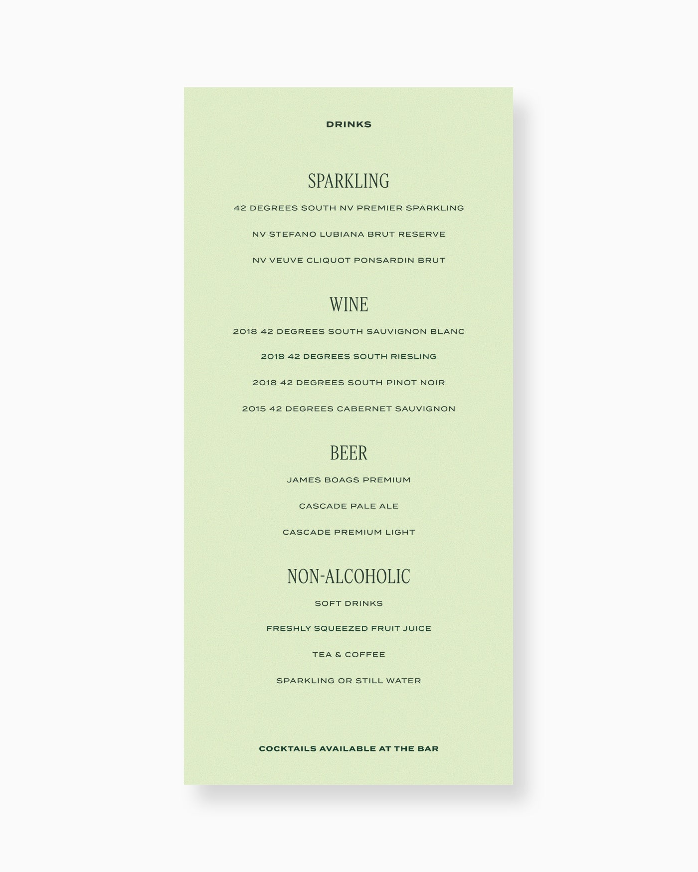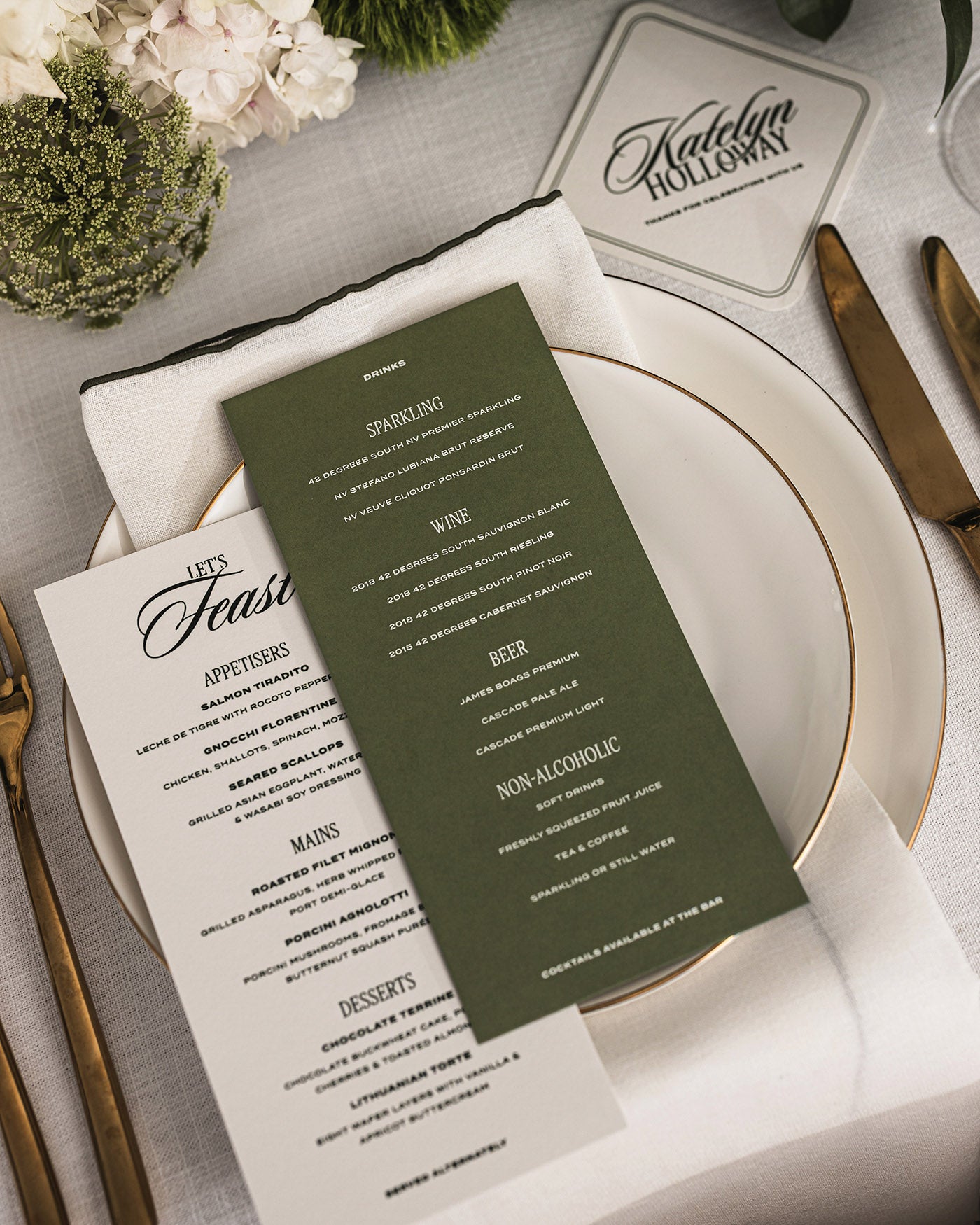Perfect for individual place settings, this menu can be personalised with your event's drink selections for your guests to browse.