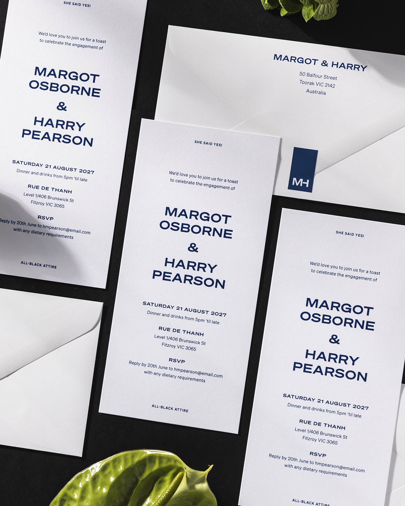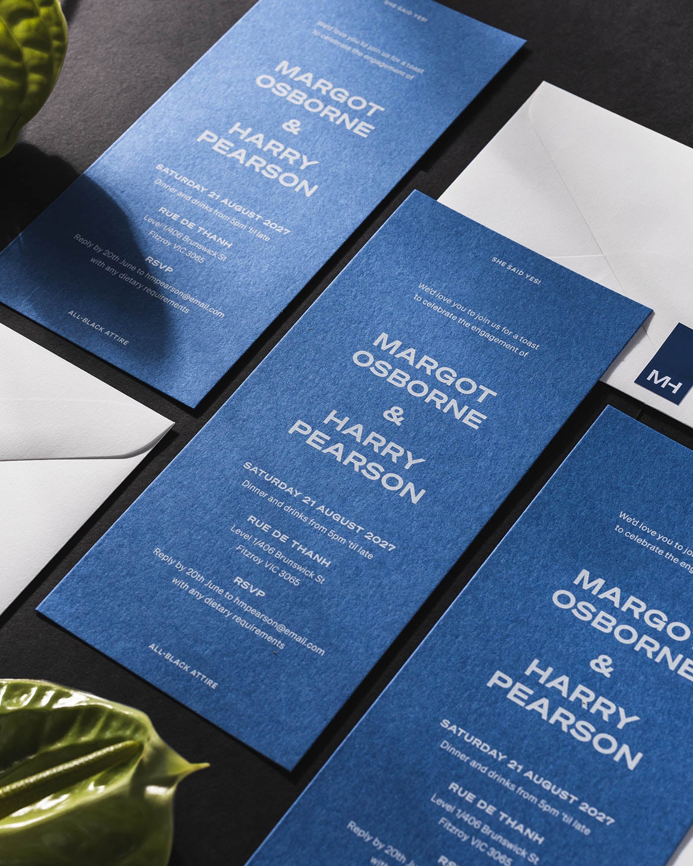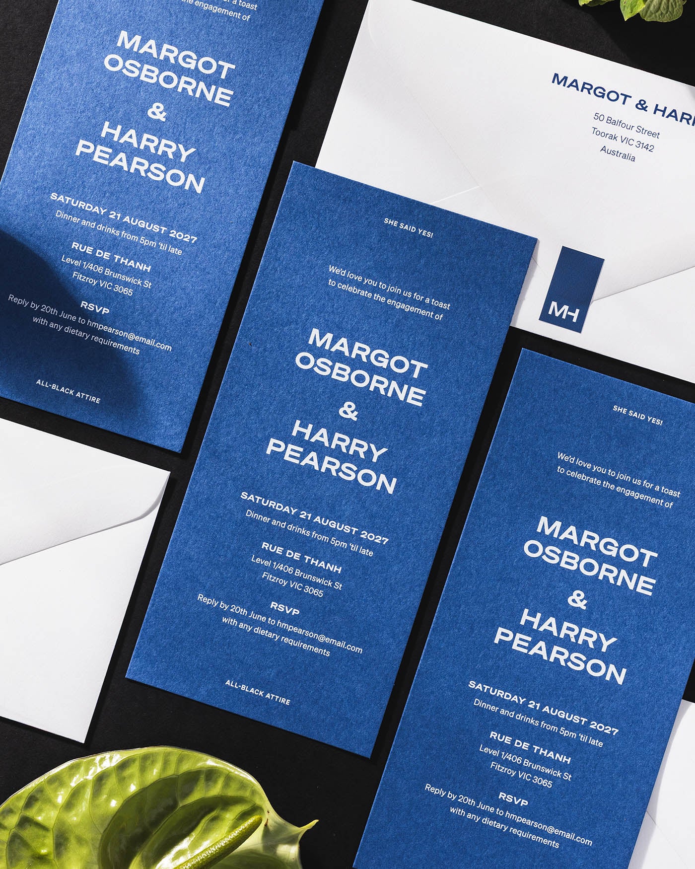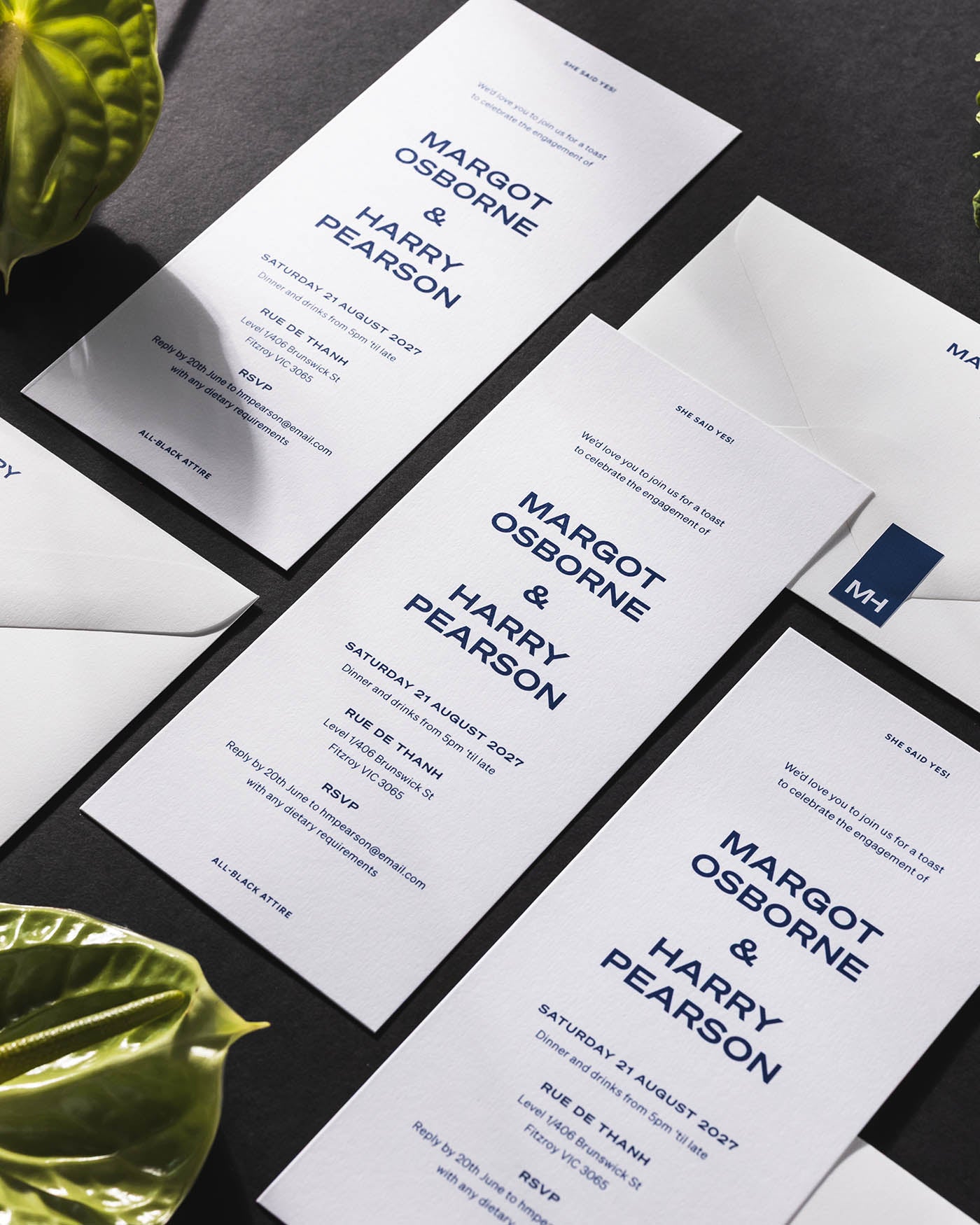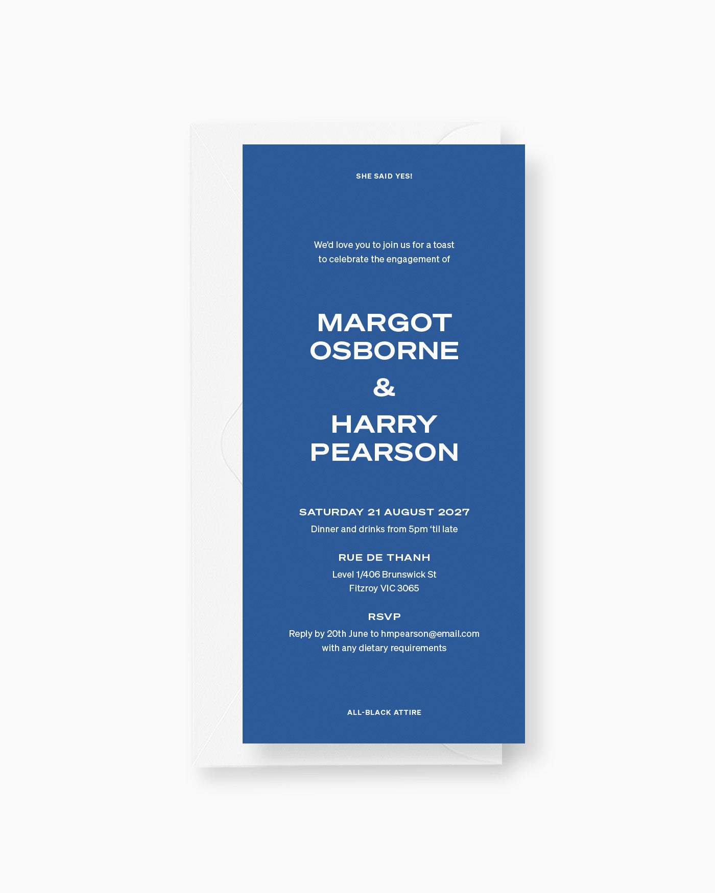 During the design process, you will be able to customise the colour, shape and wording of your engagement invitations. Although a white envelope will be included, you are also free to select a coloured envelope and opt for printed envelopes at an additional cost.