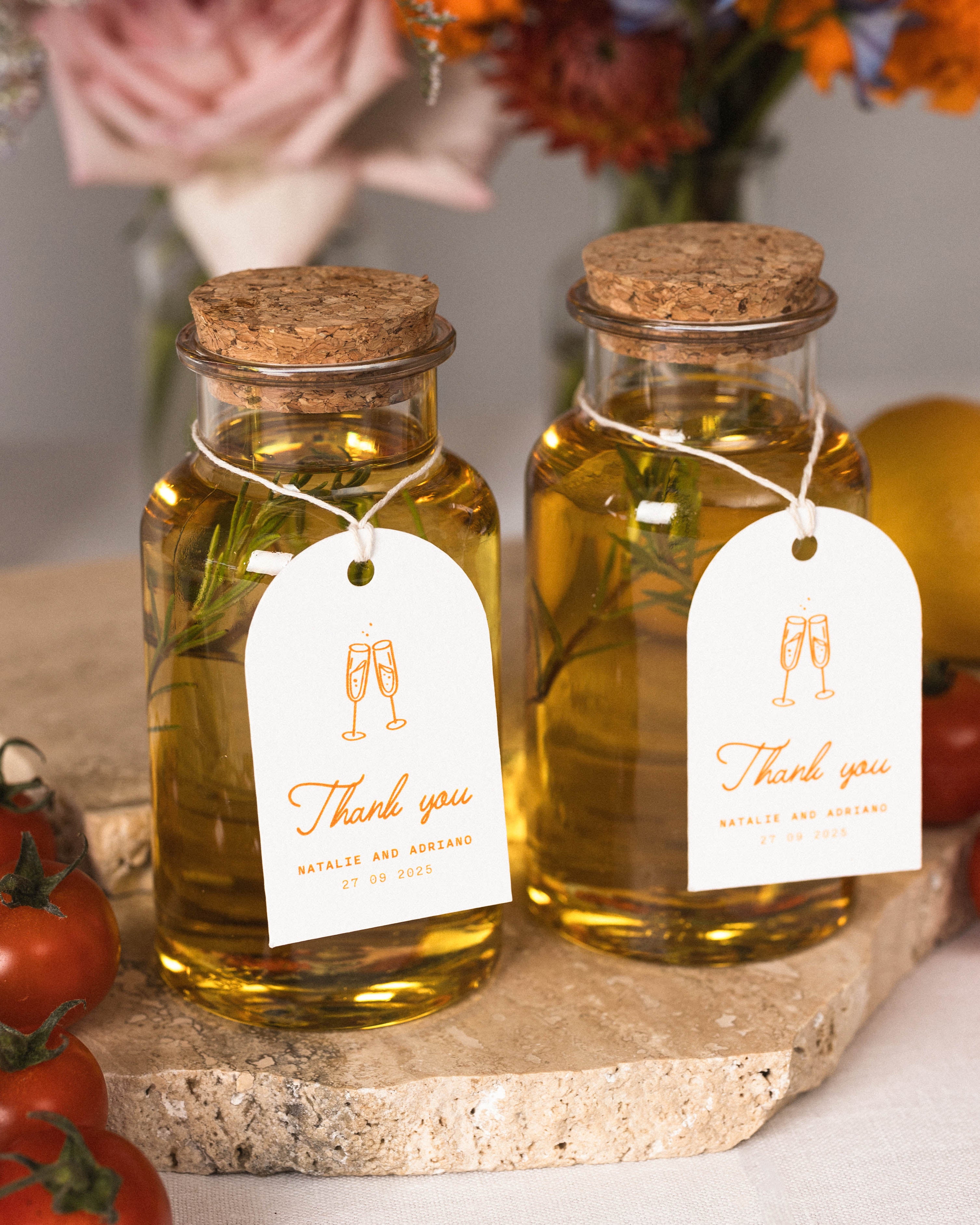 Favour tags typically feature the couple's names, the wedding date, perhaps a thank-you message, or a short note expressing appreciation to guests.