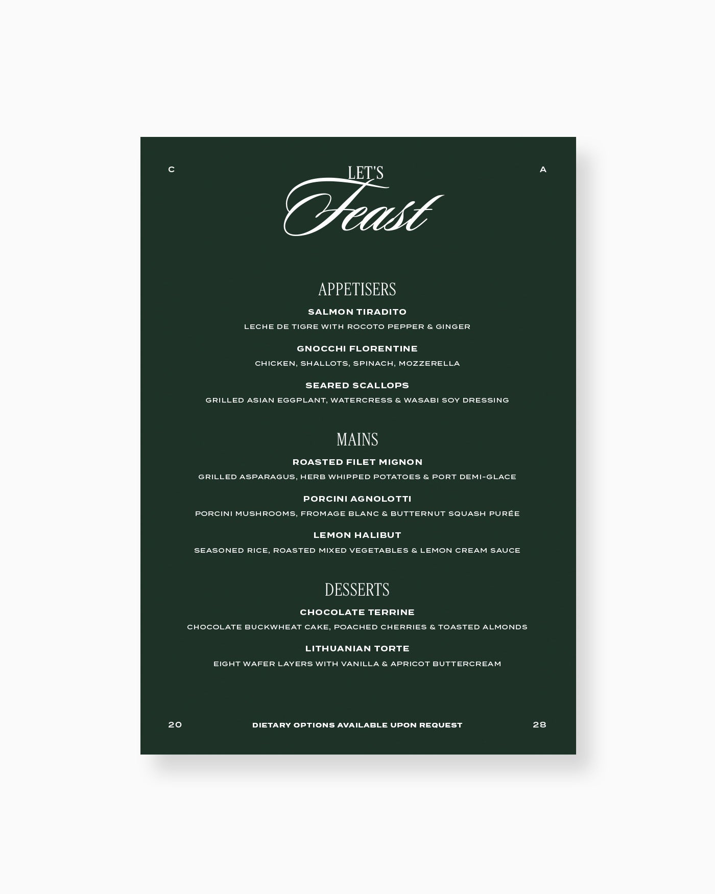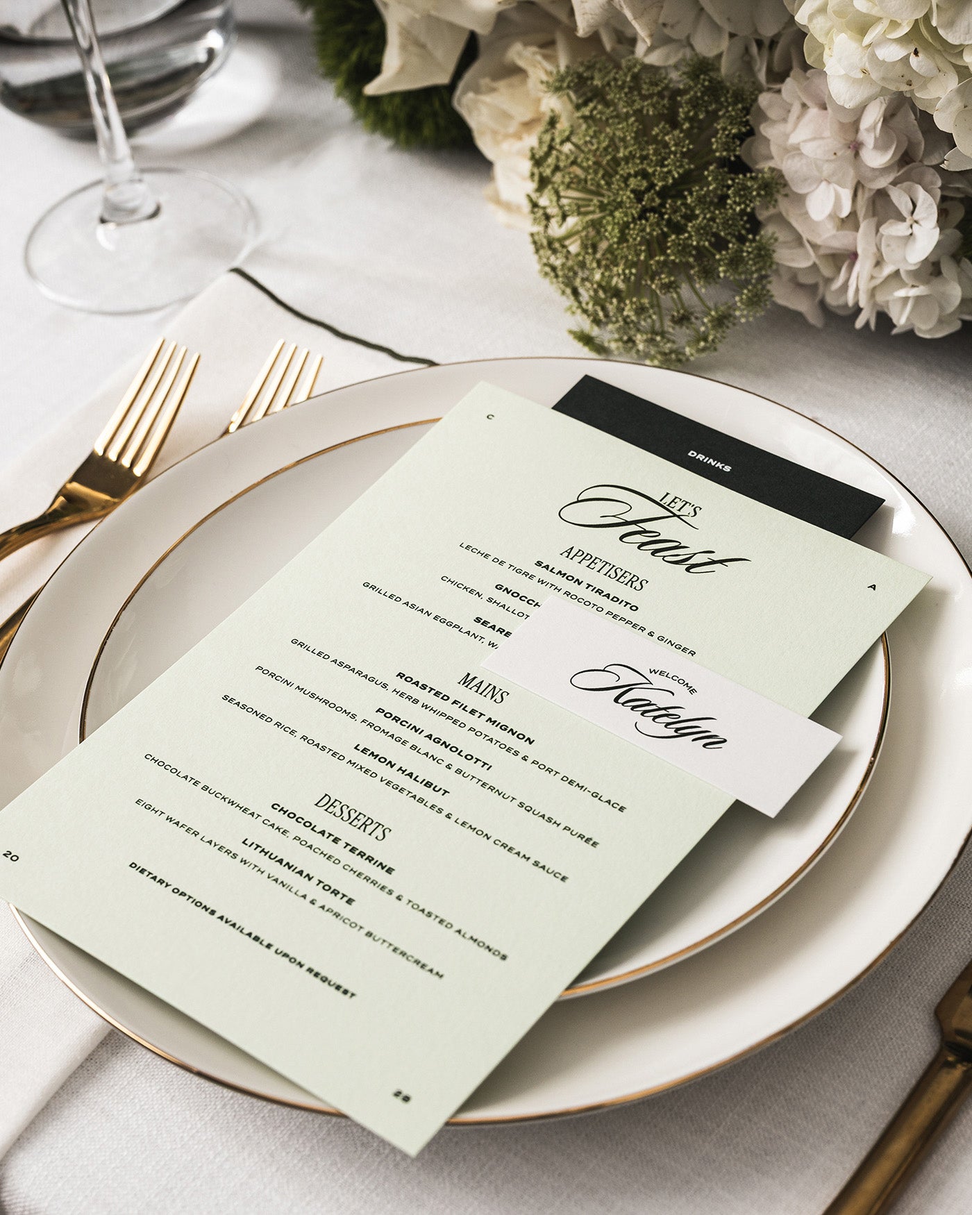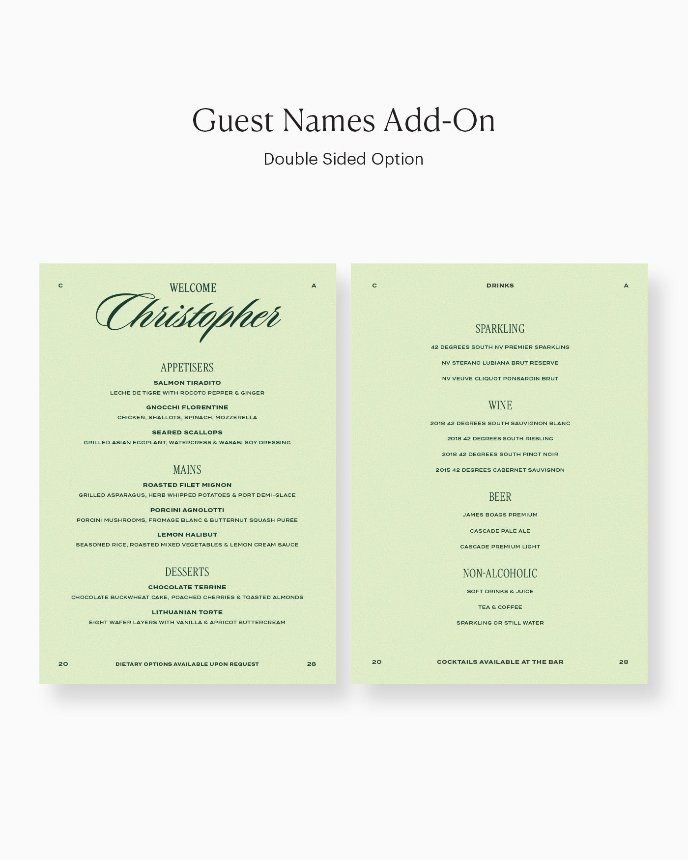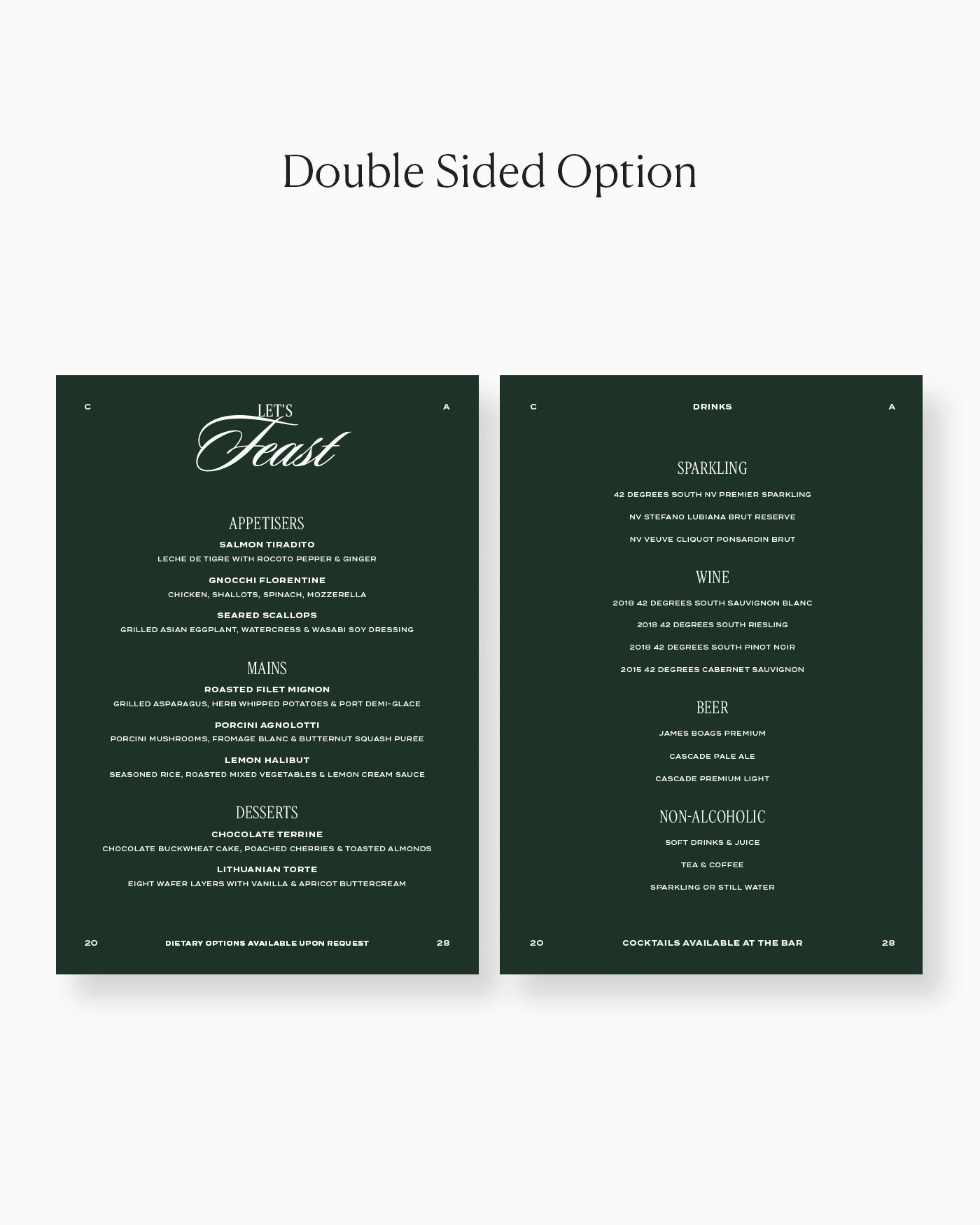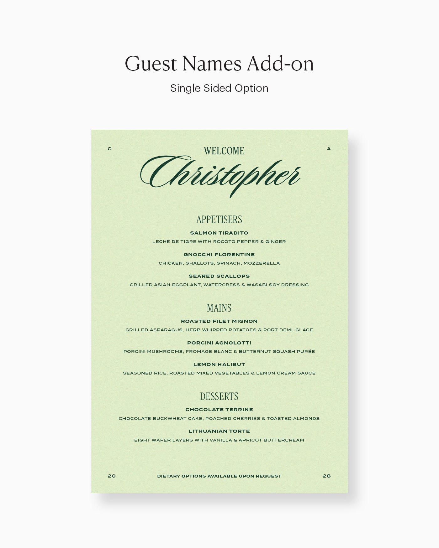Perfect for individual place settings, this menu can be personalised with your event's food selections.