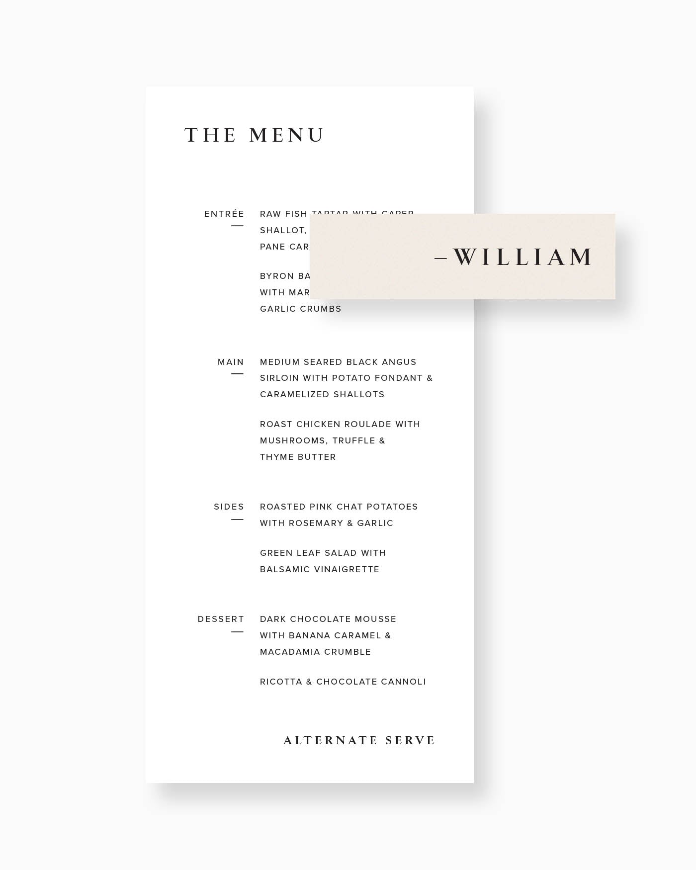 Elevate your wedding experience with the Selena Menu and Place Card Package. Personalised to highlight your course choices, these menus and place cards are printed on luxurious 300-350 GSM thick card stock. Create a stylish and cohesive look for your special day with this personalised package.