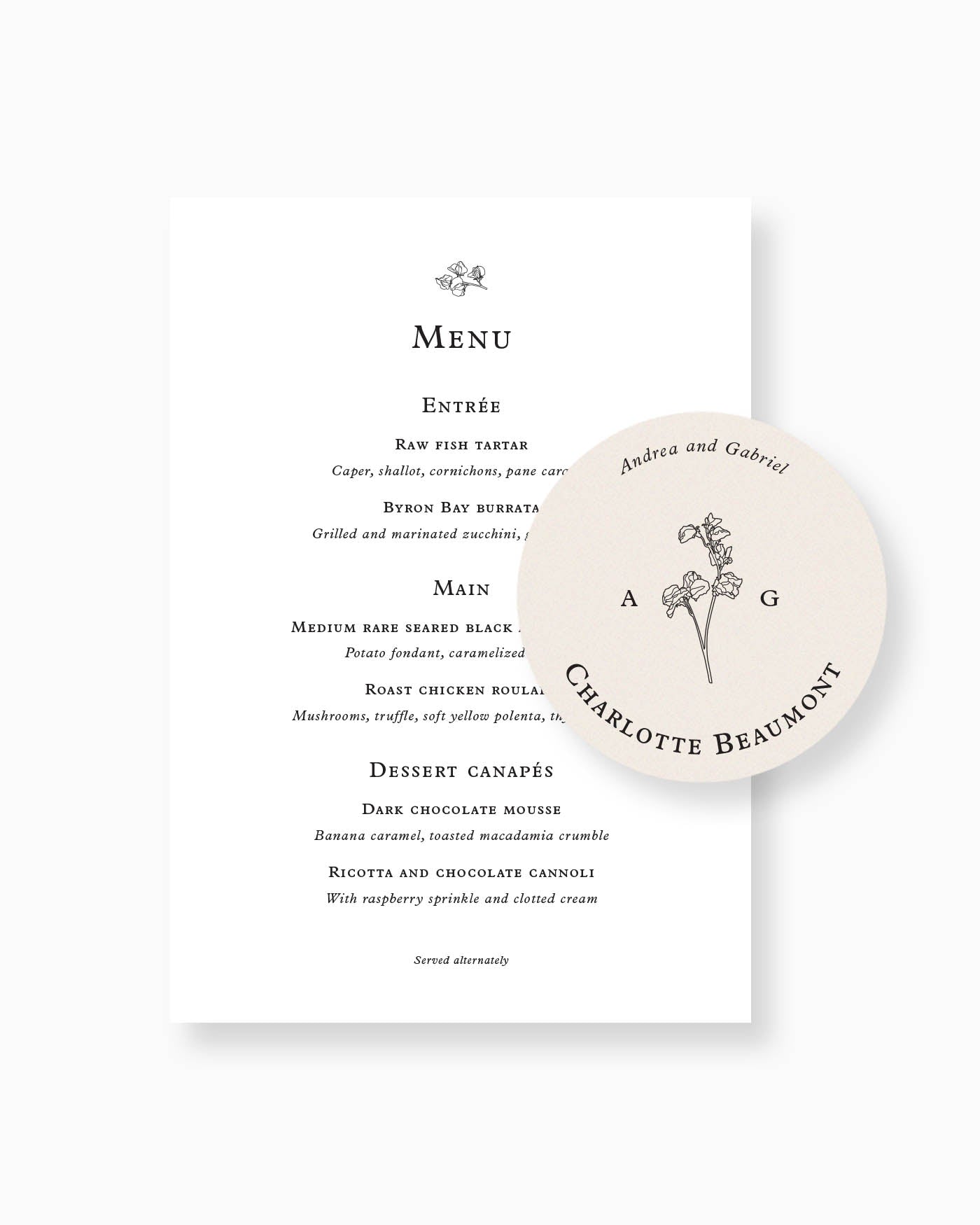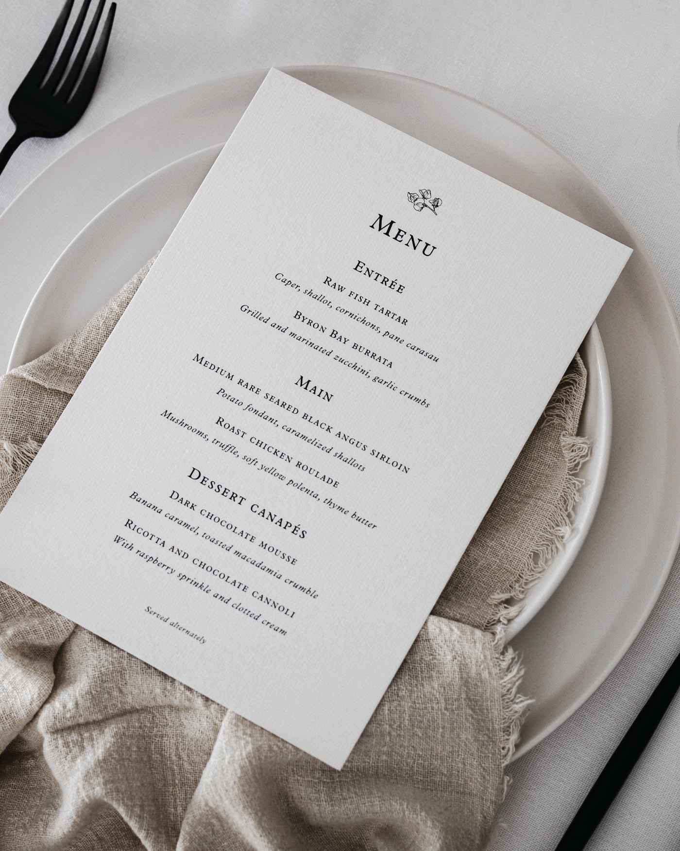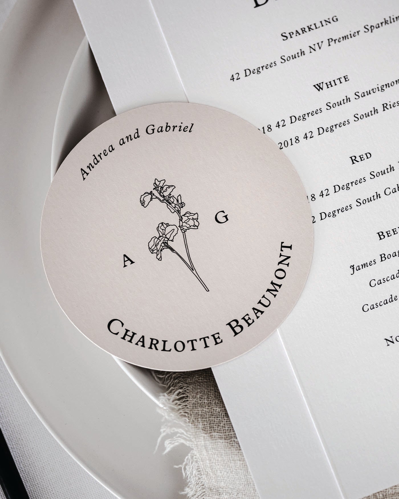 Elevate your wedding experience with the Verona Menu and Place Card Coaster Package. Personalised to highlight your course choices, these menus and place card coasters are printed on luxurious 300-350 GSM thick card stock. Create a stylish and cohesive look for your special day with this personalised package.