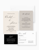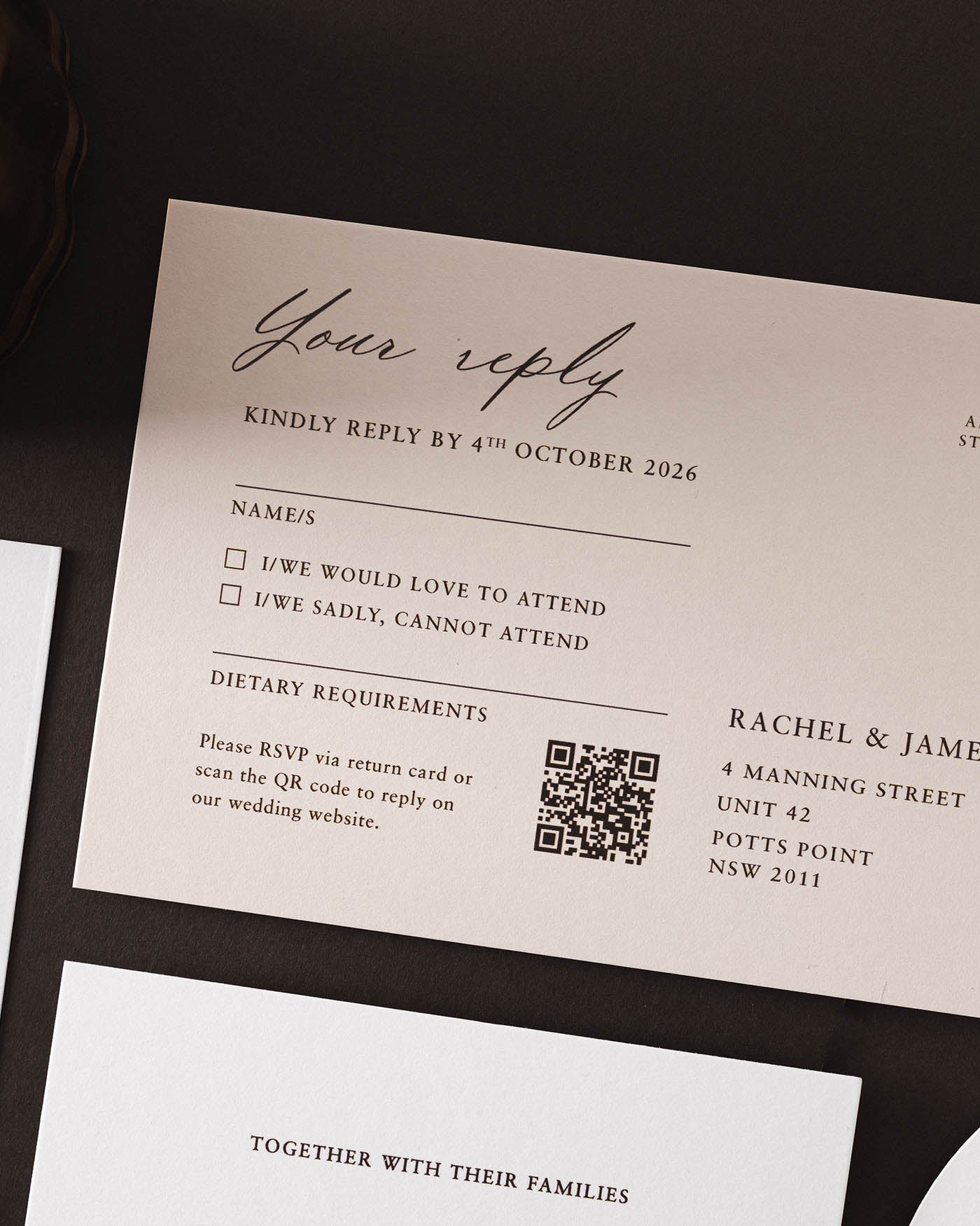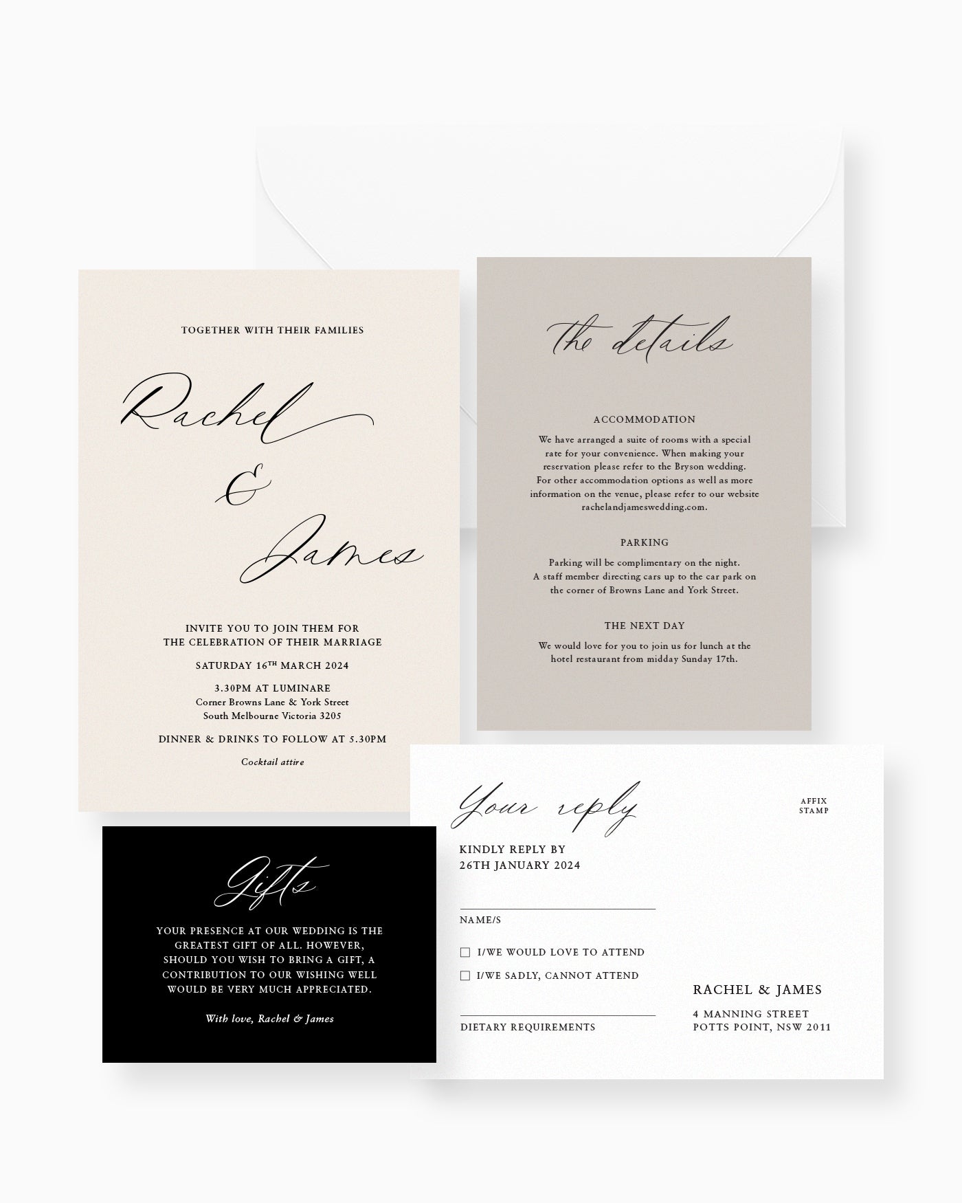 The Amour Four Card Package includes the invitation with a premium white envelope, as well as choice of three enclosure cards. You can choose from the following cards during your design consultation after purchase: