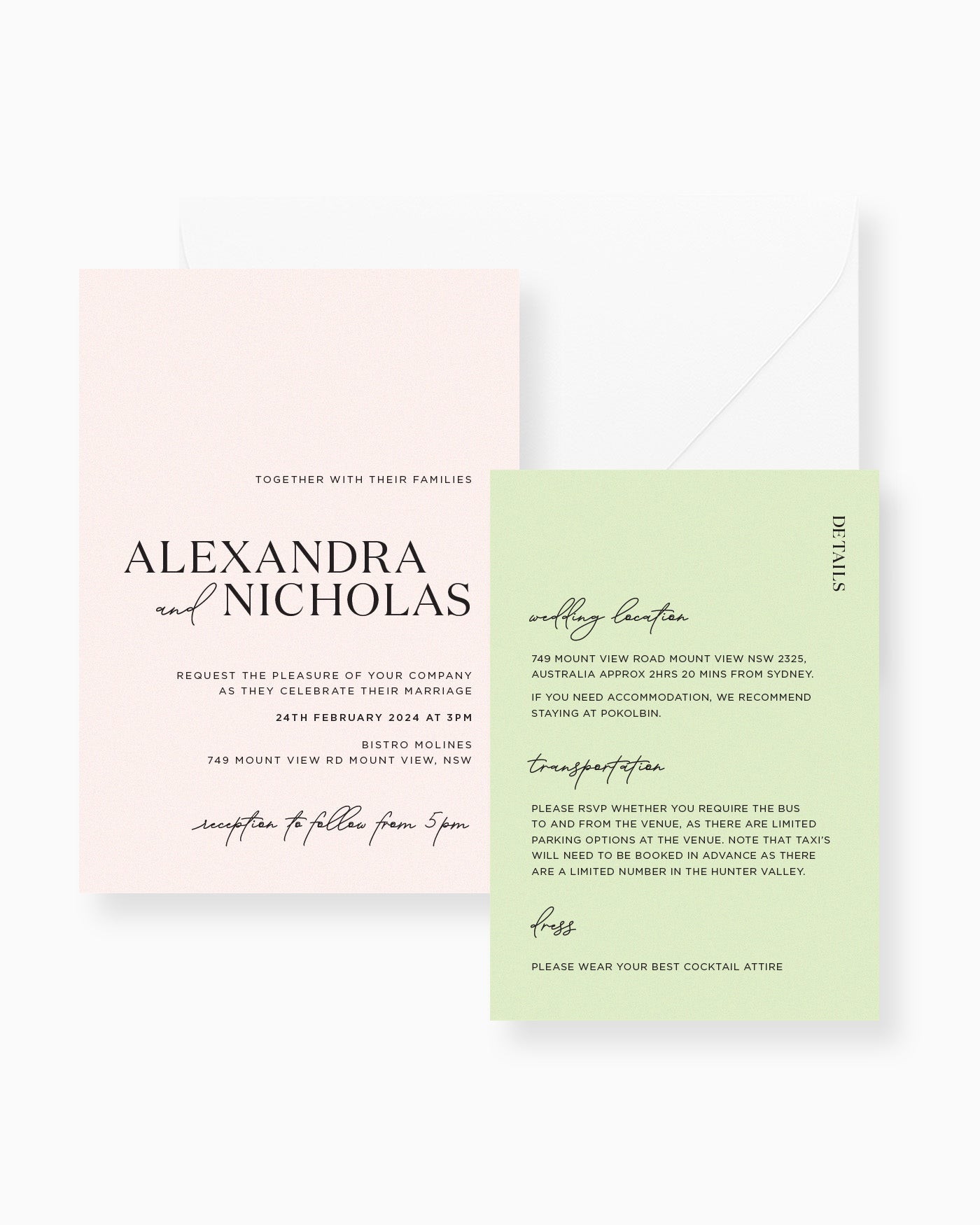 The two card package includes the Wedding Invitation with a premium white envelope, as well as one enclosure card.