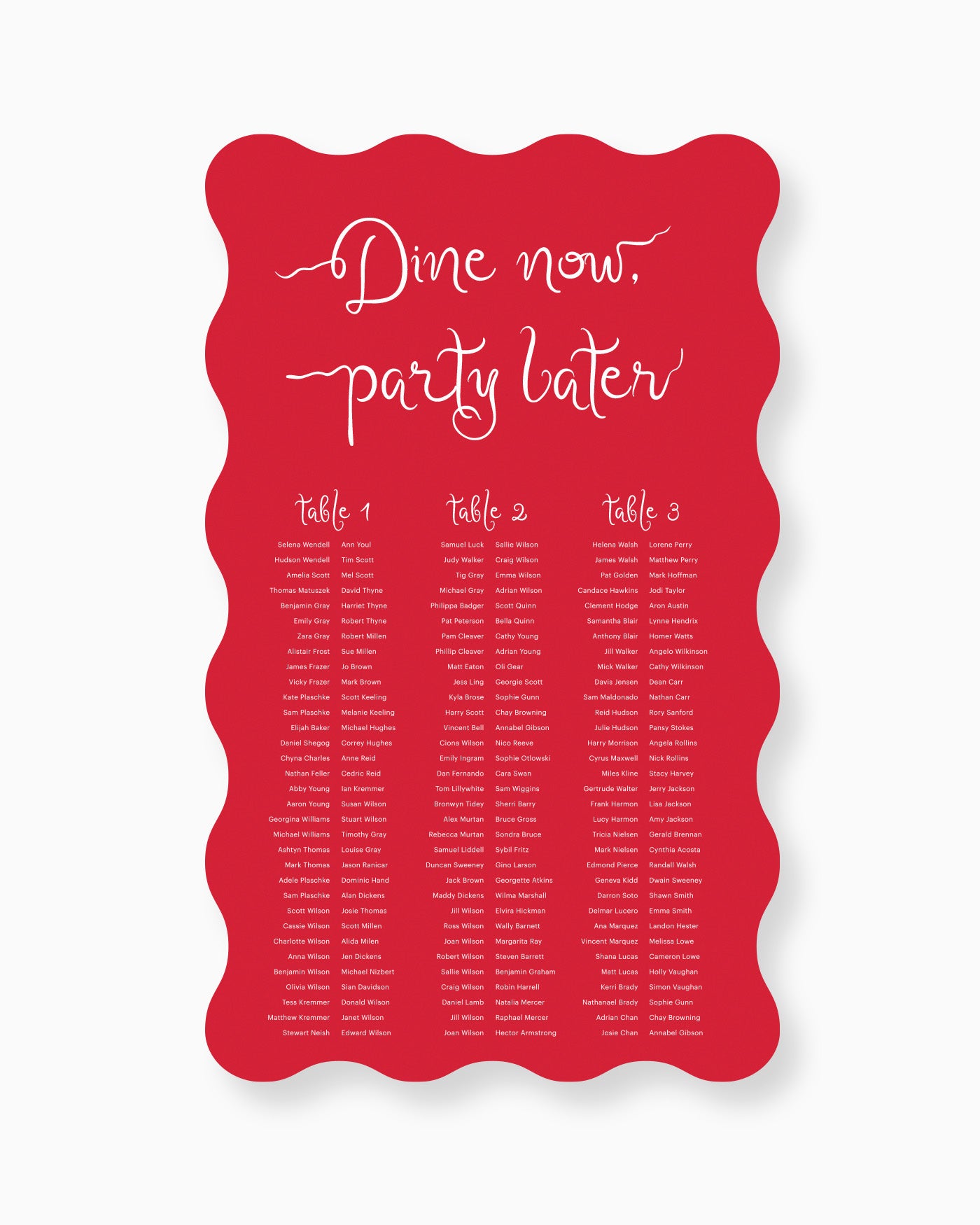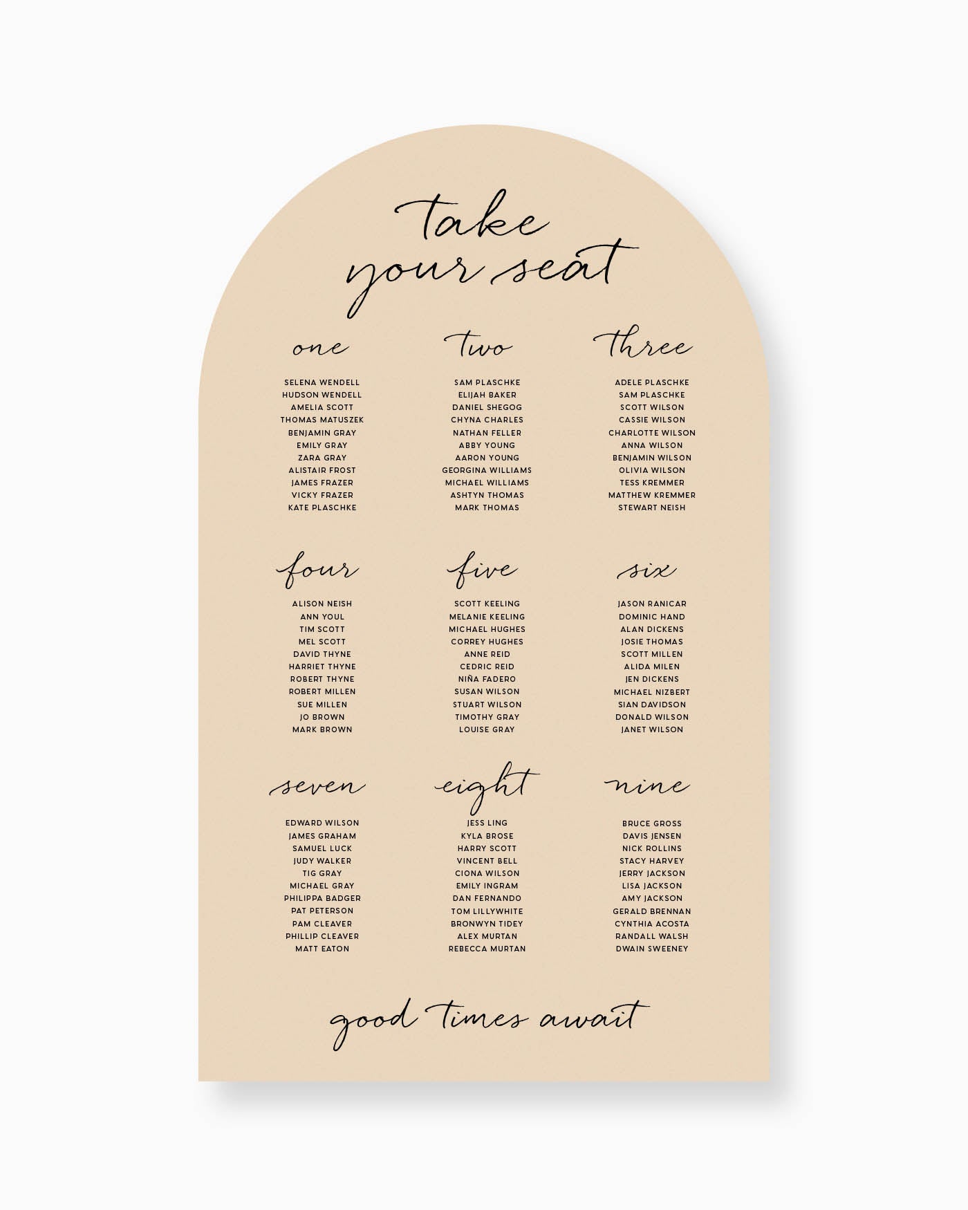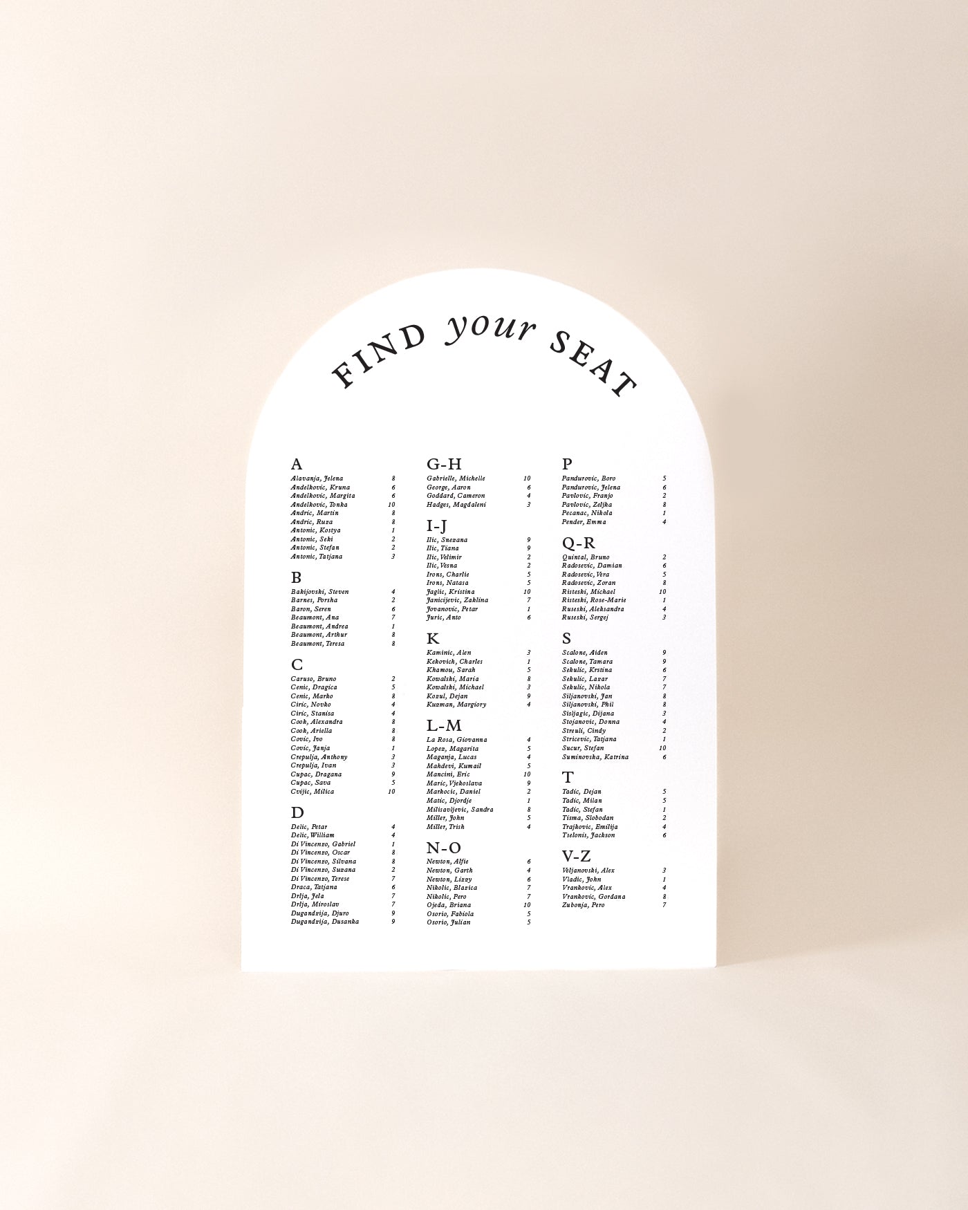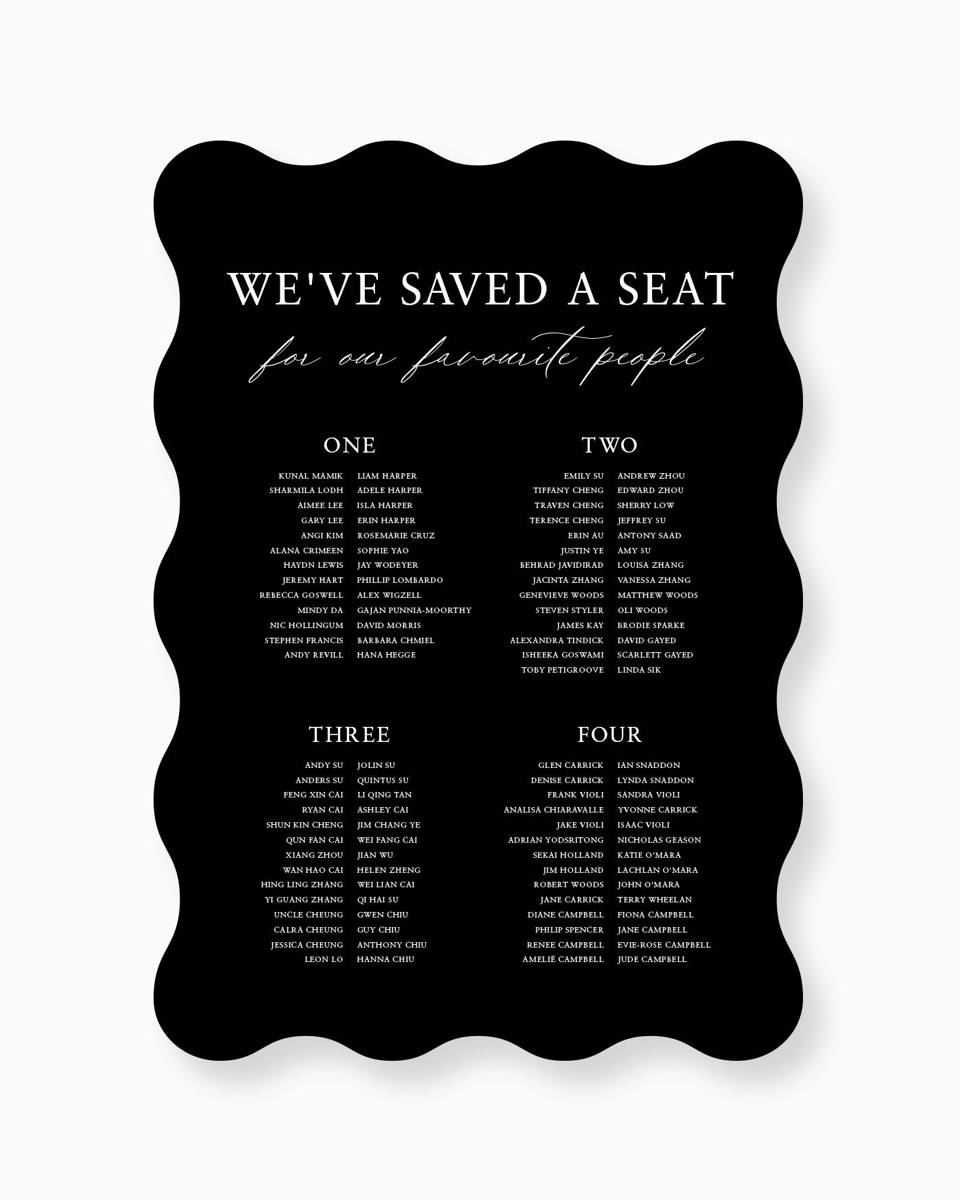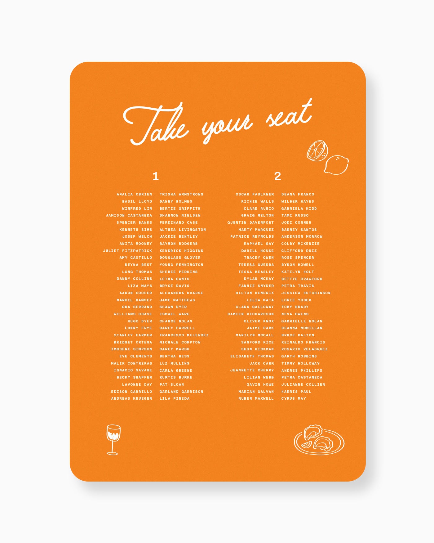 Our seating charts provide an easy way for your guests to quickly find where they are going to be seated at your event. Available in a variety of sizes, you can choose the best one to suit your styling and number of guests, as well as have them cut into a variety of shapes for no additional charge.