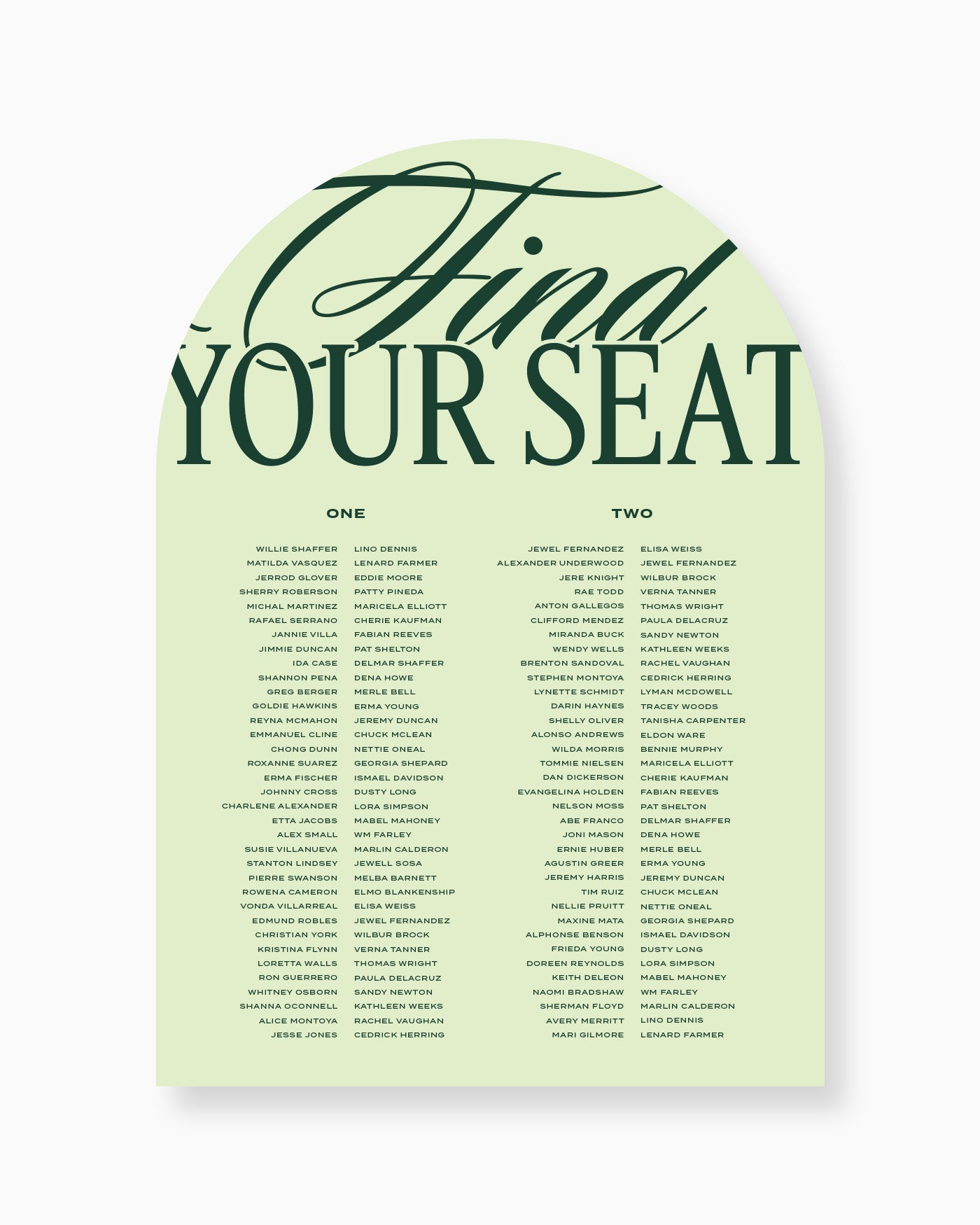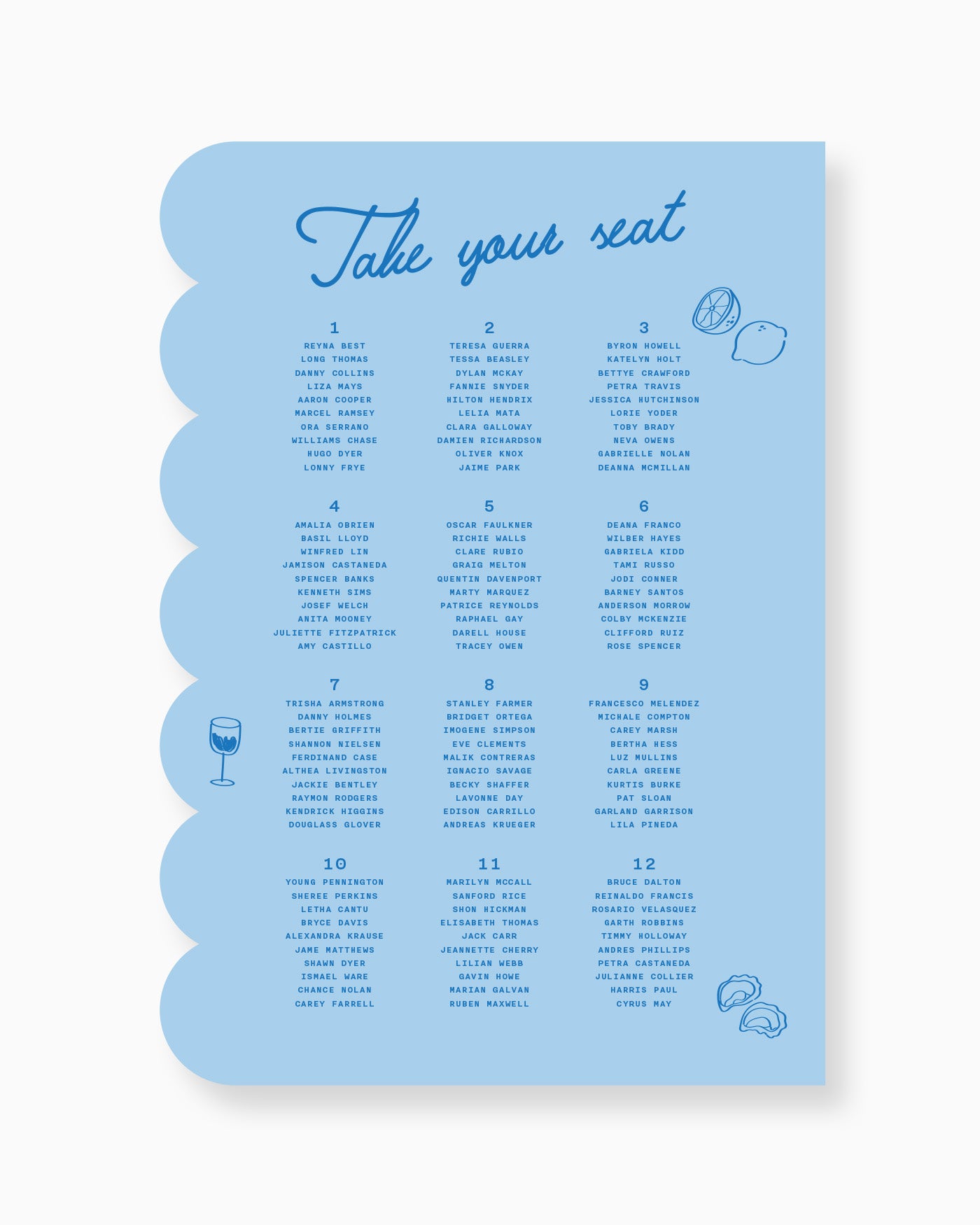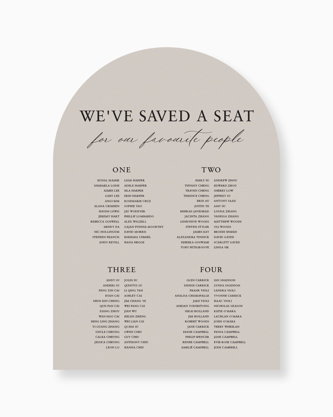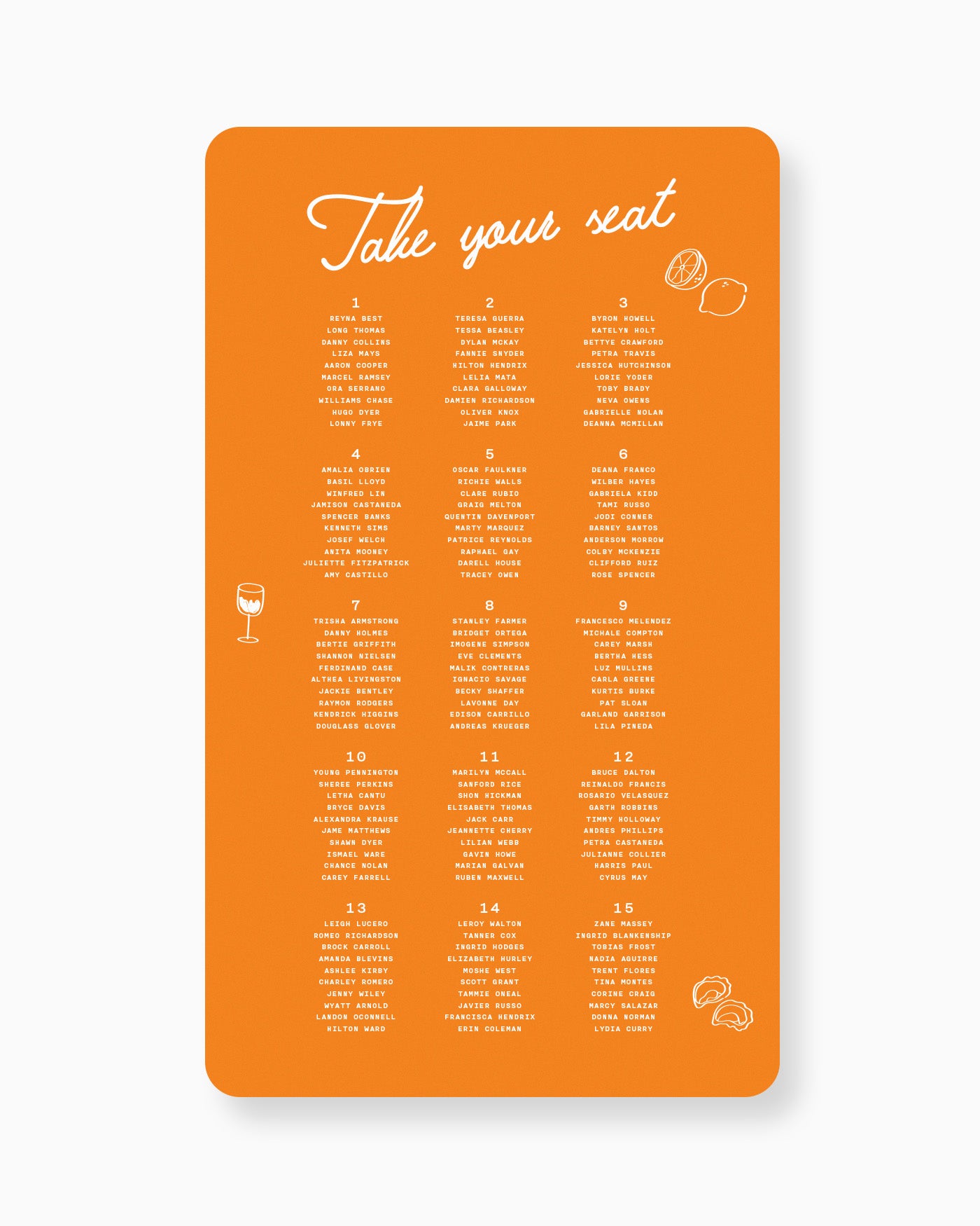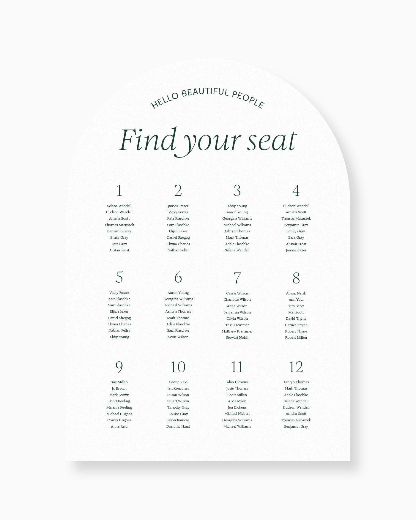 Our seating charts provide an easy way for your guests to quickly find where they are going to be seated at your event. Available in a variety of sizes, you can choose the best one to suit your styling and number of guests, as well as have them cut into a variety of shapes for no additional charge.