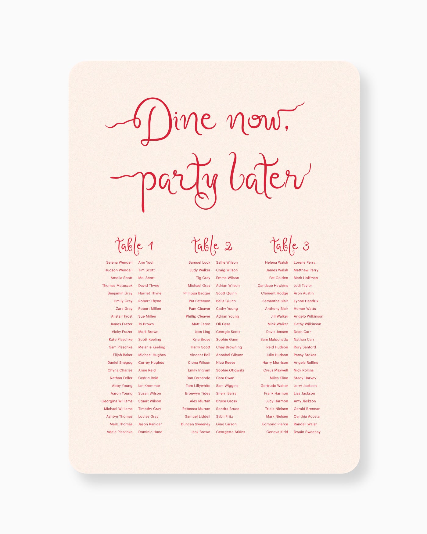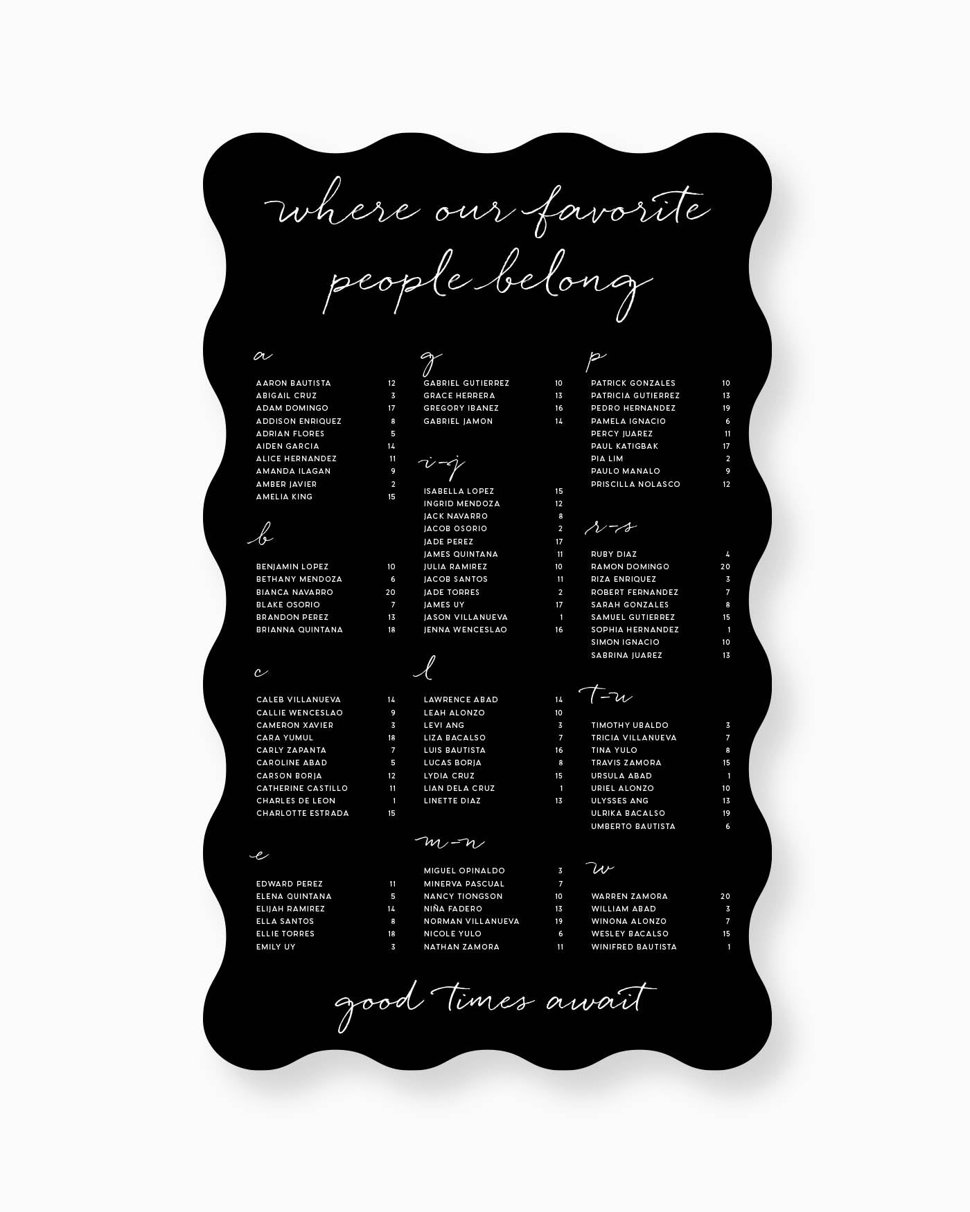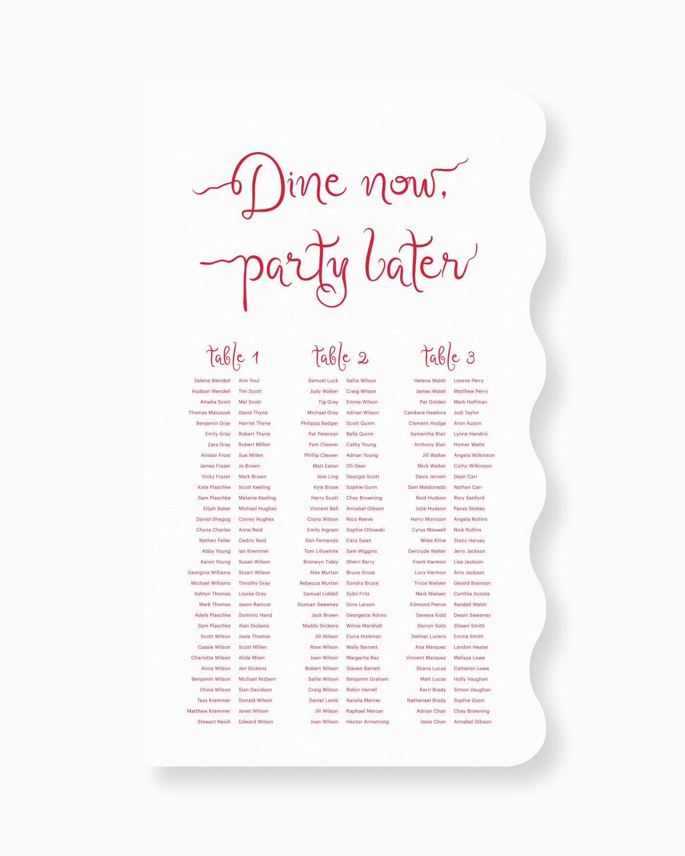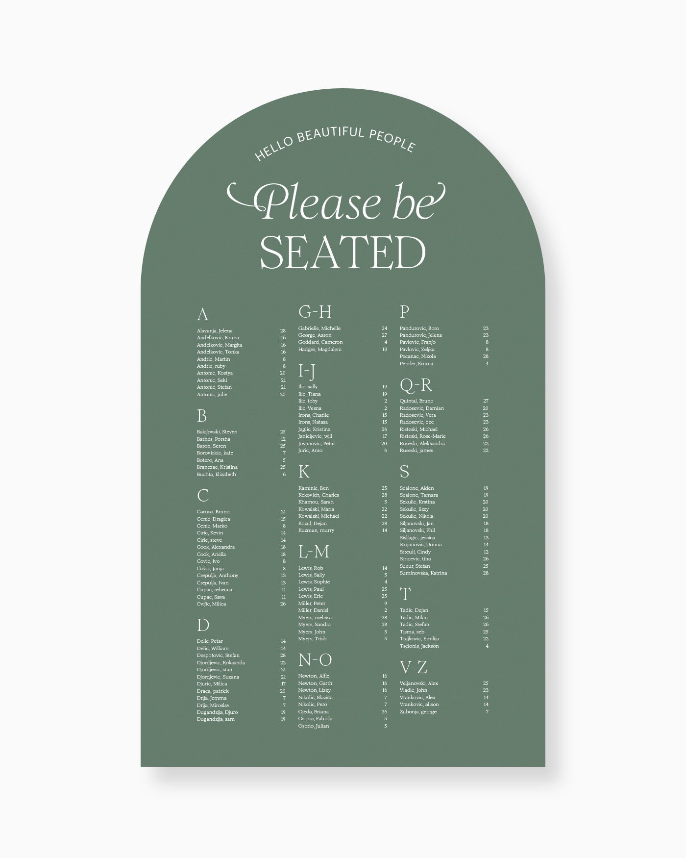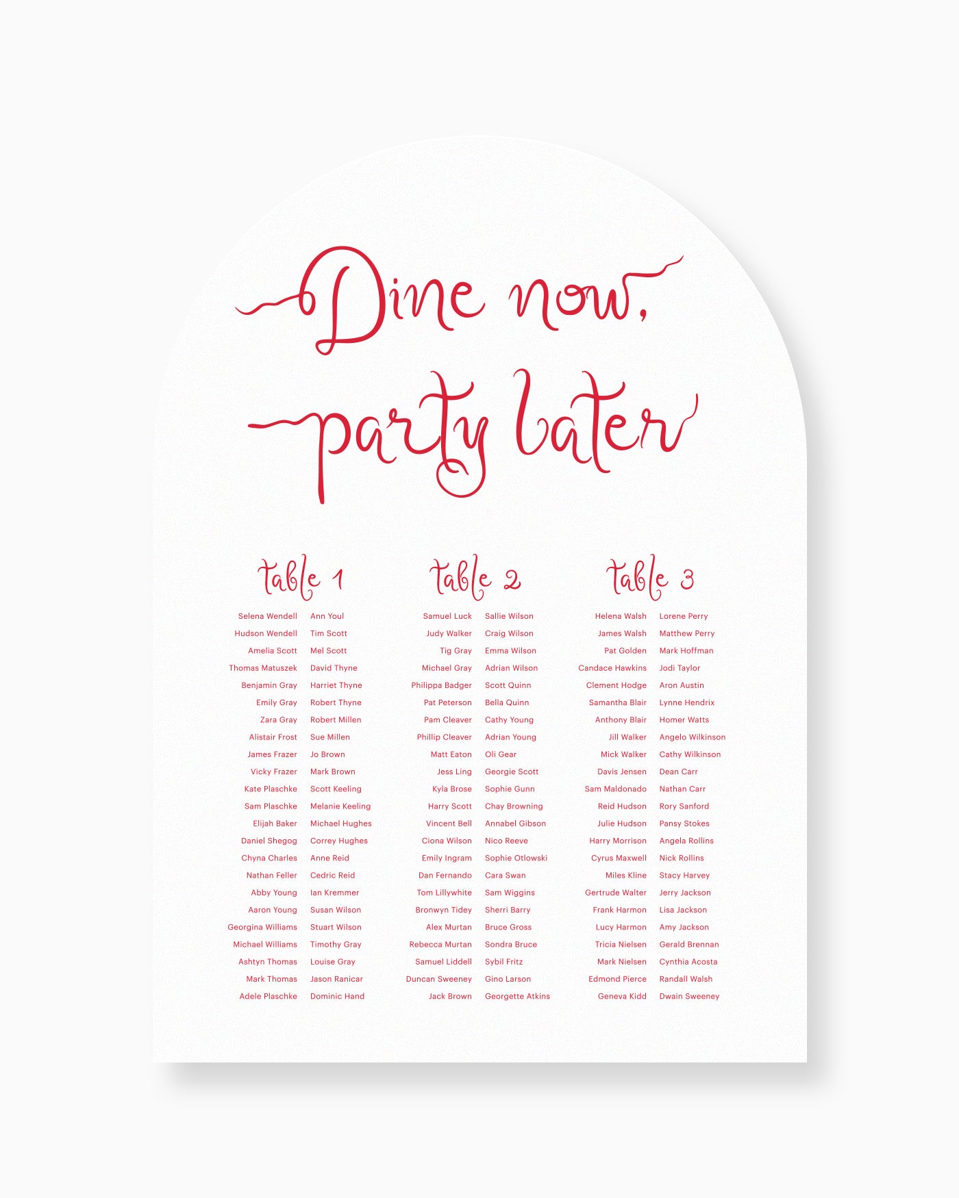 Our seating charts provide an easy way for your guests to quickly find where they are going to be seated at your event. Available in a variety of sizes, you can choose the best one to suit your styling and number of guests, as well as have them cut into a variety of shapes for no additional charge.
