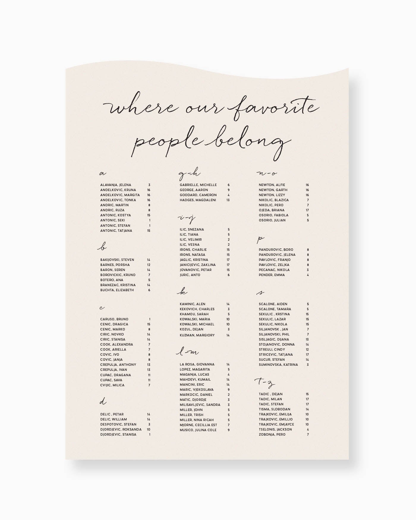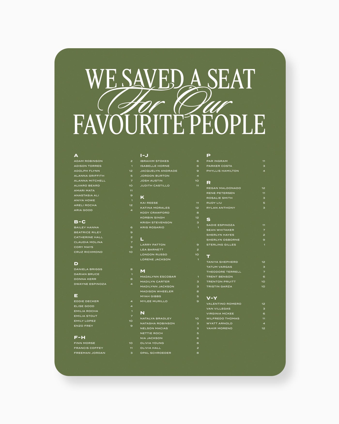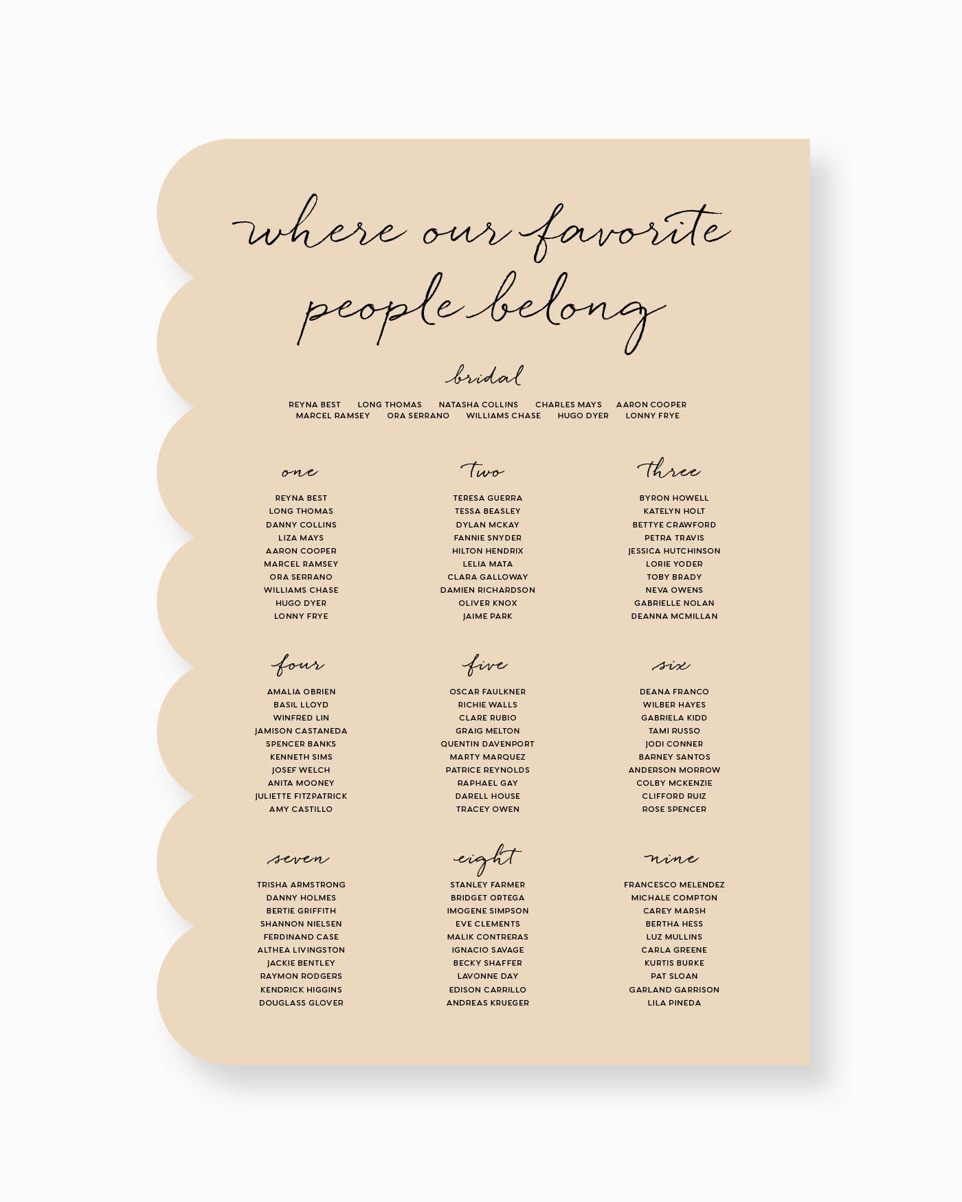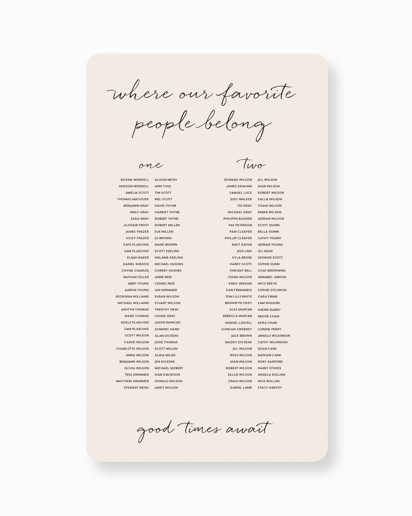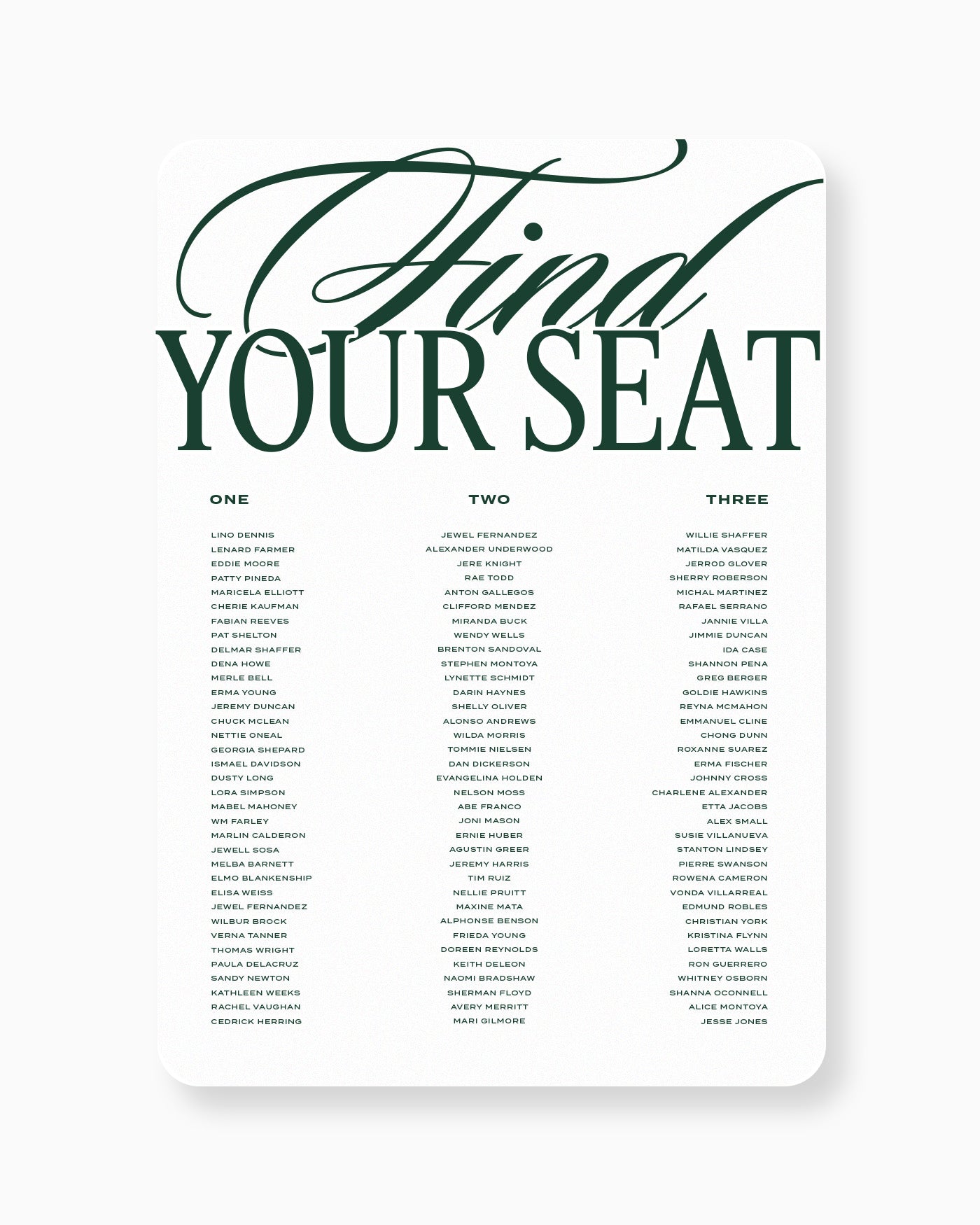 Our seating charts provide an easy way for your guests to quickly find where they are going to be seated at your event. Available in a variety of sizes, you can choose the best one to suit your styling and number of guests, as well as have them cut into a variety of shapes for no additional charge.