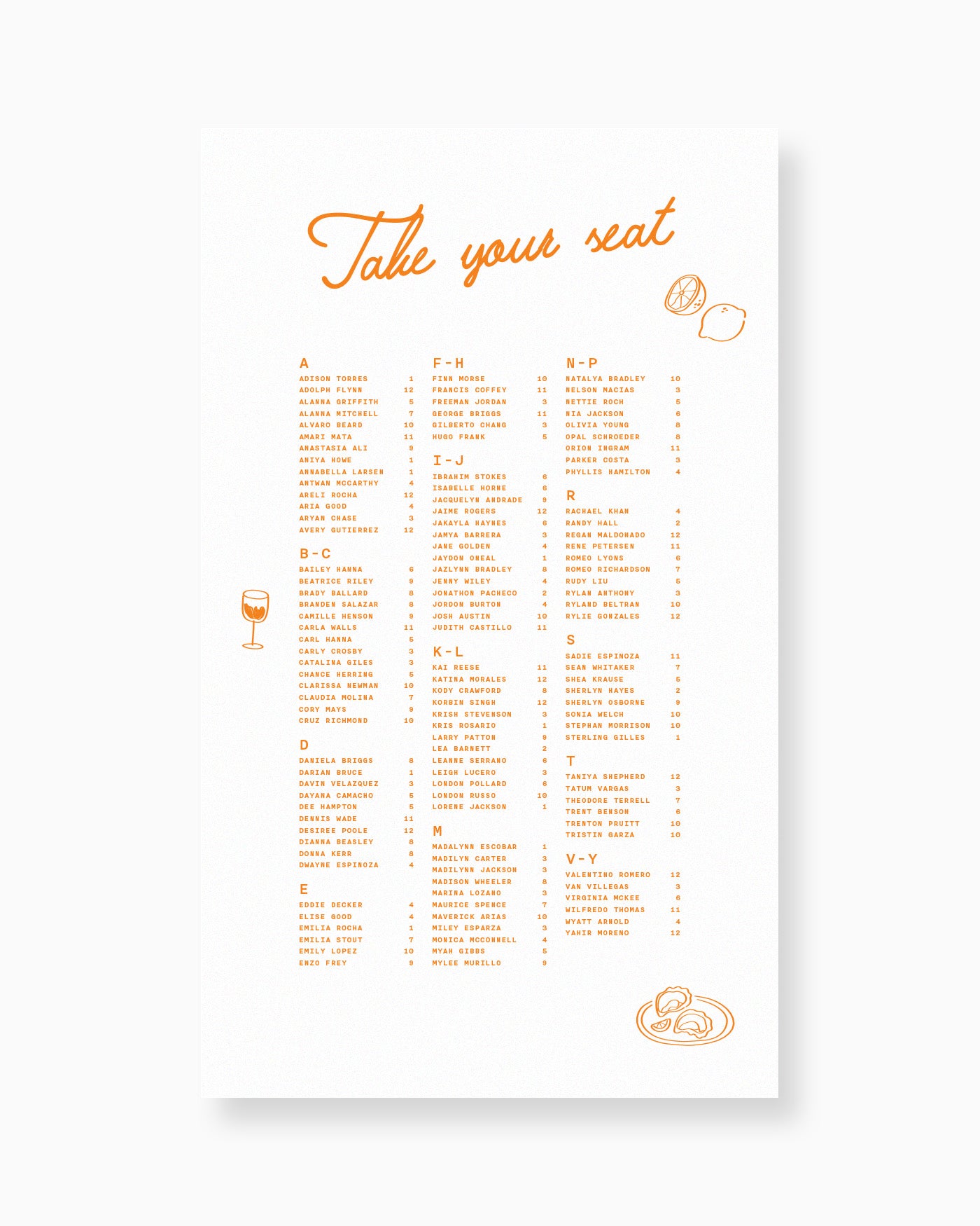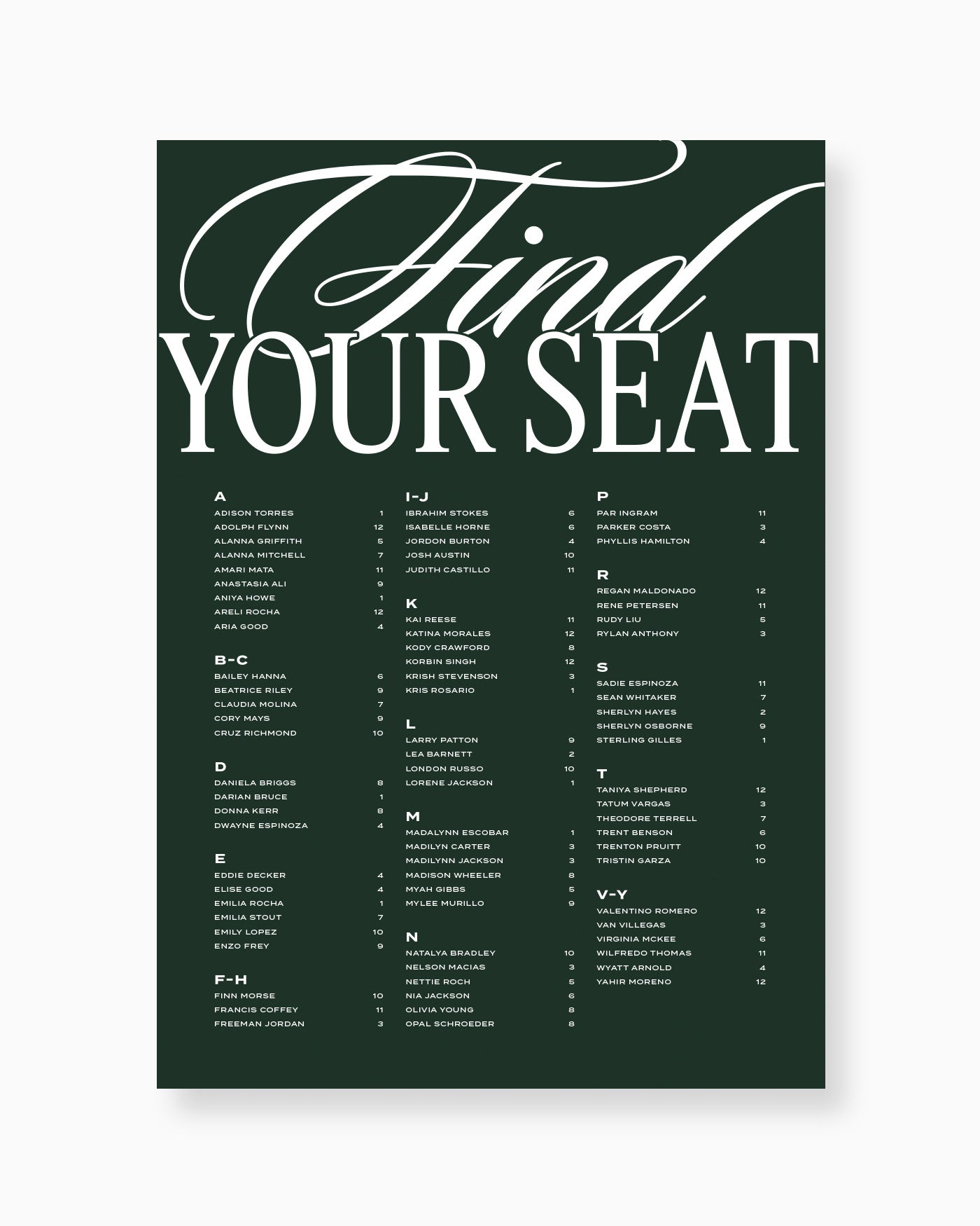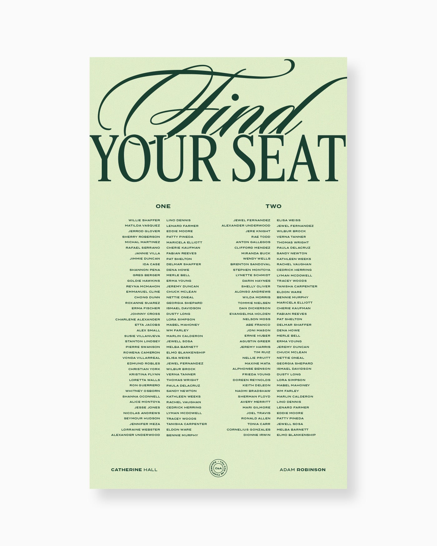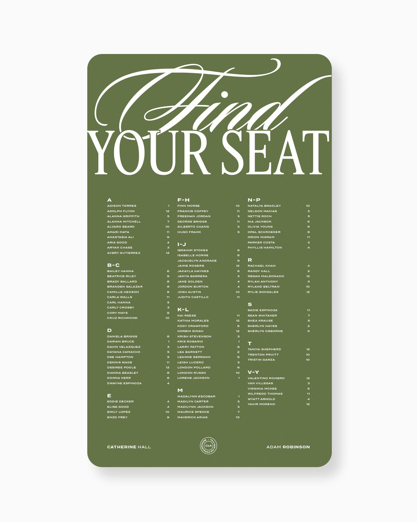 A seating chart with Peppermint Press is beautifully designed to match your wedding theme, often incorporating elegant fonts, decorative elements, and a clear layout.