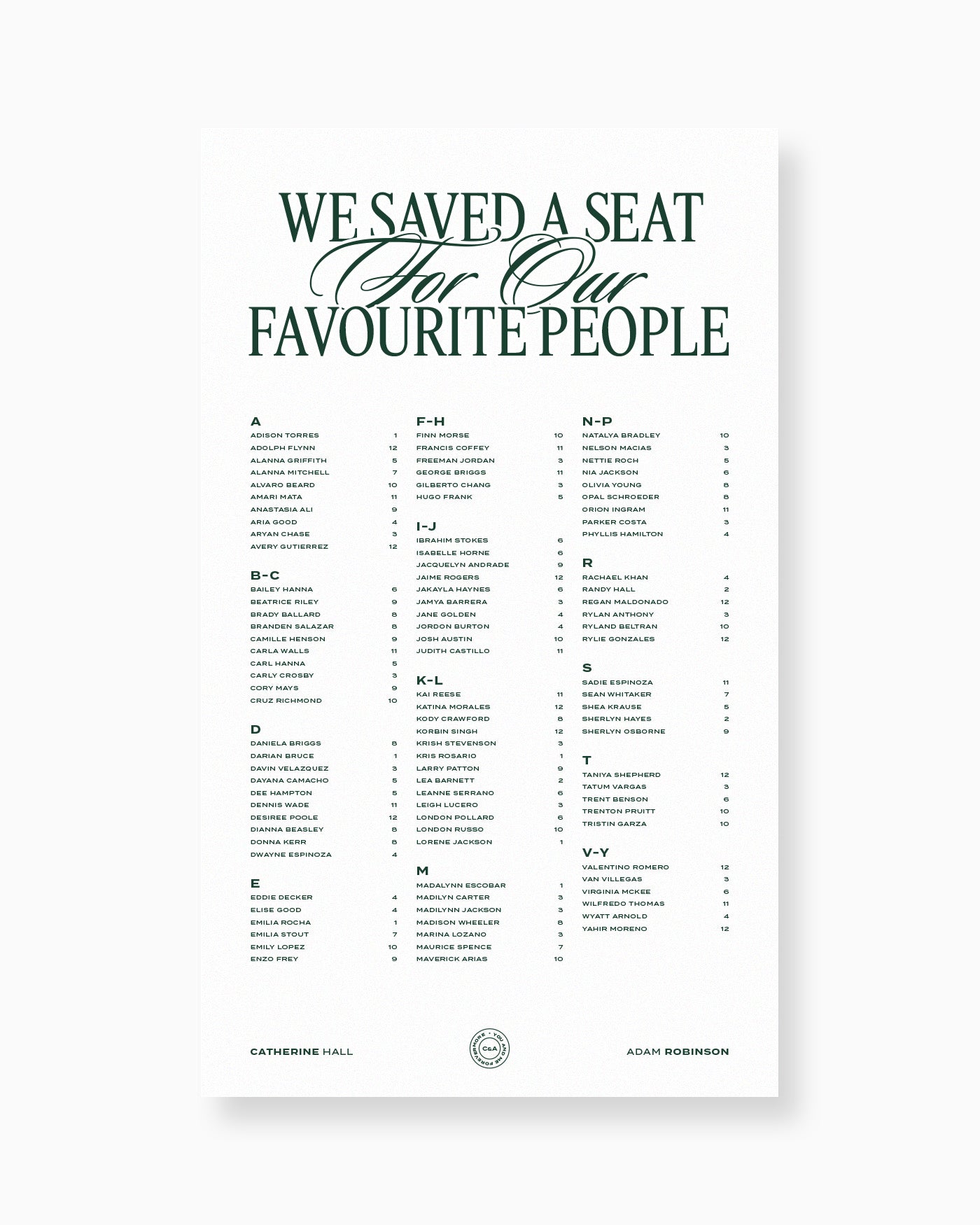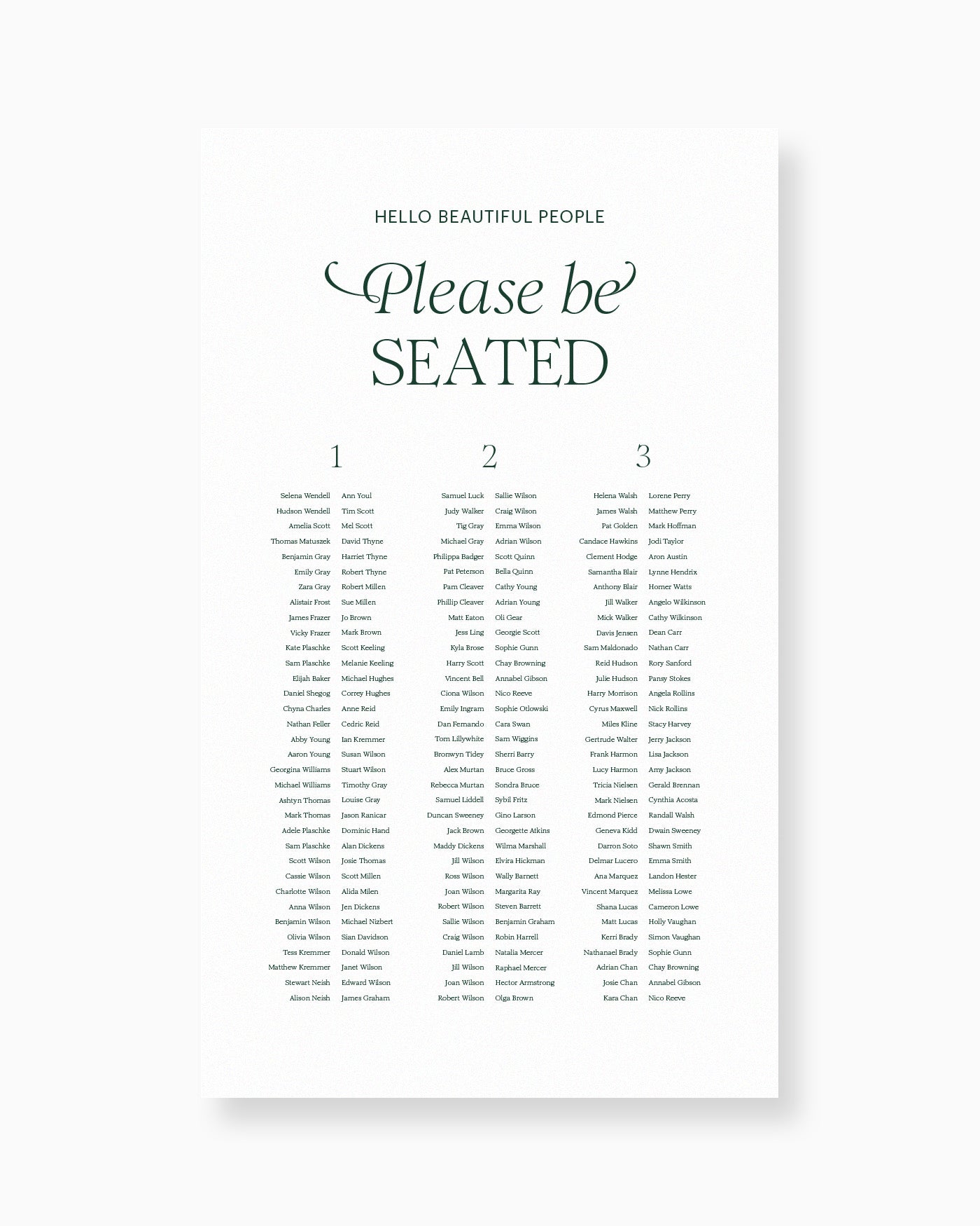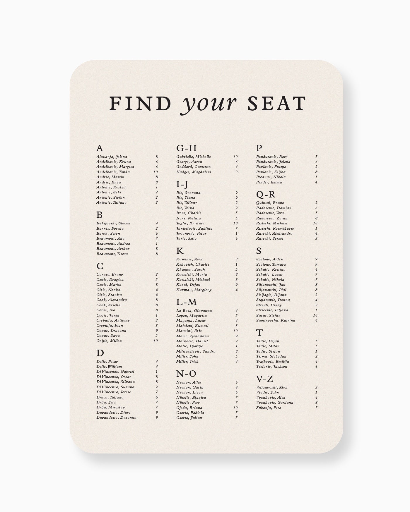 Once you have ordered a wedding seating chart on our website, one of our expert designers will be in touch to help you navigate the process. Through the use of our design questionnaire and feedback rounds, you’ll swiftly arrive at the perfect seating chart, requesting amendments where you see it necessary.