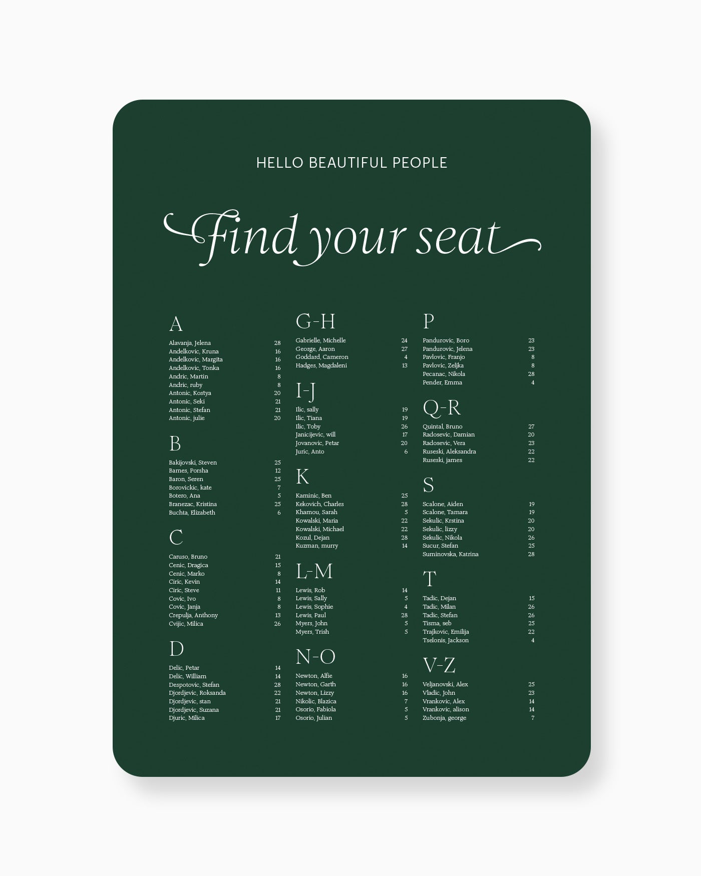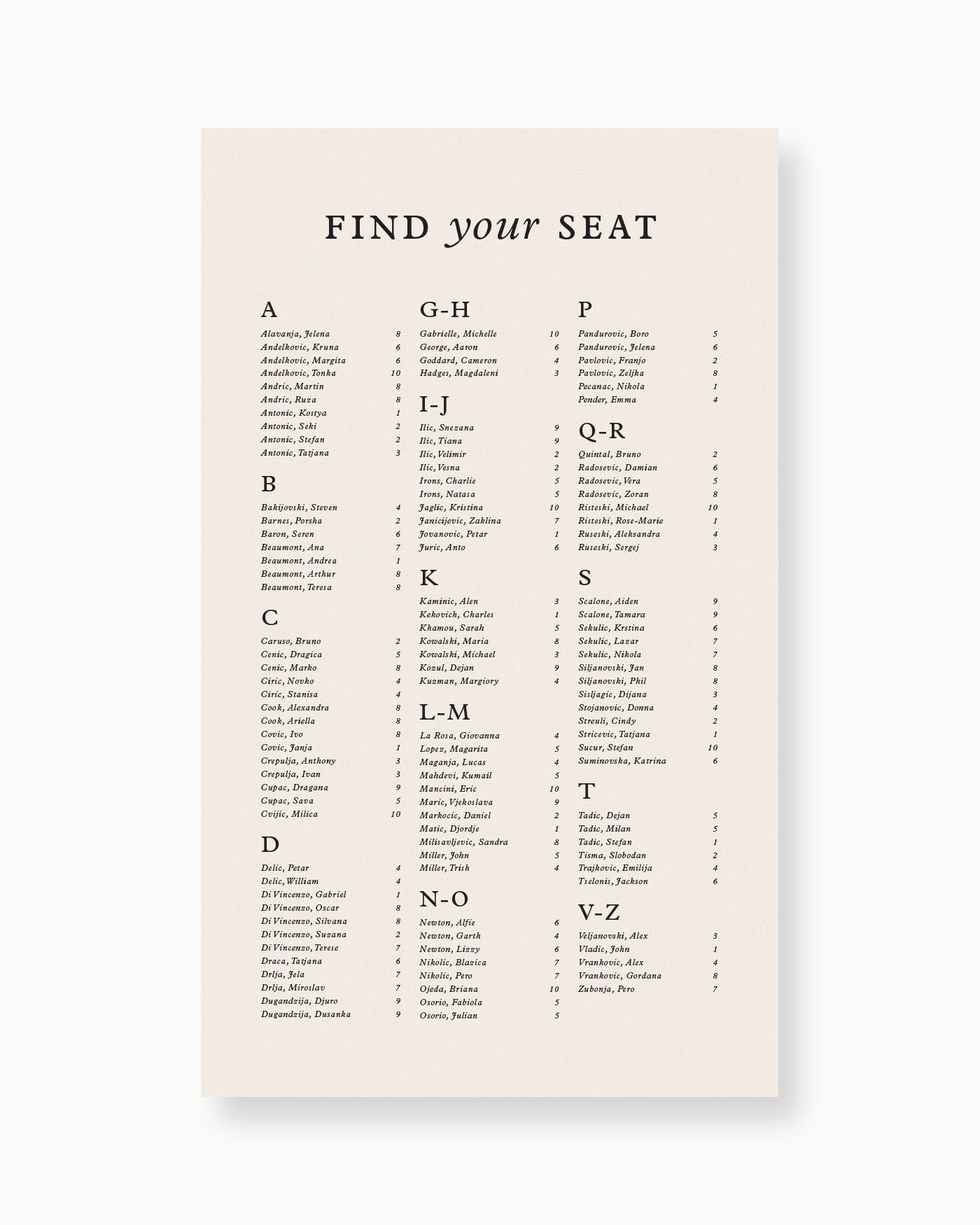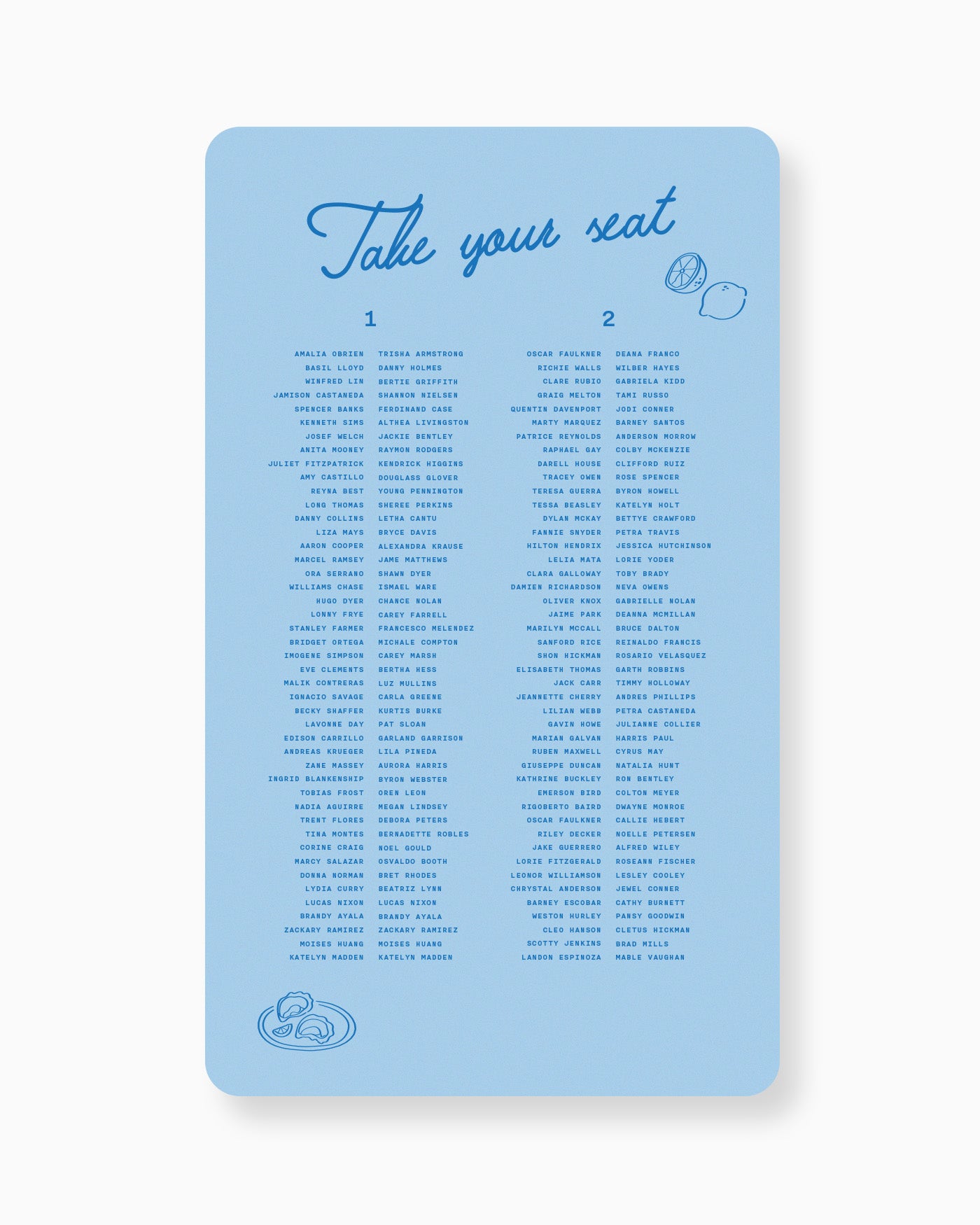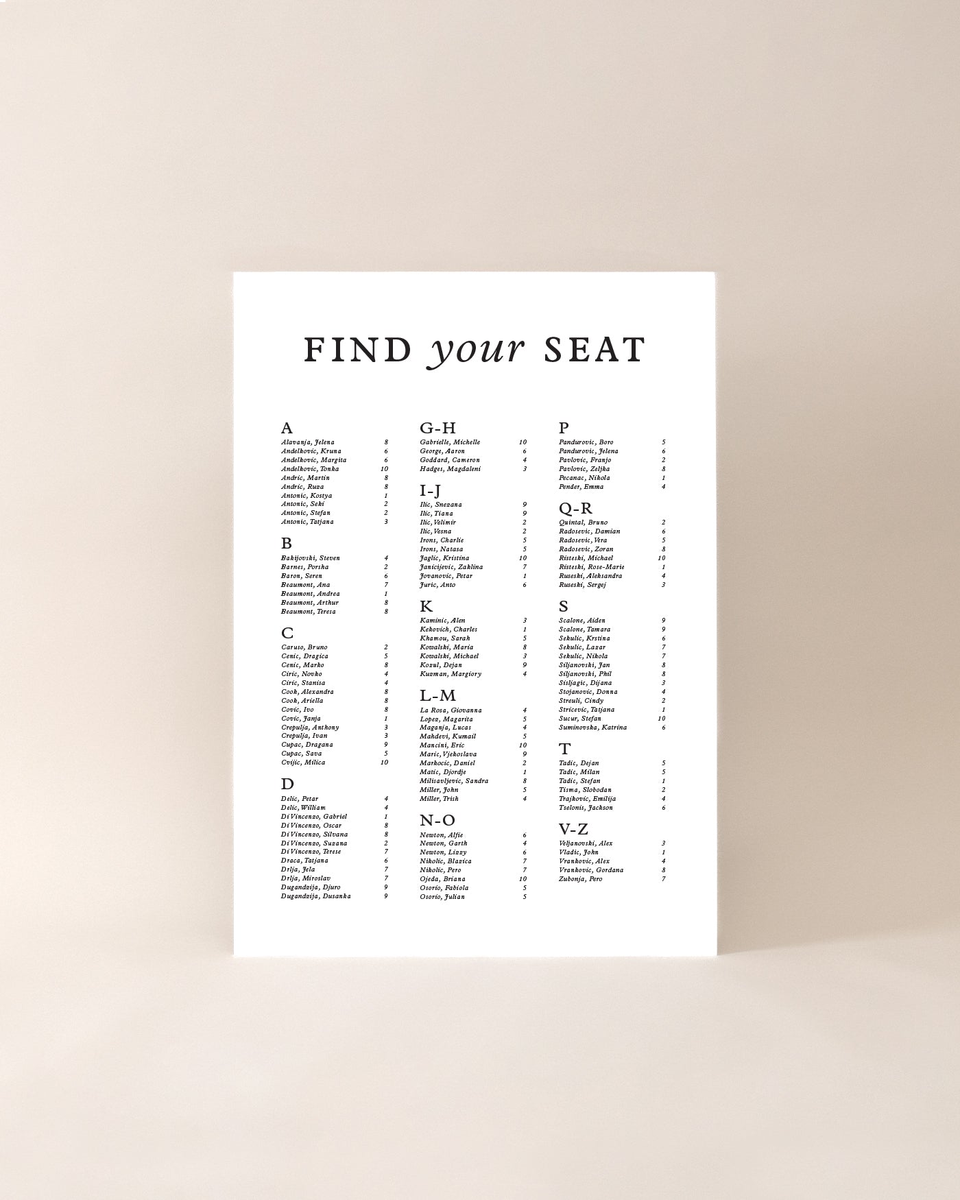 Once you have ordered a wedding seating chart on our website, one of our expert designers will be in touch to help you navigate the process. Through the use of our design questionnaire and feedback rounds, you’ll swiftly arrive at the perfect seating chart, requesting amendments where you see it necessary.