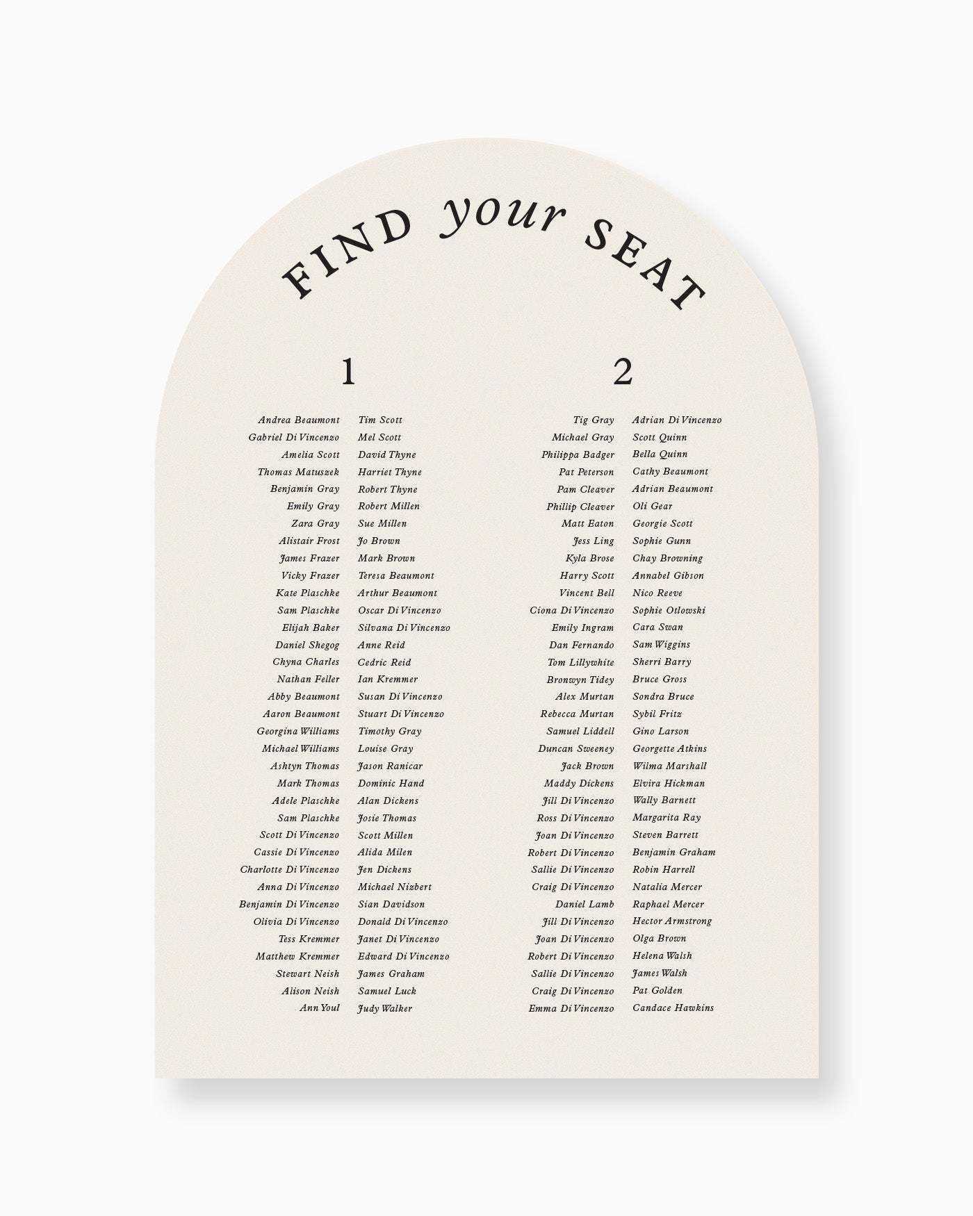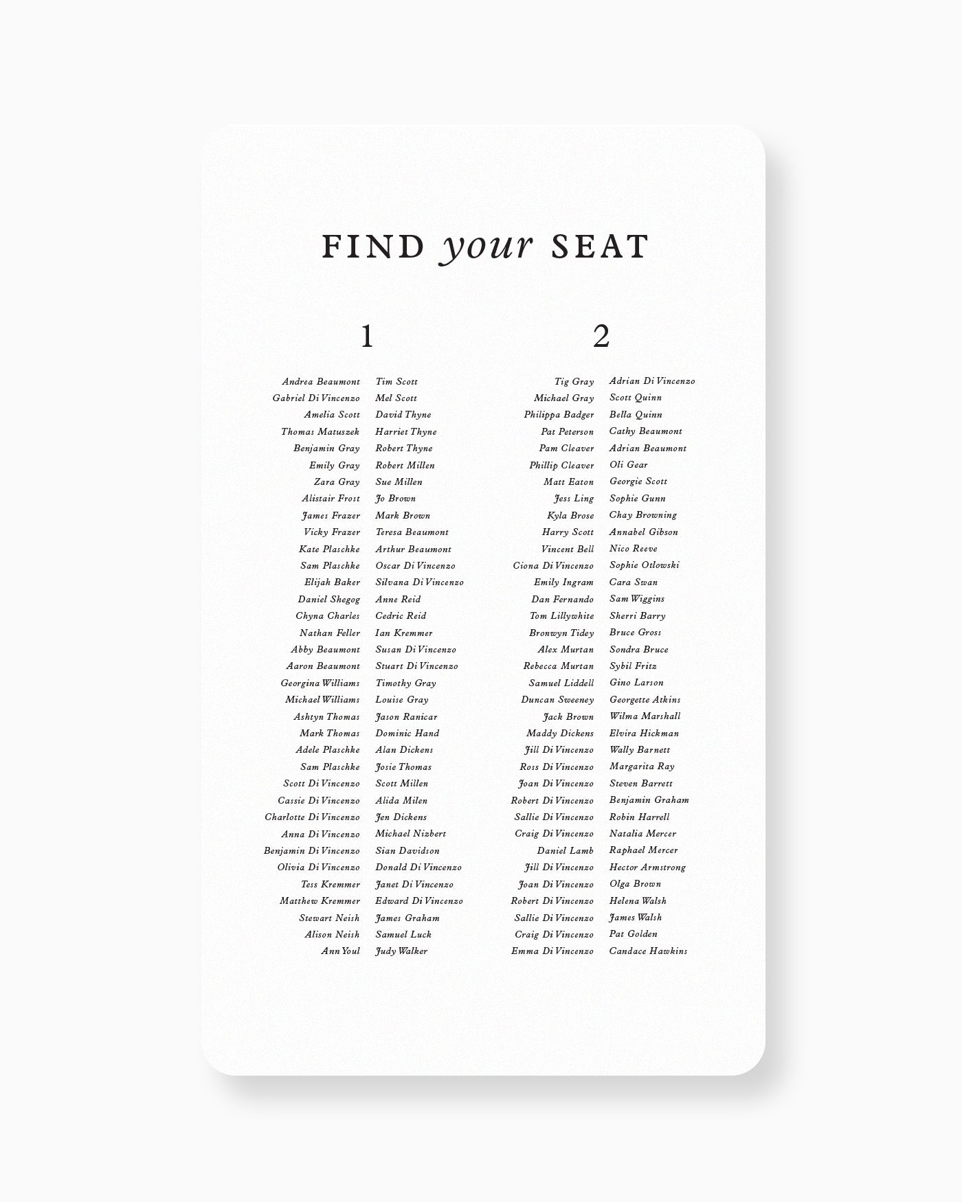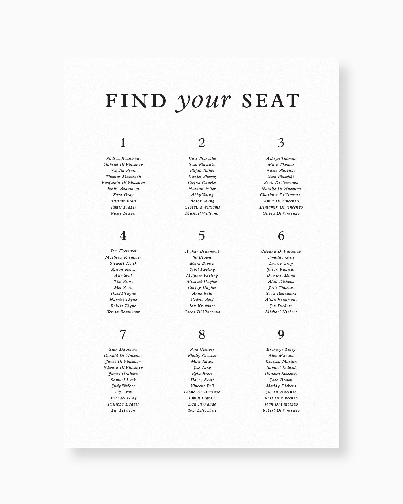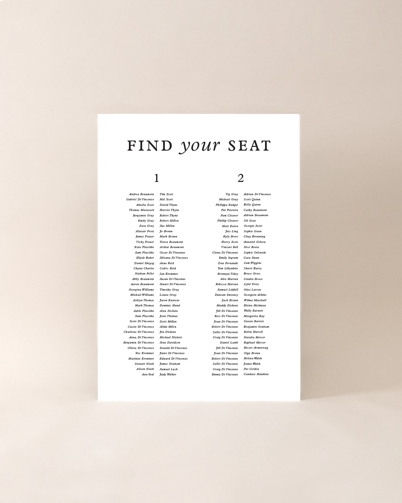 Your wedding seating chart offers you a chance to share your personal style, whilst also promoting seamlessness at your event. Our array of design collections - each including elegant fonts, calligraphy and decorative elements - can be customised to ensure that your seating chart not only serves a purpose, but stands out at your reception.