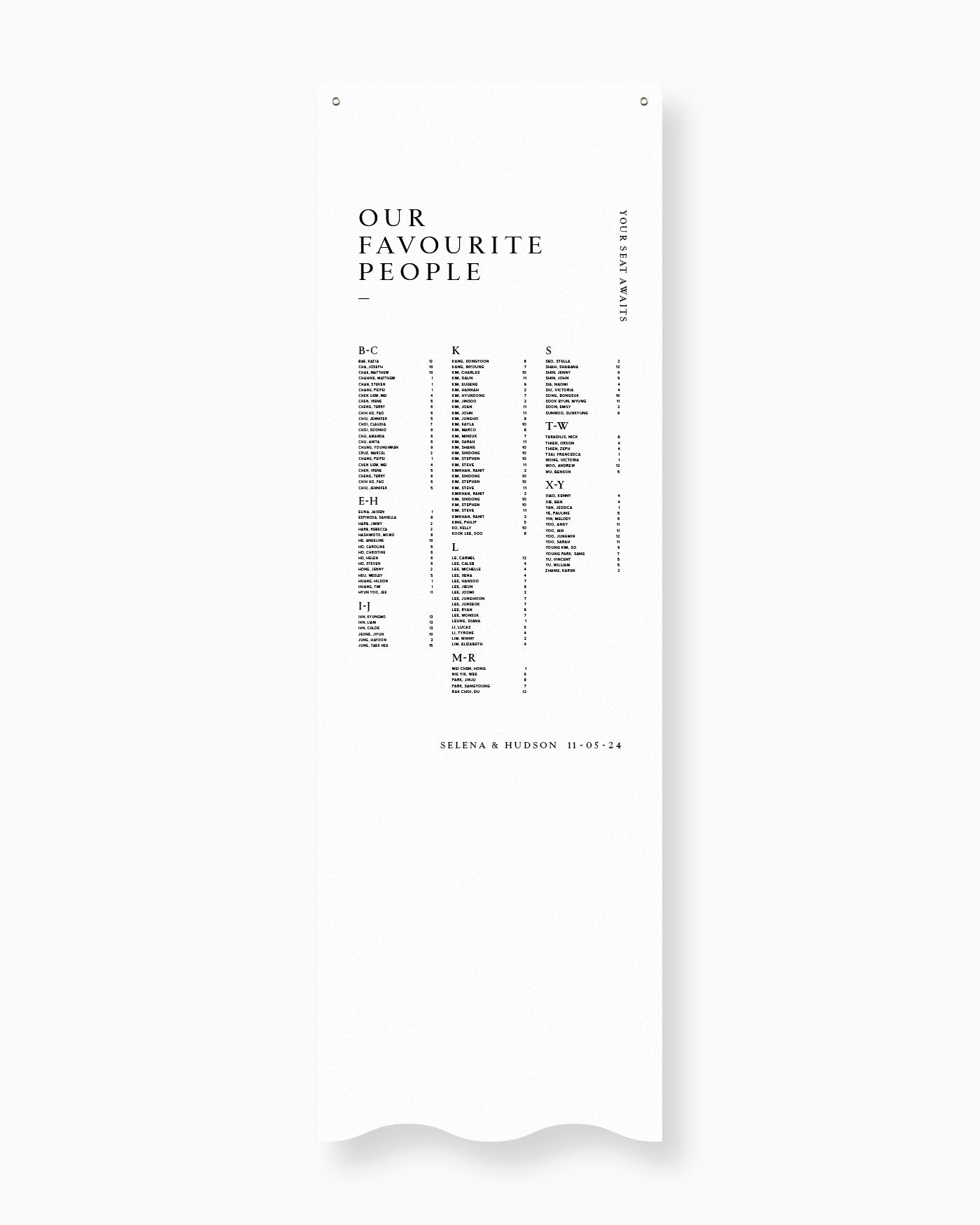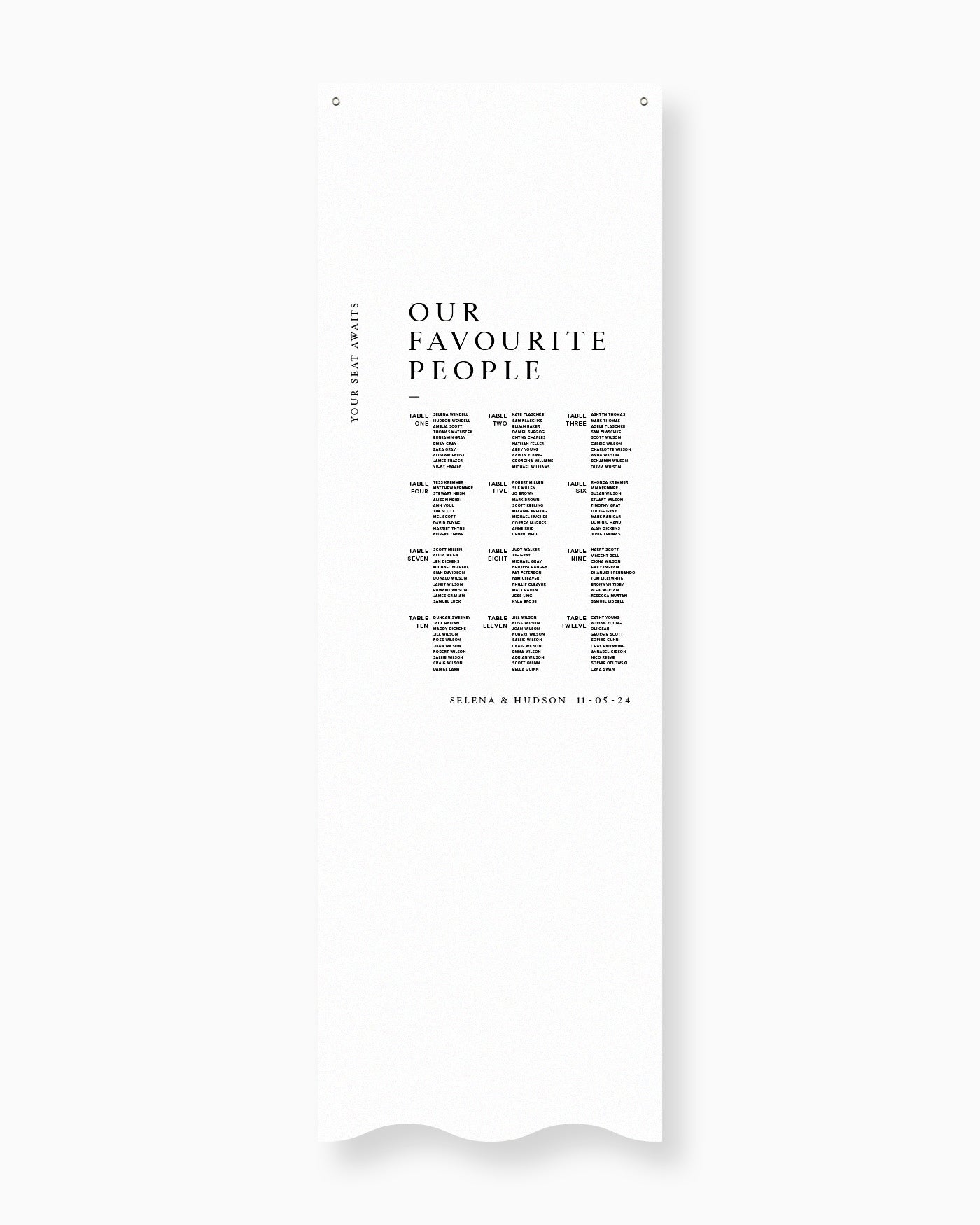 Introduce your guests to their seats with the Selena Fabric Seating Chart. With a choice of customisable layouts, this seating chart can fit any venue and table arrangement. The design is printed directly onto a premium linen blend.