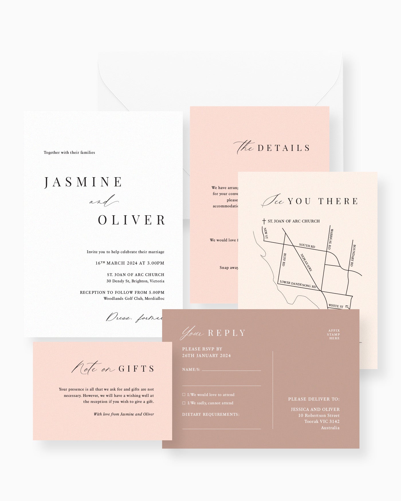 The Five Card Package includes the invitation with a premium white envelope, as well each of our four enclosure cards. These include: