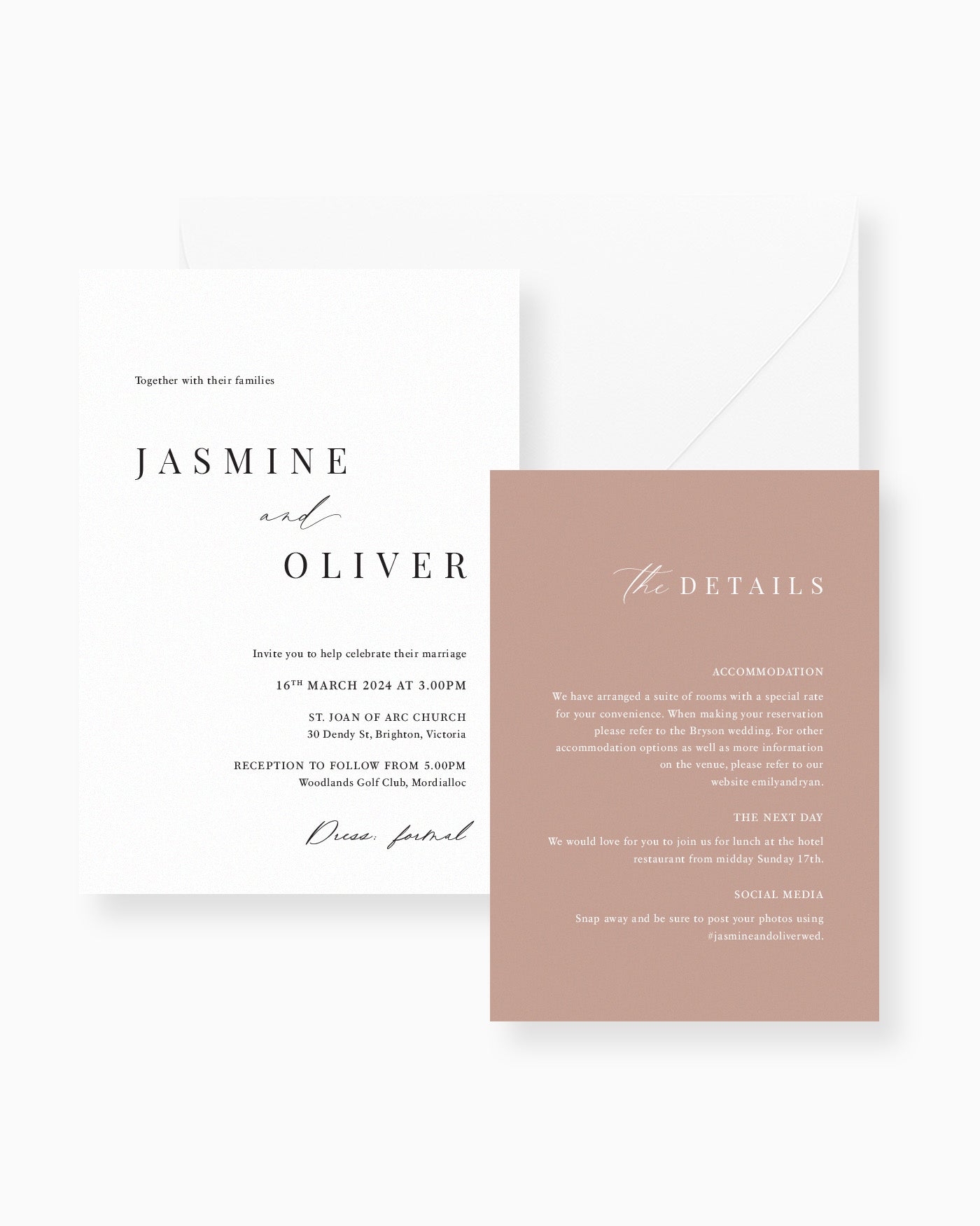 The two card package includes the Wedding Invitation with a premium white envelope, as well as one enclosure card. You can choose from the following cards during your design consultation after purchase:
