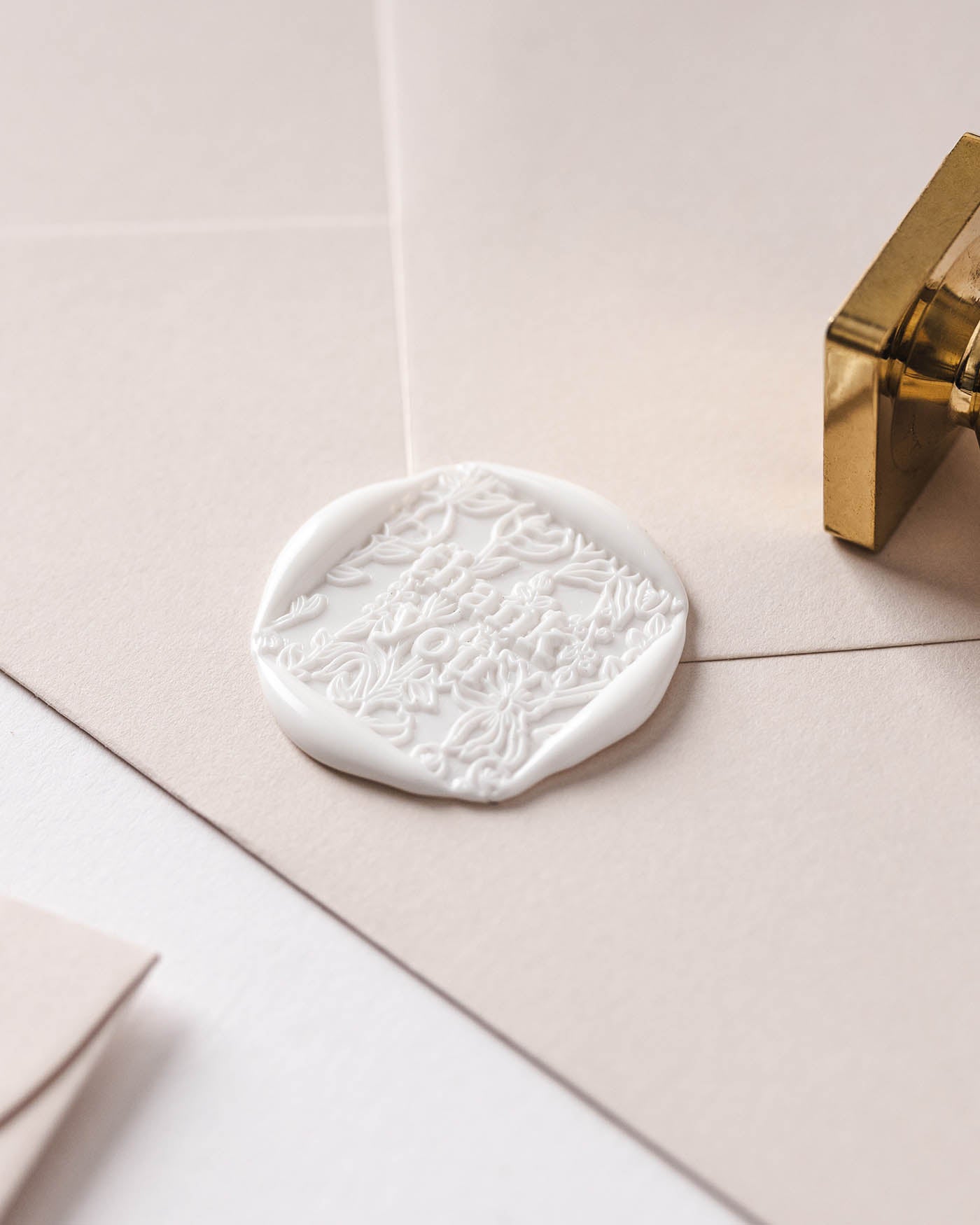 This wax stamp design features a classic typeface over an intricate mix of small flowers and delicate buds, perfect for adding a warm and personal touch to a range of greeting stationery, enhancing the sentiment of any message.