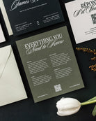 The Heritage Five Card Package includes the invitation with a premium white envelope, as well each of our four enclosure cards. These include: