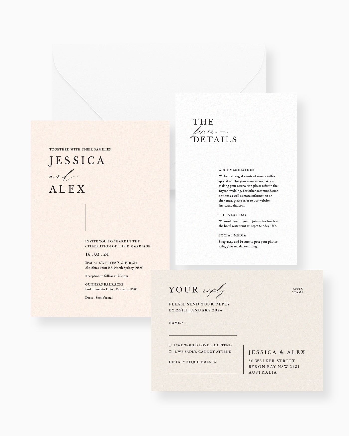 The Three Card Package includes the invitation with a premium white envelope, as well as choice of two enclosure cards. You can choose from the following cards during your design consultation after purchase: