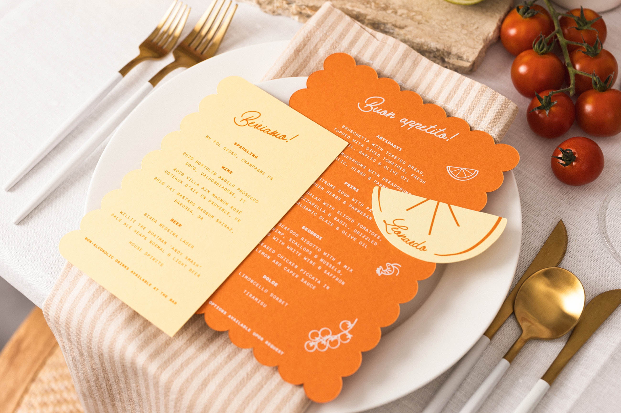 Make your event unique with pieces like our statement die cut folding menus, petal pockets, coasters and signage. Amalfi was shot in our Capri colour theme but is available in any of our gorgeous options.